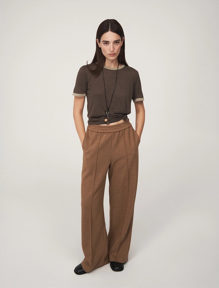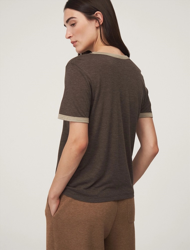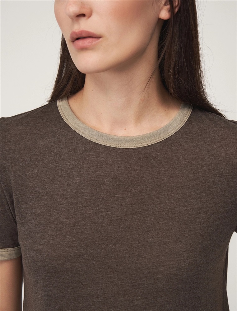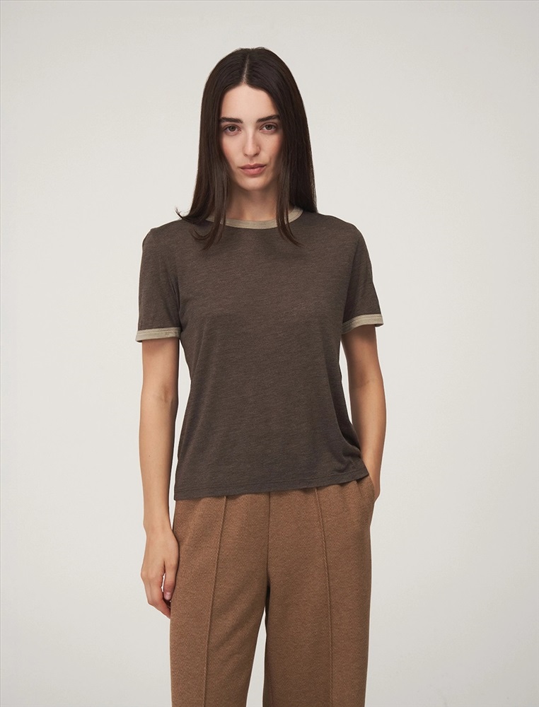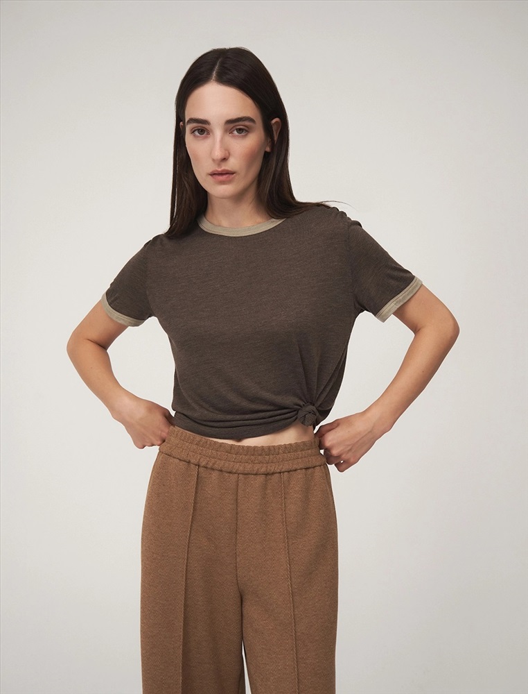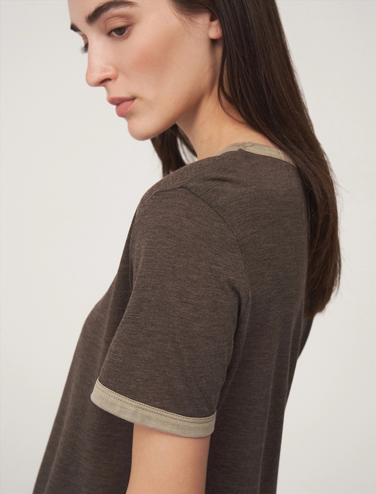 весна-лето 50% Хлопок, 30% Шерсть Мериноса, 15% Полиэстер, 5% Спандекс Футболка прямого силуэта с коротким рукавом и круглой горловиной. Выполнена из мягкой ткани, в составе которой шерсть мериноса. Горловина и низ рукавов обработаны контрастным кантом. Представлена в бежевом и сером цвете.