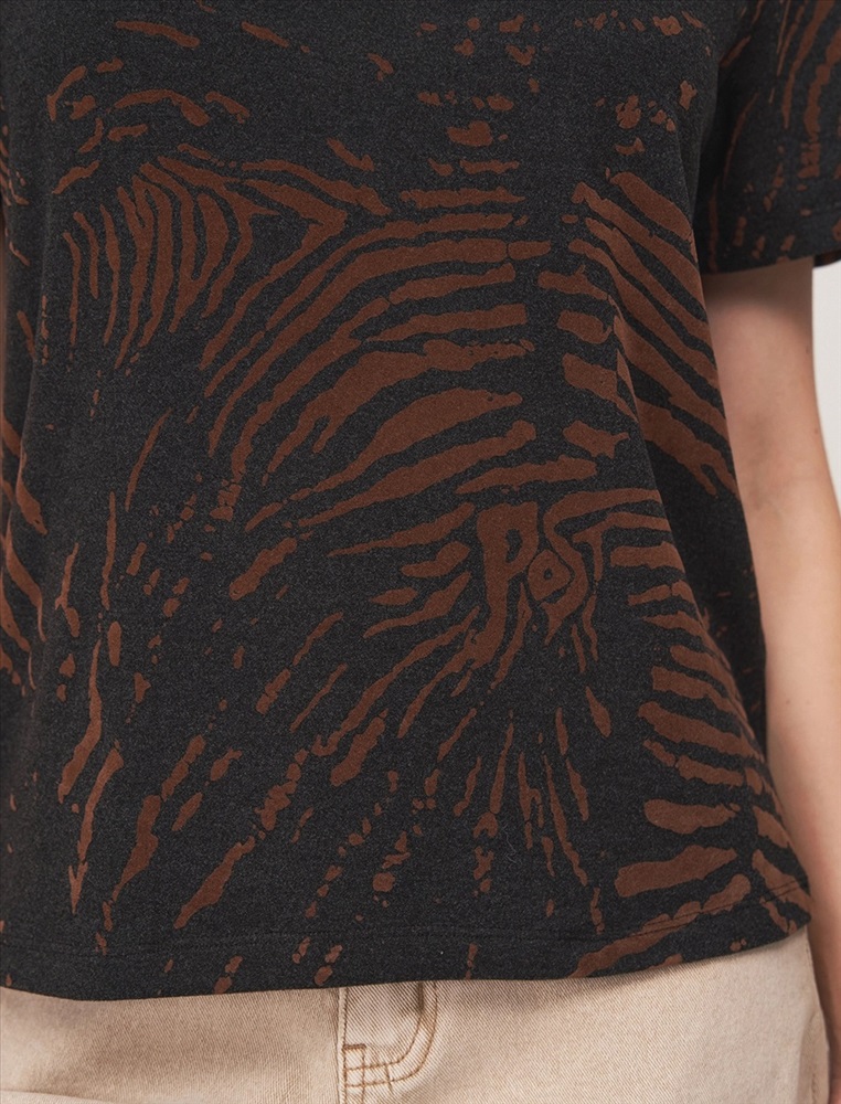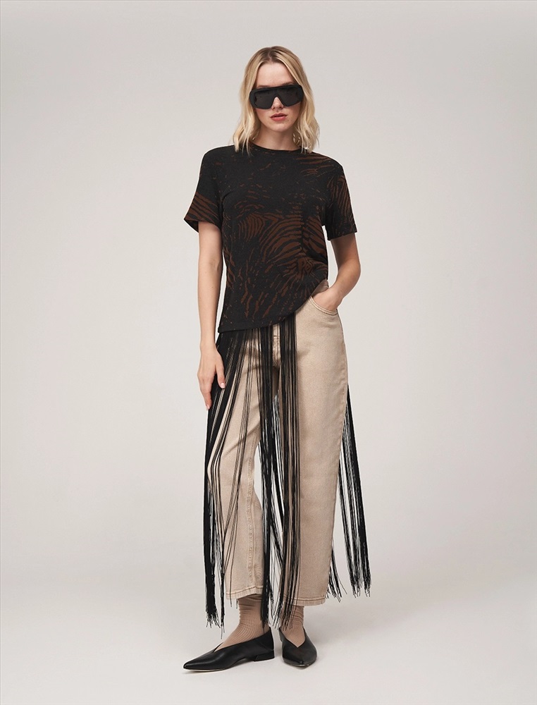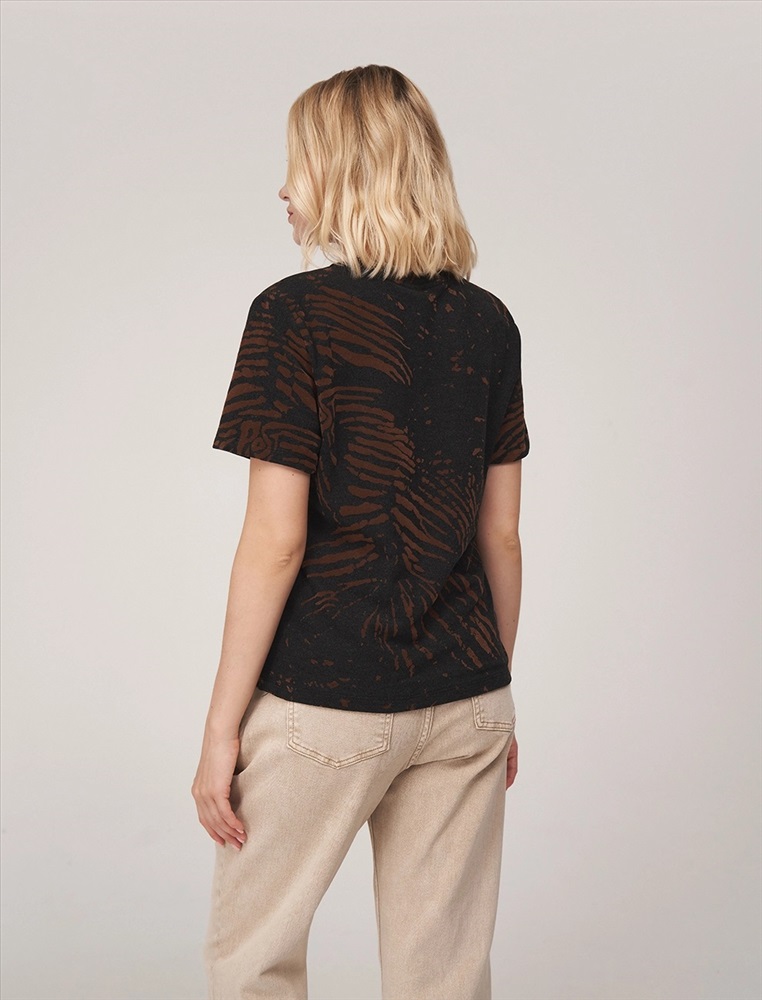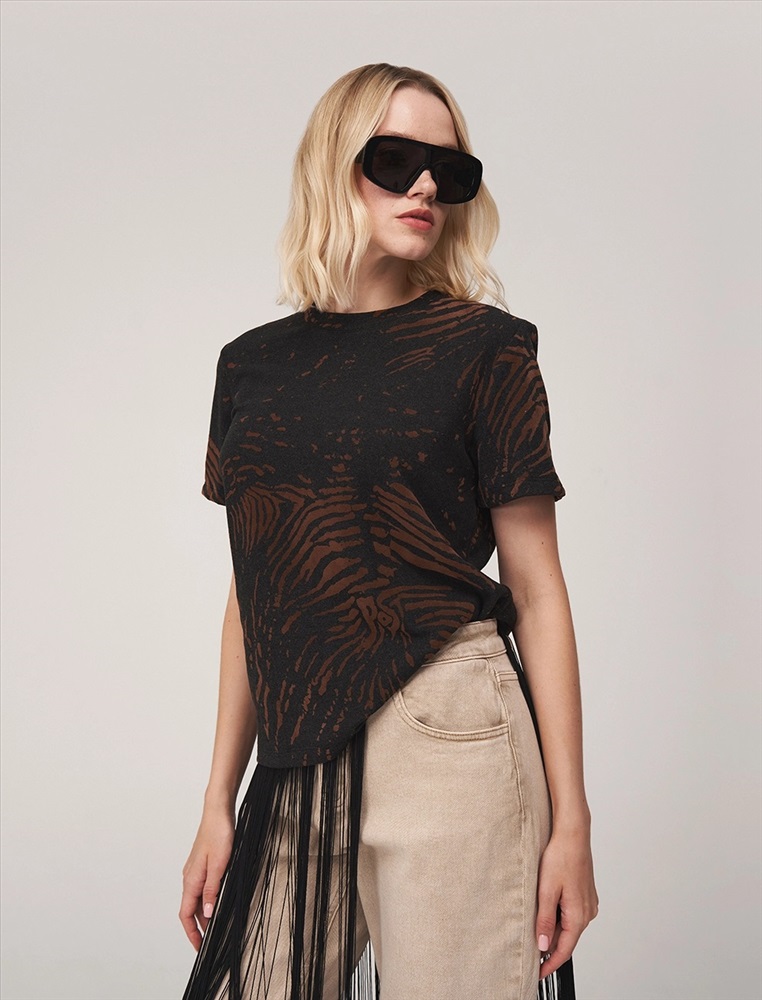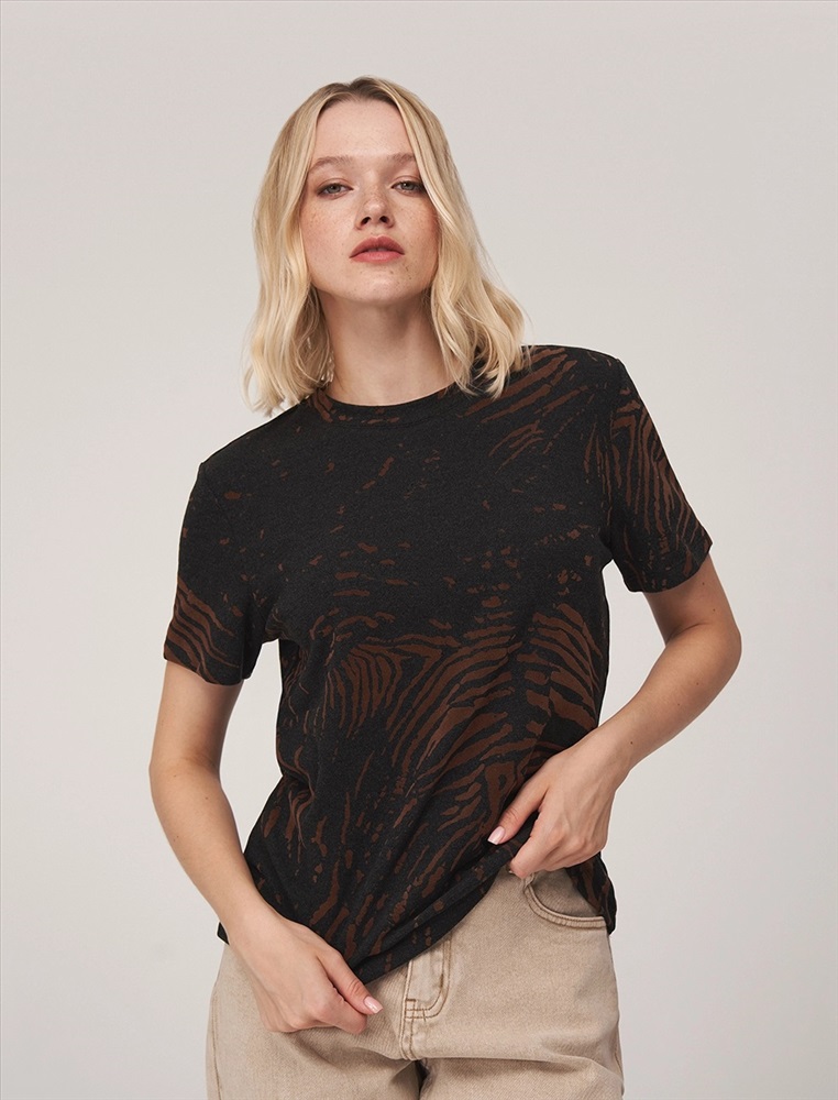 Видео: https-//hassfashion.ru/upload/iblock/bdd/jy9759krdtbwhvx6i44rzo5dmz9cl475.mp4 осень-зима 70% Хлопок, 25% Вискоза, 5% Спандекс Футболка прямого силуэта с регулярной горловиной. Акцентом изделия является анималистичный флоковый принт. Ткань – хлопок и вискоза с небольшим добавлением спан-декса, что продлевает срок эксплуатации изделия.