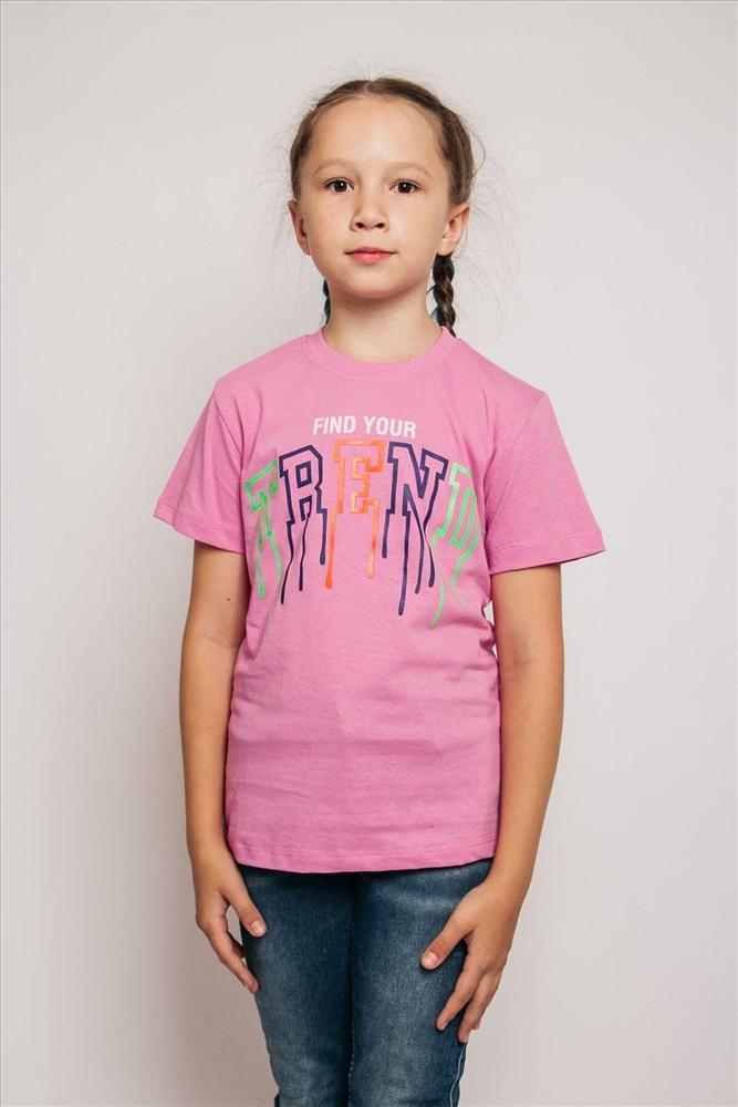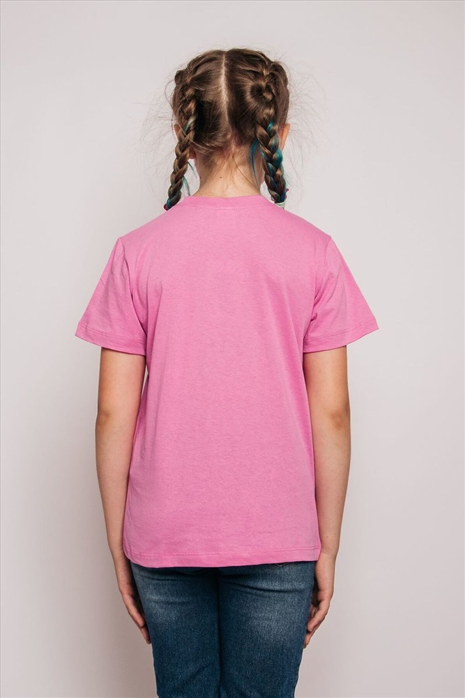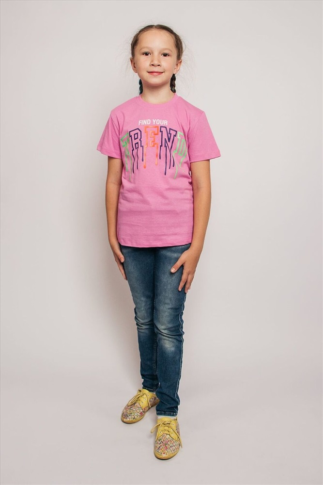 Страна производства: Россия Футболка для девочки прямого силуэта с втачным коротким рукавом. Горловина круглая, обработана воротником из кулирки. Низ изделия и рукавов обработан швом в подгибку. На полочке принт шелкография.