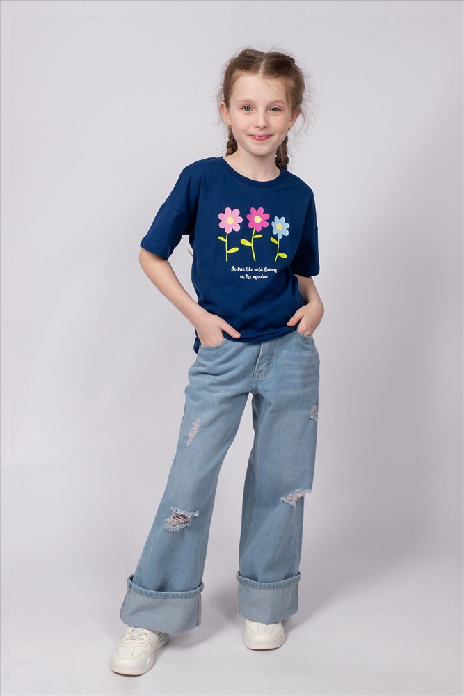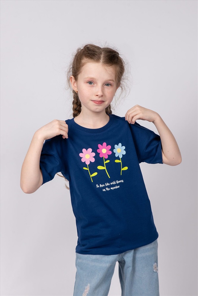 Футболка для девочки выполнена из 100% хлопка. Футболка для девочки прямого силуэта, со спущенным плечом, коротким рукавом. На полочке принт Шелкография. Надпись переводится как Будь свободной, как полевые цветы на лугу. Благодаря эластичной горловине, выполненной из рибаны, футболку удобно снимать и надевать. Футболка детская предназначена для повседневной носки, в детских садах, на уроках физкультуры, для занятий танцами и для дома. Материал не растягивается и не деформируется. Весь наш товар сертифицирован и полностью соответствует всем нормам и стандартам.