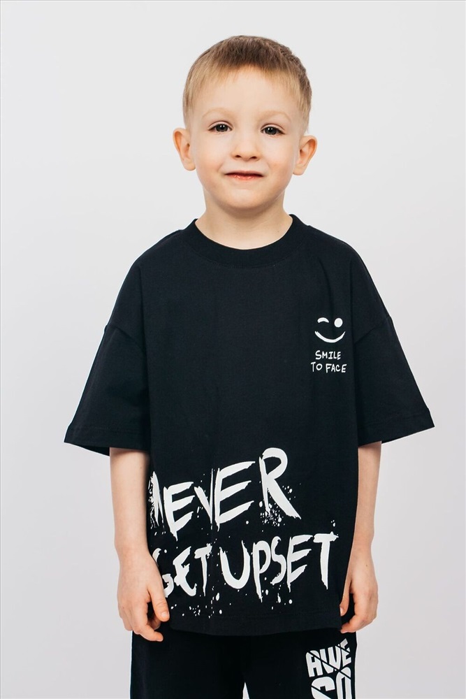 ID товара: 986749 Состав: 100% Хлопок Сезон: Весна/Лето Длина: Средняя Фасон: Свободный Рукав: короткие Вырез горловины: Округлый Рисунок: Надпись Декоративные элементы: Принт Основная ткань: Хлопок Стиль: повседневный Вид ткани: Кулирка Страна бренда: Россия Страна производства: Россия Футболка для мальчика выполнена из 100% хлопка. Футболка свободного силуэта (оверсайз) с коротким рукавом. Благодаря эластичной горловине, выполненной из рибаны, футболку удобно снимать и надевать. На полочке принт шелкография. Надпись переводится как Никогда не расстраивайся; Улыбнись в лицо. Материал не растягивается и не деформируется. Комментарии к товару