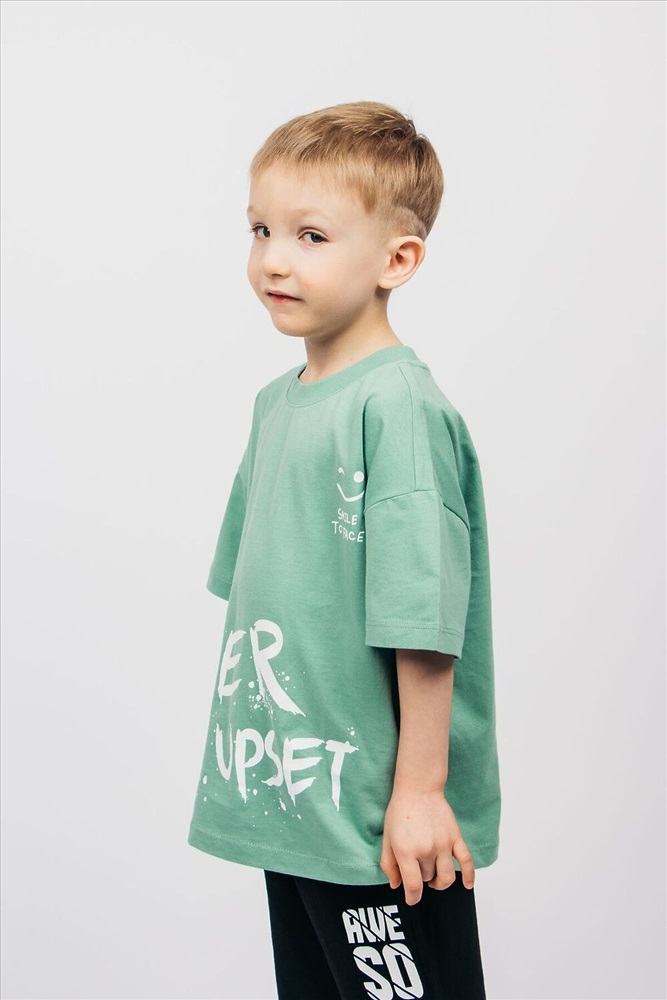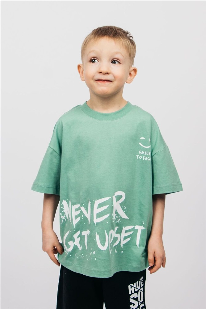 Страна производства: Россия Футболка для мальчика выполнена из 100% хлопка. Футболка свободного силуэта (оверсайз) с коротким рукавом. Благодаря эластичной горловине, выполненной из рибаны, футболку удобно снимать и надевать. На полочке принт шелкография. Надпись переводится как Никогда не расстраивайся; Улыбнись в лицо. Материал не растягивается и не деформируется.