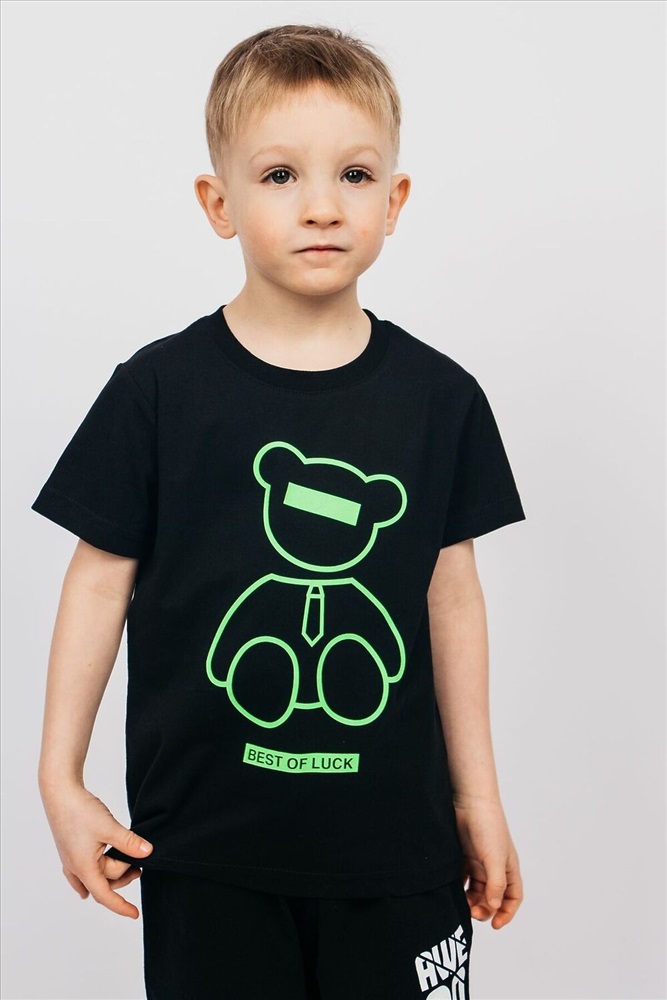 Футболка для мальчика выполнена из 100% хлопка. Футболка прямого силуэта, с втачным коротким рукавом. Благодаря эластичной горловине, выполненной из рибаны, футболку удобно снимать и надевать. На полочке принт Шелкография с неоновыми красками. Надпись переводится как Желаю удачи. Материал не растягивается и не деформируется.