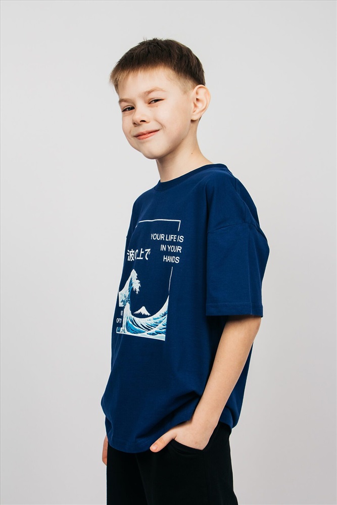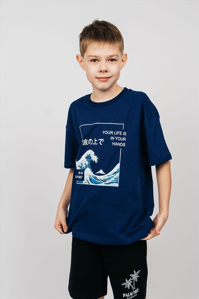 Футболка для мальчика выполнена из 100% хлопка. Футболка свободного силуэта (оверсайз) с коротким рукавом. Благодаря эластичной горловине, выполненной из рибаны, футболку удобно снимать и надевать. На полочке принт шелкография. Надпись переводится как На волне; Твоя жизнь в твоих руках; Будь оптимистом. Материал не растягивается и не деформируется.