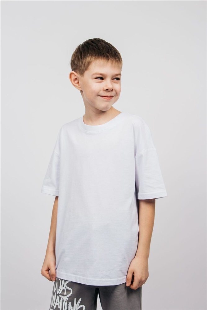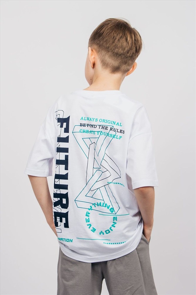 Футболка для мальчика выполнена из 100% хлопка. Футболка свободного силуэта (оверсайз) с коротким рукавом. Благодаря эластичной горловине, выполненной из рибаны, футболку удобно снимать и надевать. На спинке принт шелкография. Надпись переводится как Будущее поколение; Всегда оригинальный; За пределами правил; Создай себя; Воображение; Наслаждайся всем. Материал не растягивается и не деформируется.