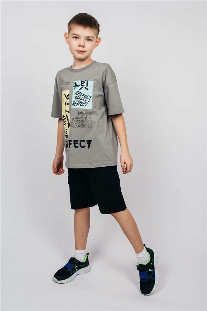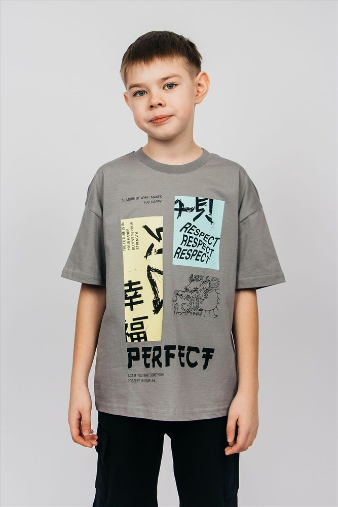 Футболка для мальчика выполнена из 100% хлопка. Футболка свободного силуэта (оверсайз) с коротким рукавом. Благодаря эластичной горловине, выполненной из рибаны, футболку удобно снимать и надевать. На полочке принт шелкография. Надпись переводится как Делай больше то, что делает тебя счастливым; Будущее в твоих руках; Верь в свою силу; Уважение; Идеальный; Действуй, если ты хочешь что бы в твоей жизни что-то присутствовало. Материал не растягивается и не деформируется.