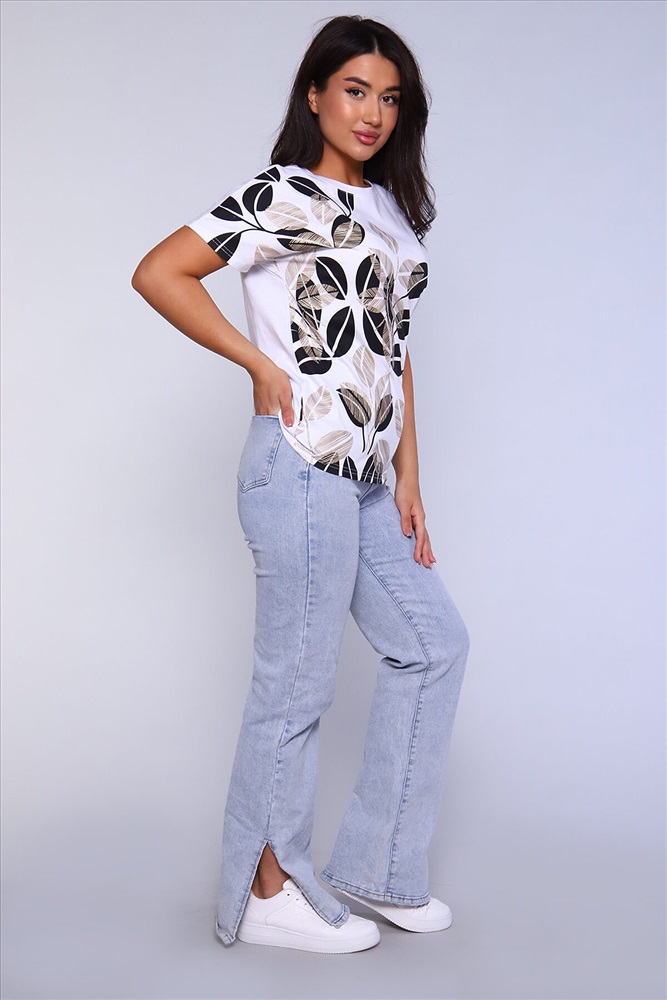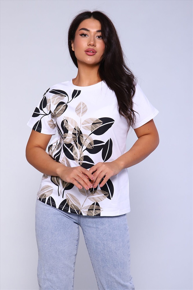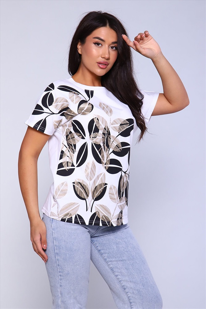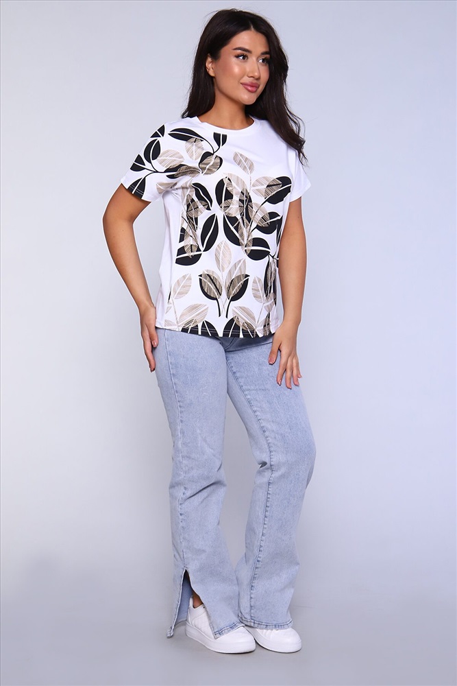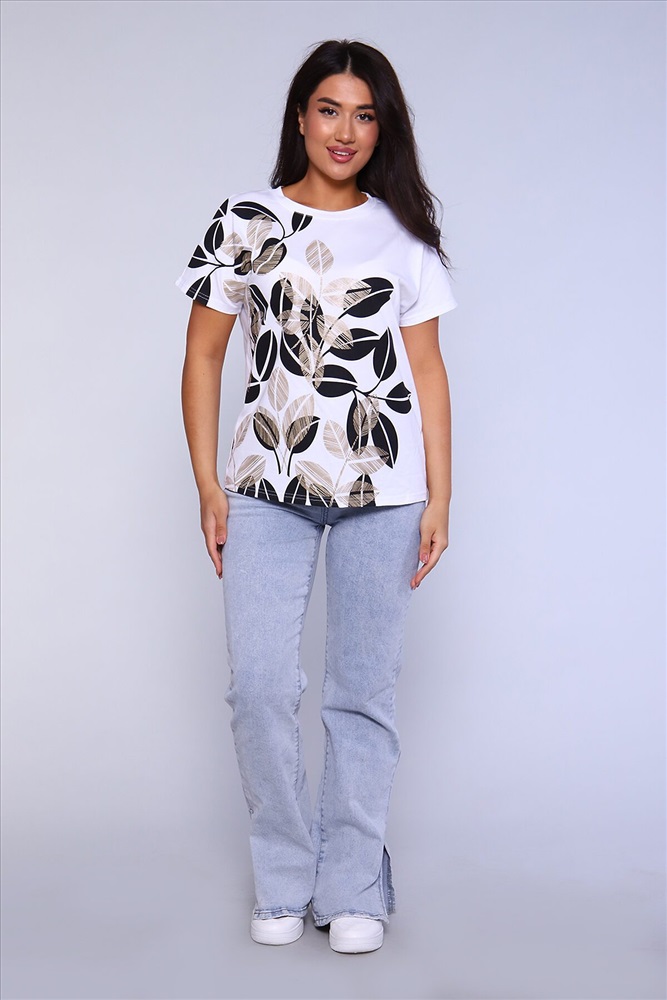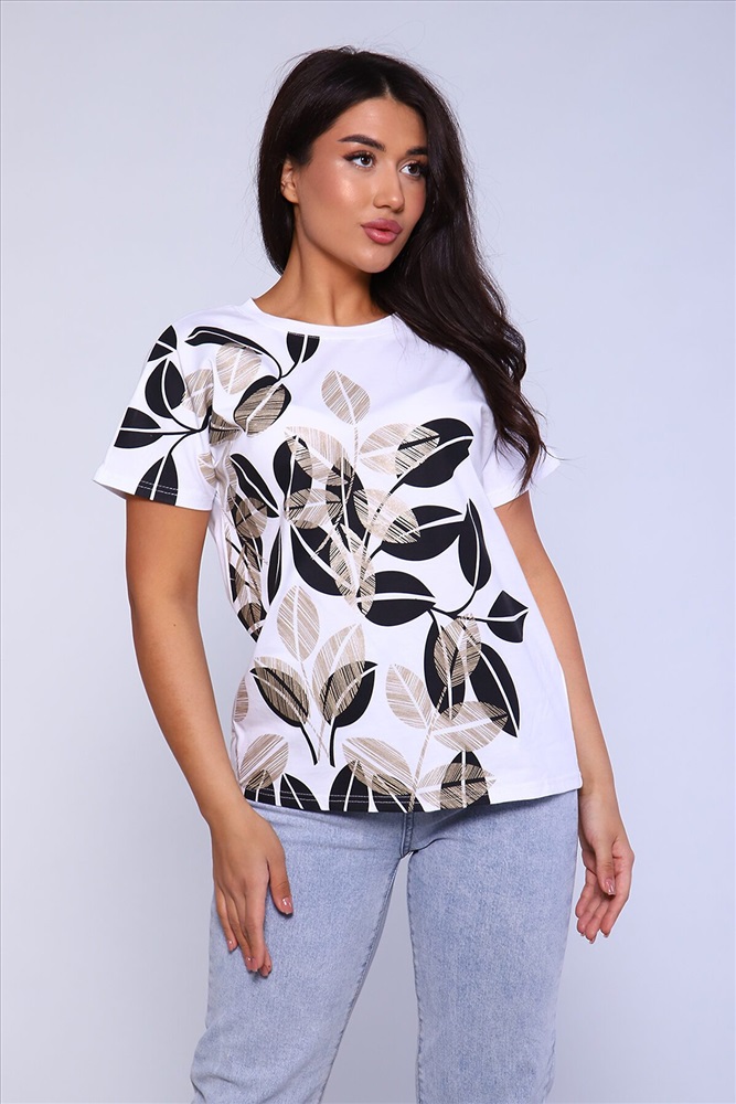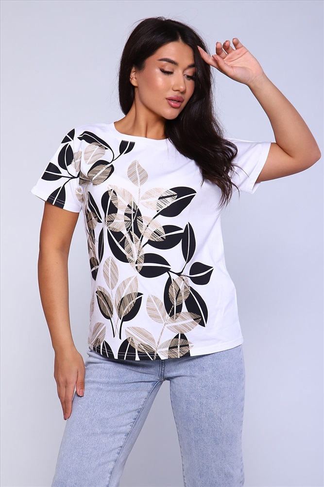 ID товара: 891989 Состав: 100% Хлопок Сезон: Весна/Лето Длина: Средняя Фасон: Прямой Рукав: короткие Вырез горловины: Округлый Рисунок: растительный Основная ткань: Хлопок Стиль: Повседневный Вид ткани: Кулирка Страна бренда: Россия Страна производства: Россия Женская футболка с отличной посадкой, правильной длины, спущенный рукав. Универсальная модель футболки отлично подойдет для любого образа и станет необходимой вещью в вашем гардеробе. Посадка свободная не сковывает движений. Футболка выполнена из мягкого трикотажного полотна, средней плотности, очень приятная к телу. Комментарии к товару