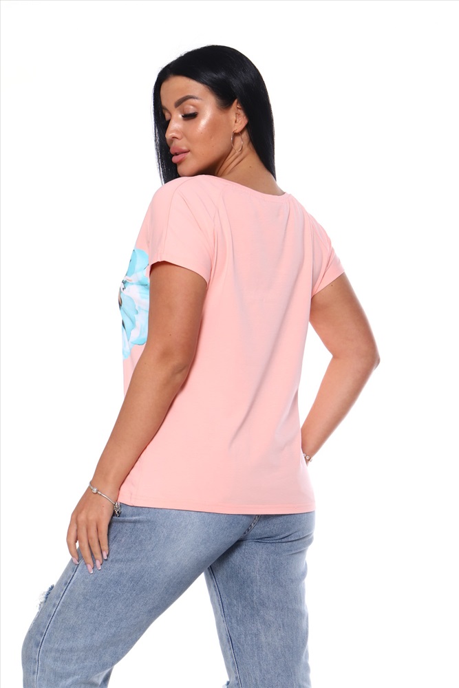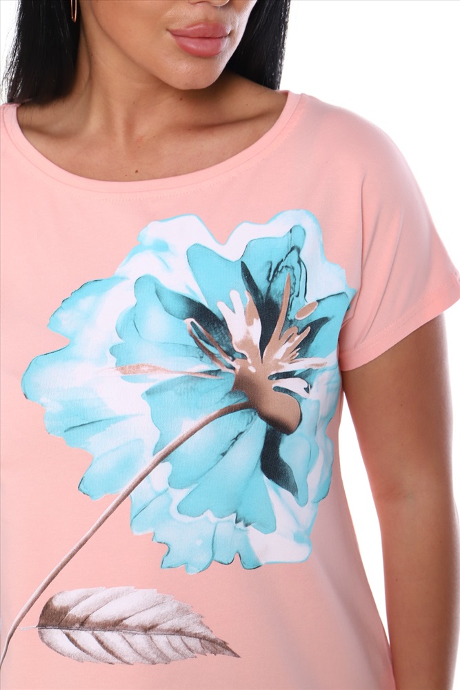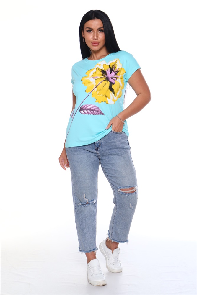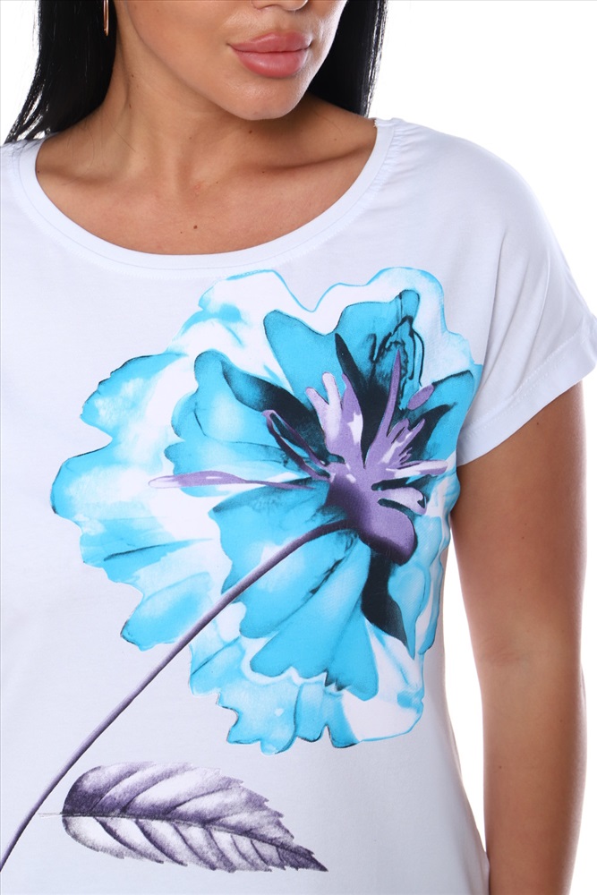 Стиль: повседневный Футболка женская свободного силуэта, с цельнокроеным спущенным рукавом. Спинка оформлена рельефами. Длина изделия до середины бедра. Полочка декорирована принтом в виде цветка. Идеально подходит к брюкам или юбке
