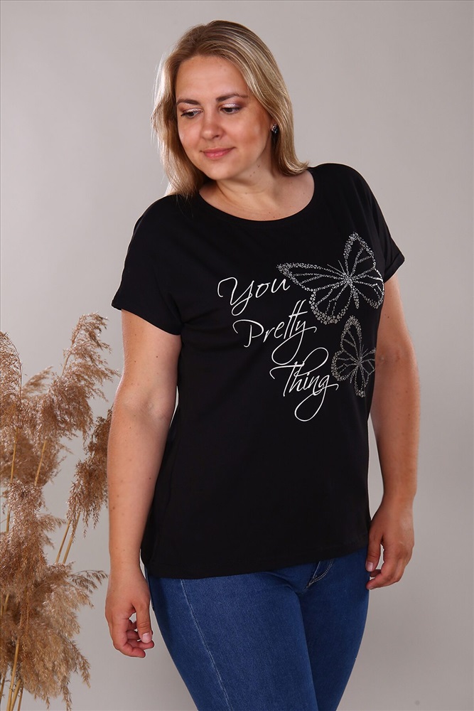 ID товара: 718005 Состав: 95% Хлопок, 5% Лайкра Сезон: Весна/Лето Длина: Средняя Фасон: Свободный крой Рукав: Короткие Вид застежки: Без застежки Вырез горловины: Круглый Рисунок: бабочки Декоративные элементы: Печатный принт Основная ткань: Хлопок | Кулирка Стиль: Повседневный Страна бренда: Россия Страна производства: Россия Футболка женская 48-60 свободного силуэта, с цельнокроенным спущенным рукавом. Спинка оформлена рельефами. Длина изделия до середины бедра. Полочка декорирована принтом в виде бабочки. Идеально подходит для гардероба с юбкой, так же с брюками. Комментарии к товару