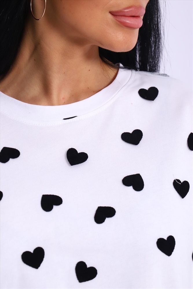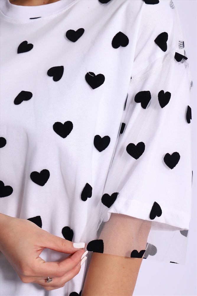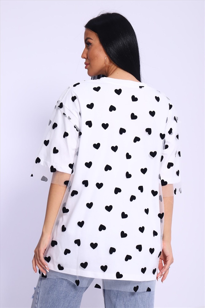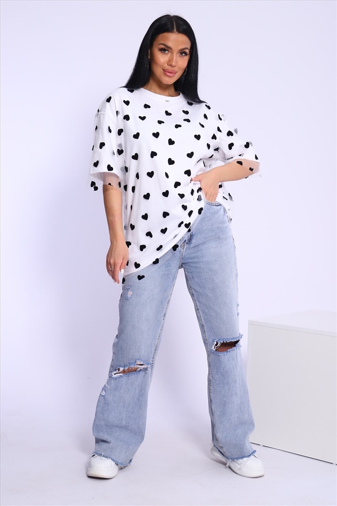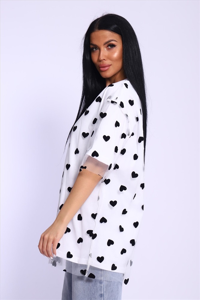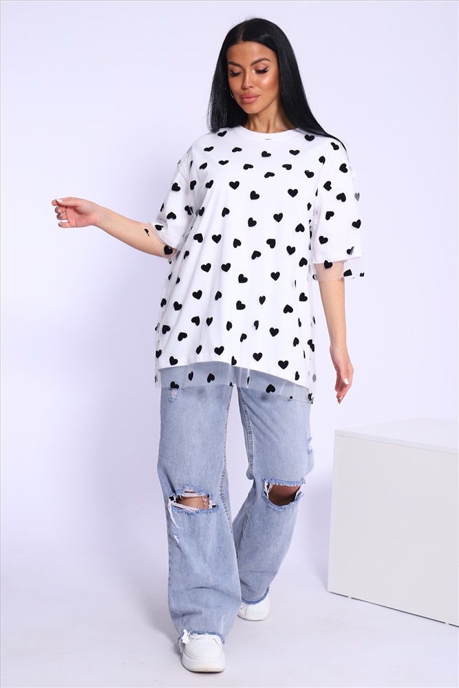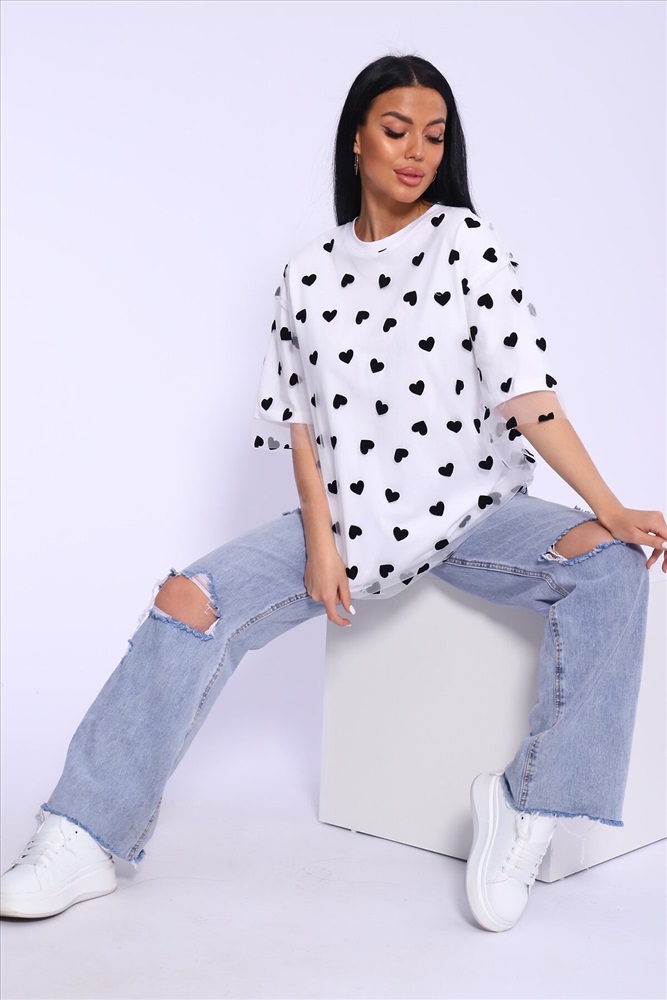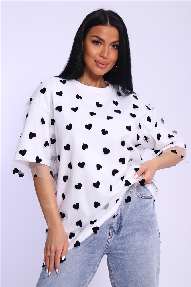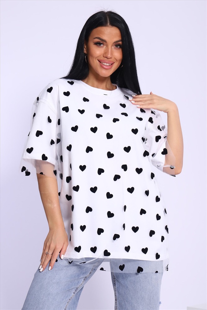 ID товара: 999092 Состав: 100% Хлопок Сезон: Весна/Лето Фасон: Оверсайз Рукав: До локтя Вырез горловины: Круглый Рисунок: Сердечки Декоративные элементы: Сетка Вид ткани: Кулирка Страна бренда: Россия Страна производства: Китай Футболка женская oversize с сердечками. Футболка с сеточкой имеет свободную посадку. Популярный широкий крой и свободный стиль делают футболку удобной и универсальной. Футболку можно сочетать с любым образом. Прямой силуэт идеально подходит на каждый день. Рукав спущенный и не сковывает движения. Длина рукава указана от плечевого шва. Производство Китай. Комментарии к товару