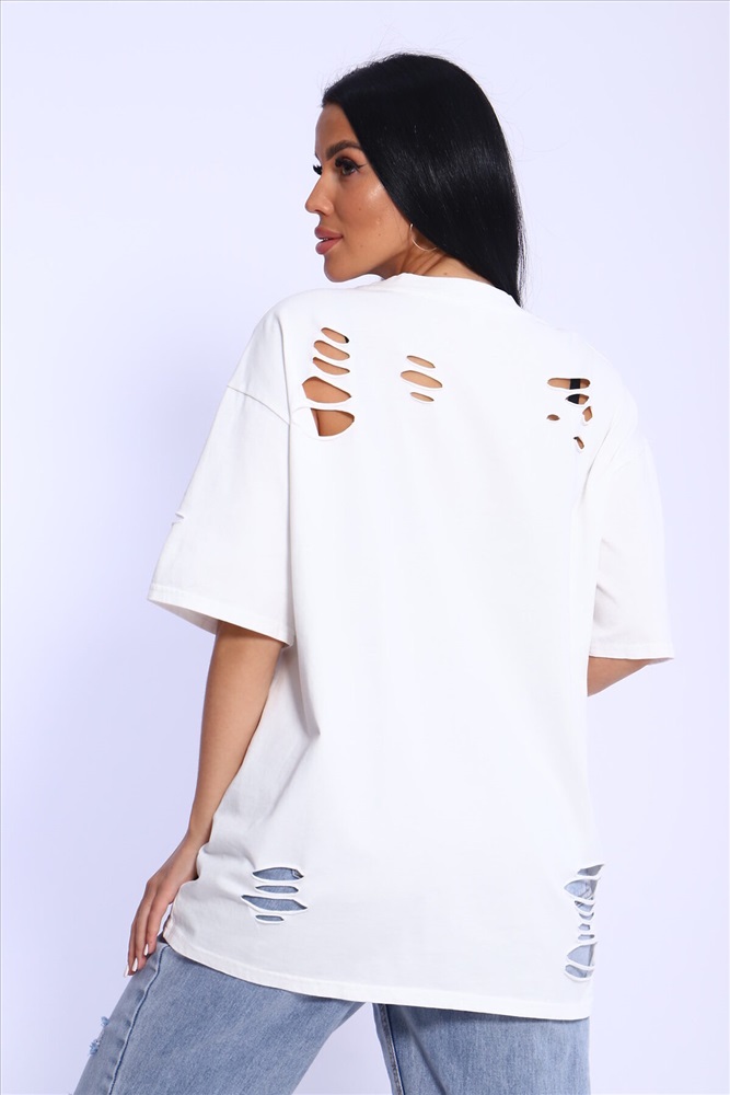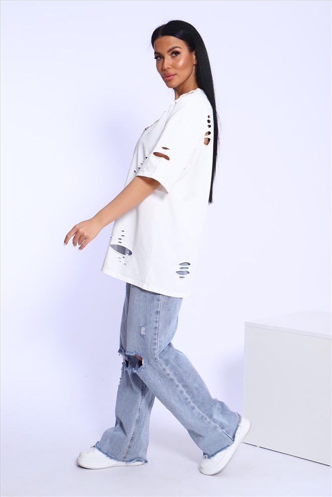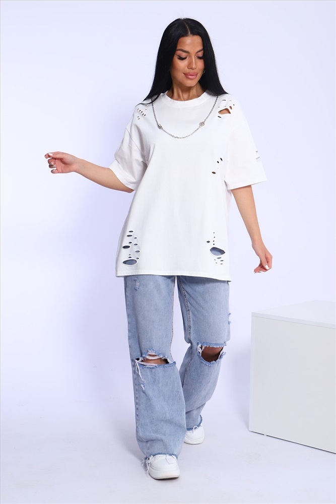 ID товара: 999087 Состав: 100% Хлопок Сезон: Весна/Лето Фасон: Оверсайз Рукав: До локтя Вырез горловины: Круглый Вид ткани: Кулирка пенье Страна бренда: Россия Страна производства: Китай Рваная женская футболка с отстегивающейся цепочкой. Изготовлена из хлопка, очень плотная и не просвечивает.Oversize подходит всем типам фигур. Свободная посадка и прямой крой дает возможность носить футболку на выпуск или заправлять. Футболка отлично подойдёт для создания повседневных образов. Дырки расположены на рукавах, плечах, спереди и сзади. Футболка будет прекрасно сочетаться и с джинсами, и с юбкой. Рукав спущенный и не сковывает движения. Длина рукава указана от плечевого шва. Производство Китай. Комментарии к товару