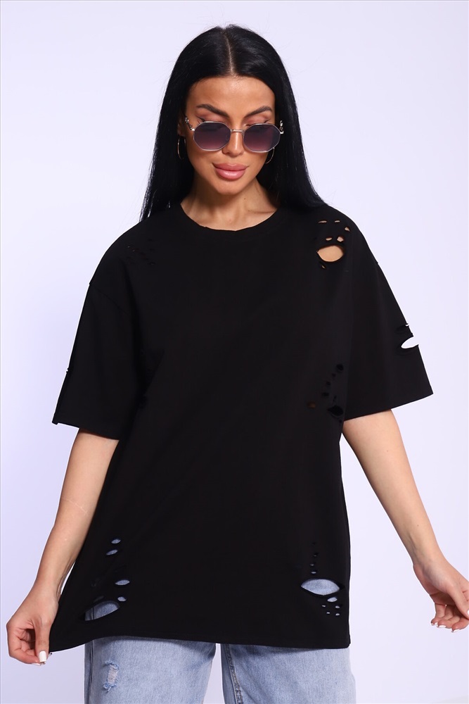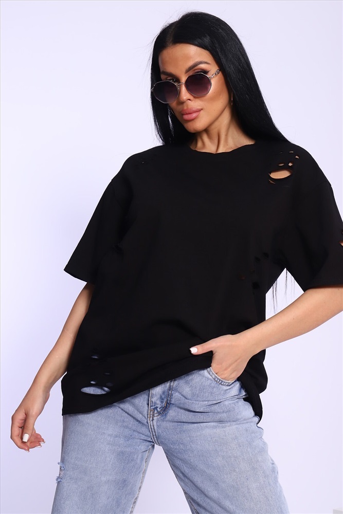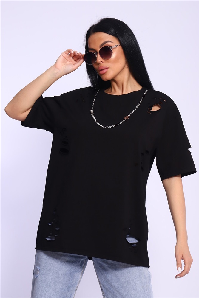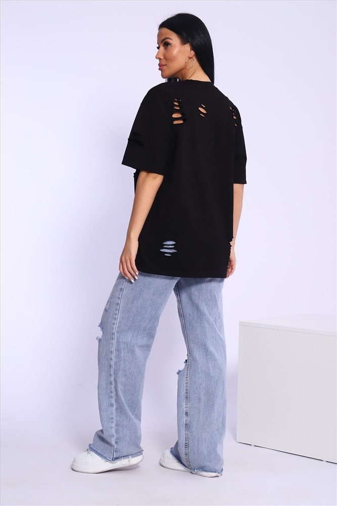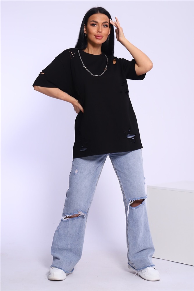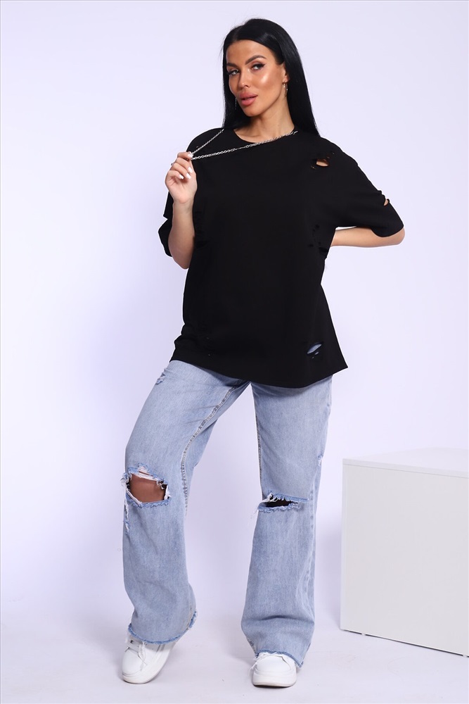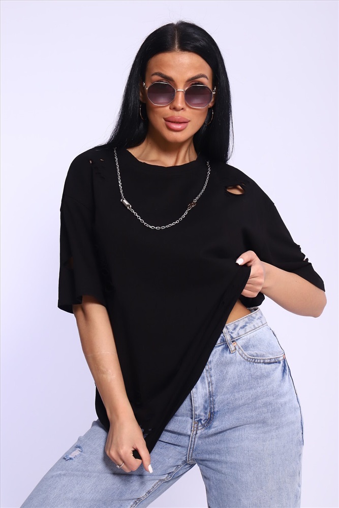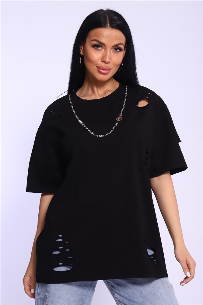 ID товара: 999088 Состав: 100% Хлопок Сезон: Весна/Лето Фасон: Оверсайз Рукав: До локтя Вырез горловины: Круглый Вид ткани: Кулирка пенье Страна бренда: Россия Страна производства: Китай Рваная женская футболка с отстегивающейся цепочкой. Изготовлена из хлопка, очень плотная и не просвечивает.Oversize подходит всем типам фигур. Свободная посадка и прямой крой дает возможность носить футболку на выпуск или заправлять. Футболка отлично подойдёт для создания повседневных образов. Дырки расположены на рукавах, плечах, спереди и сзади. Футболка будет прекрасно сочетаться и с джинсами, и с юбкой. Рукав спущенный и не сковывает движения. Длина рукава указана от плечевого шва. Производство Китай. Комментарии к товару