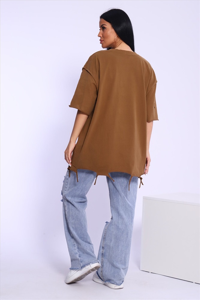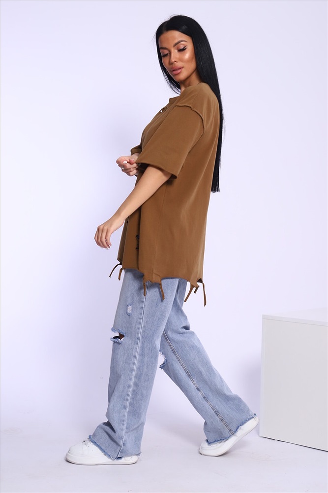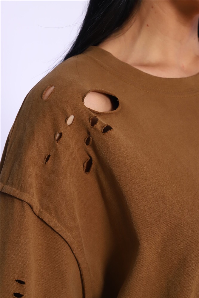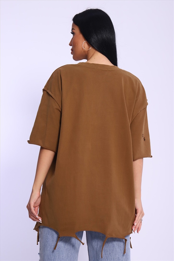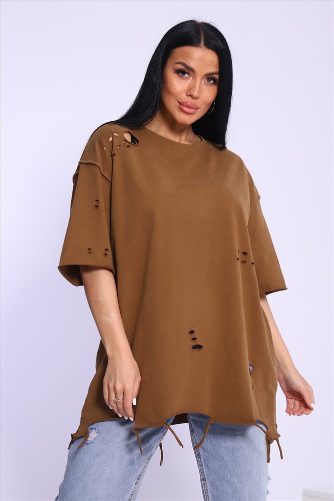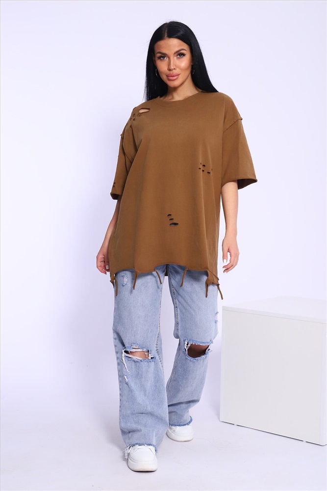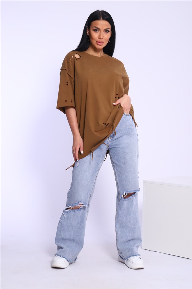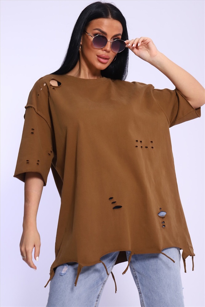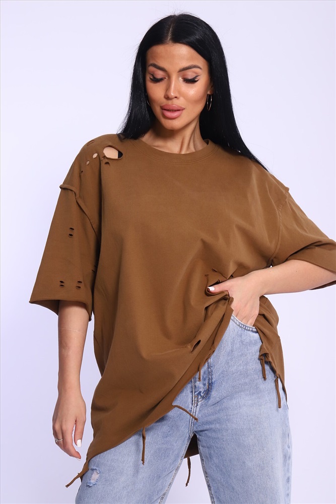 Страна производства: Китай Рваная женская футболка. Oversize подходит всем типам фигур. Изготовлена из хлопка, очень плотная и не просвечивает. Свободная посадка и прямой крой. Длинная хлопковая футболка отлично подойдёт для создания повседневных образов. Дырки расположены на рукавах, плечах и спереди. Рукав спущенный и не сковывает движения. Длина рукава указана от плечевого шва. Производство Китай.