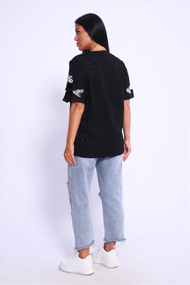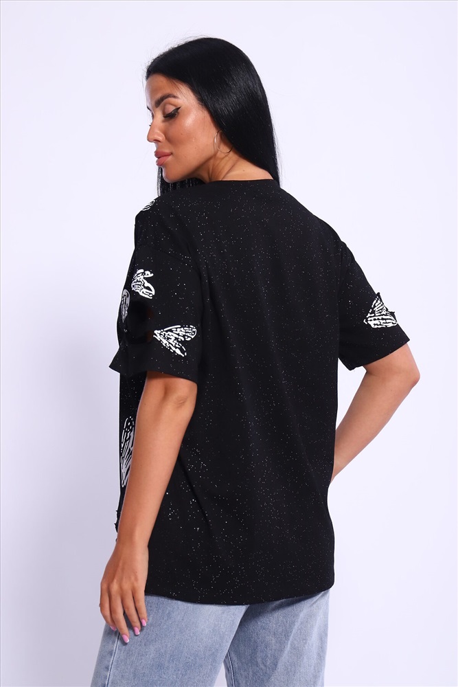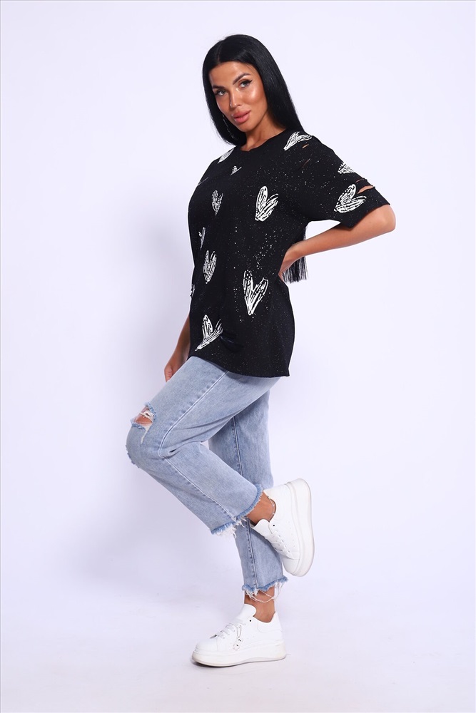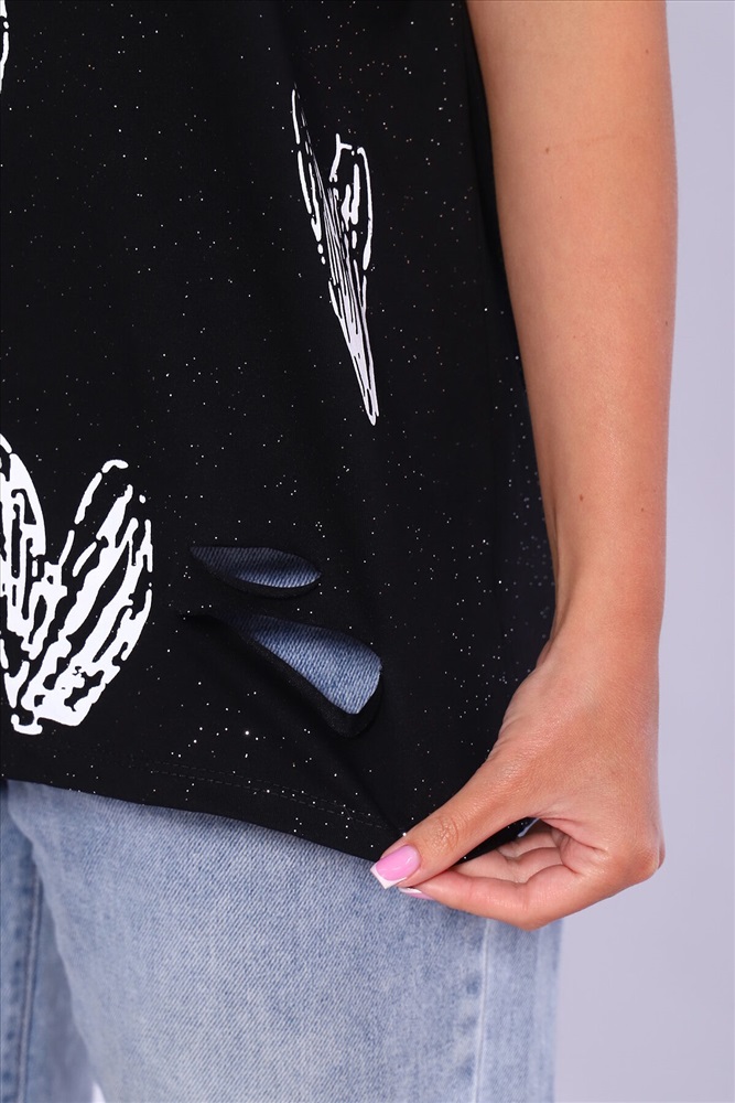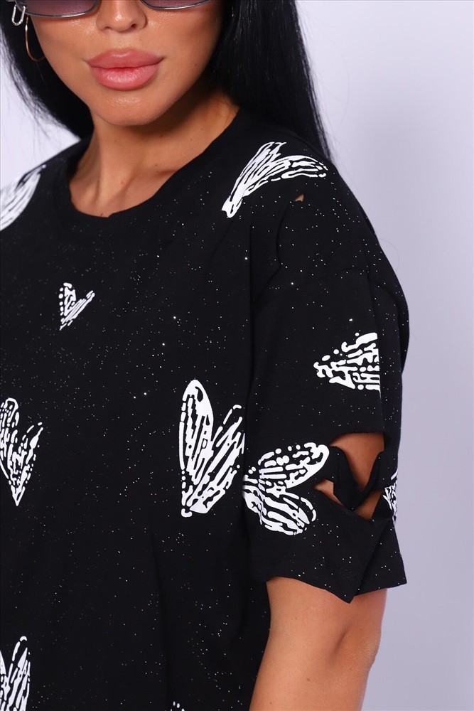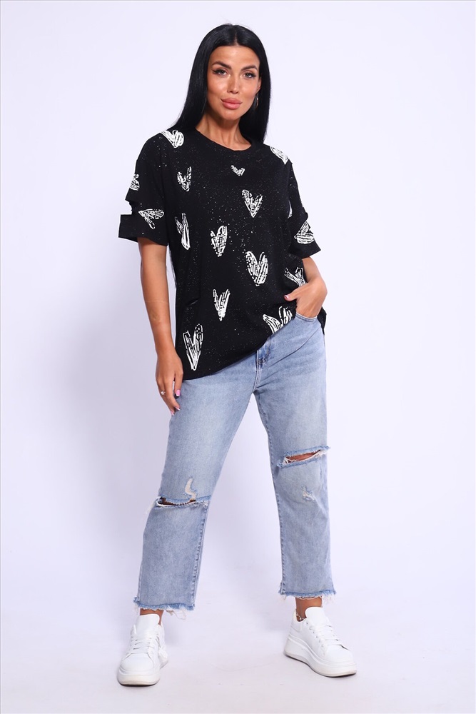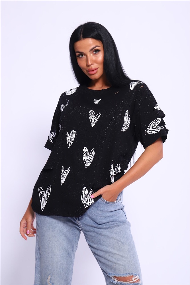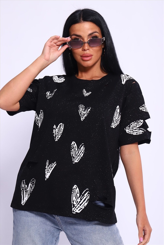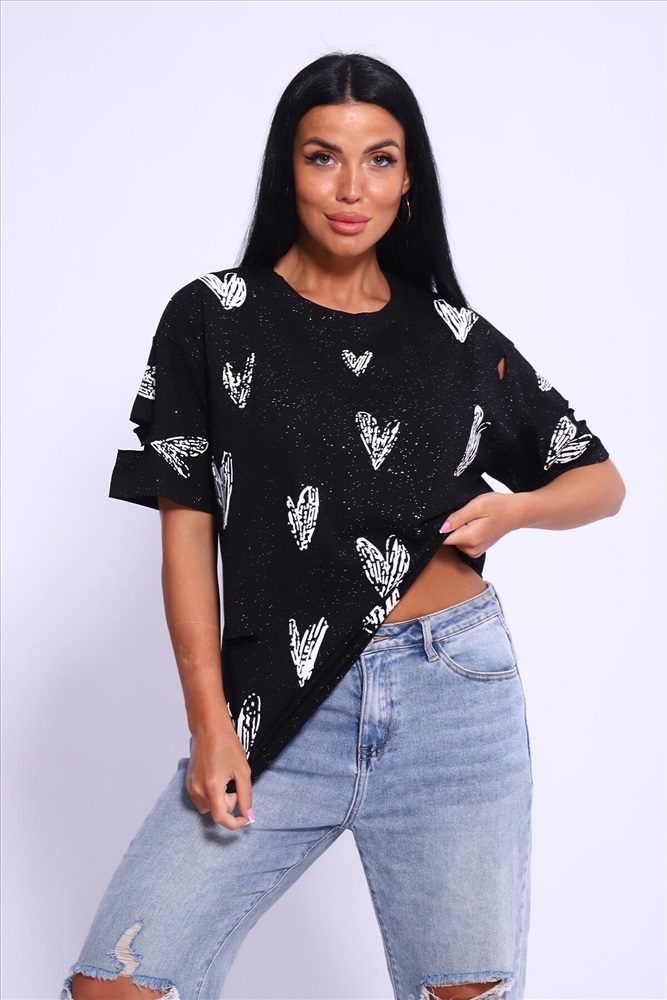 Страна производства: Россия Рваная женская футболка. Oversize подходит всем типам фигур. Изготовлена из хлопка, плотная и не просвечивает. На ткани имеется принт в виде сердечек. Дырки расположены на рукавах и спереди. На ткани имеются небольшие блестки, которые очень красиво мерцают на солнце. Свободная посадка и прямой крой. Длинная хлопковая футболка отлично подойдёт для создания повседневных образов. Рукав спущенный и не сковывает движения. Длина рукава указана от плечевого шва. Производство Китай.