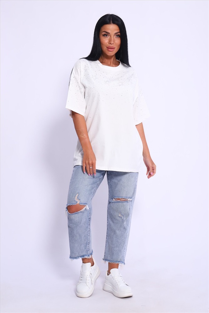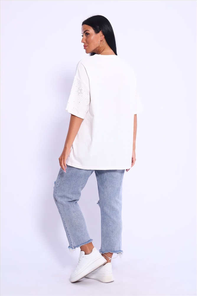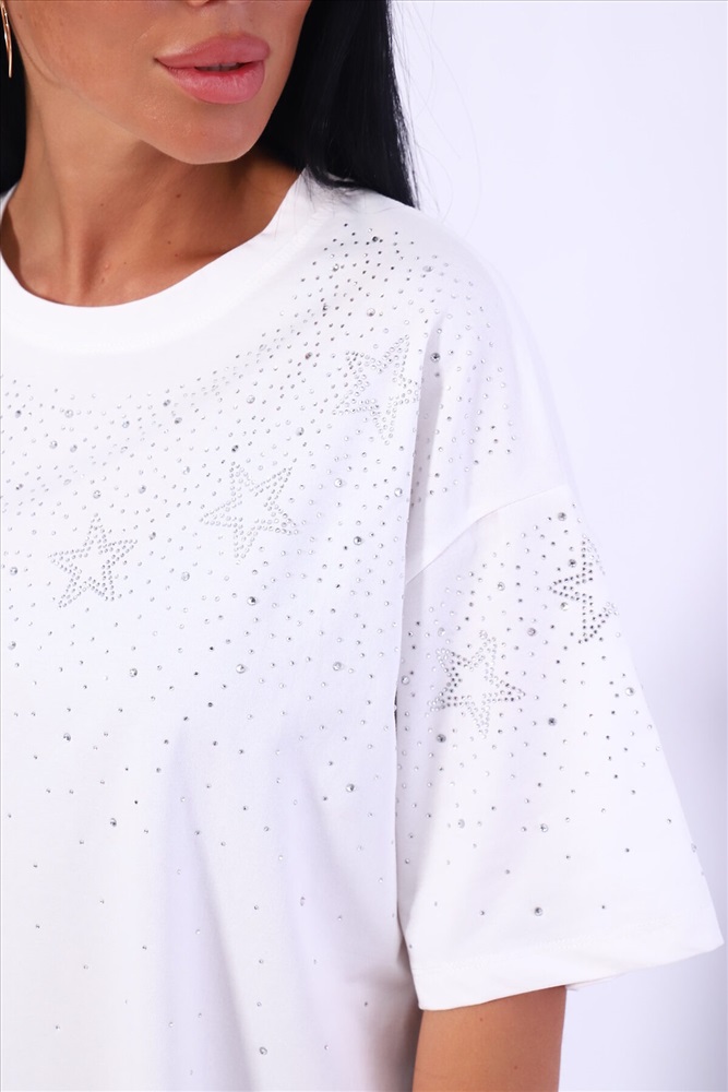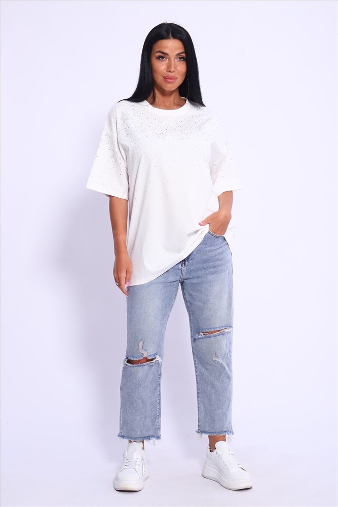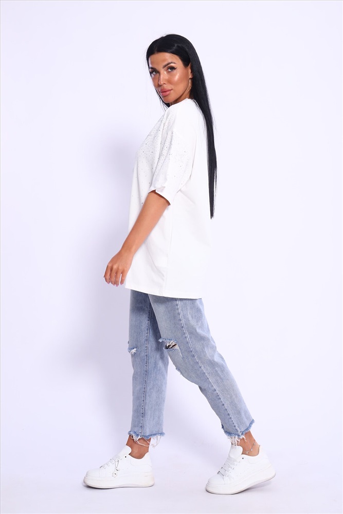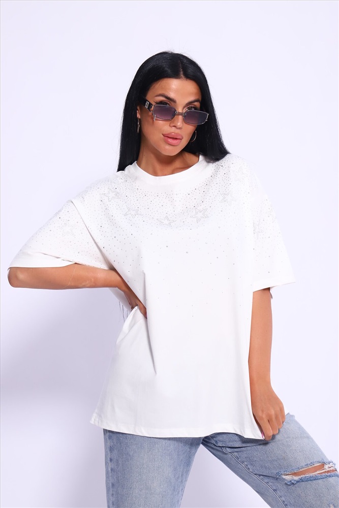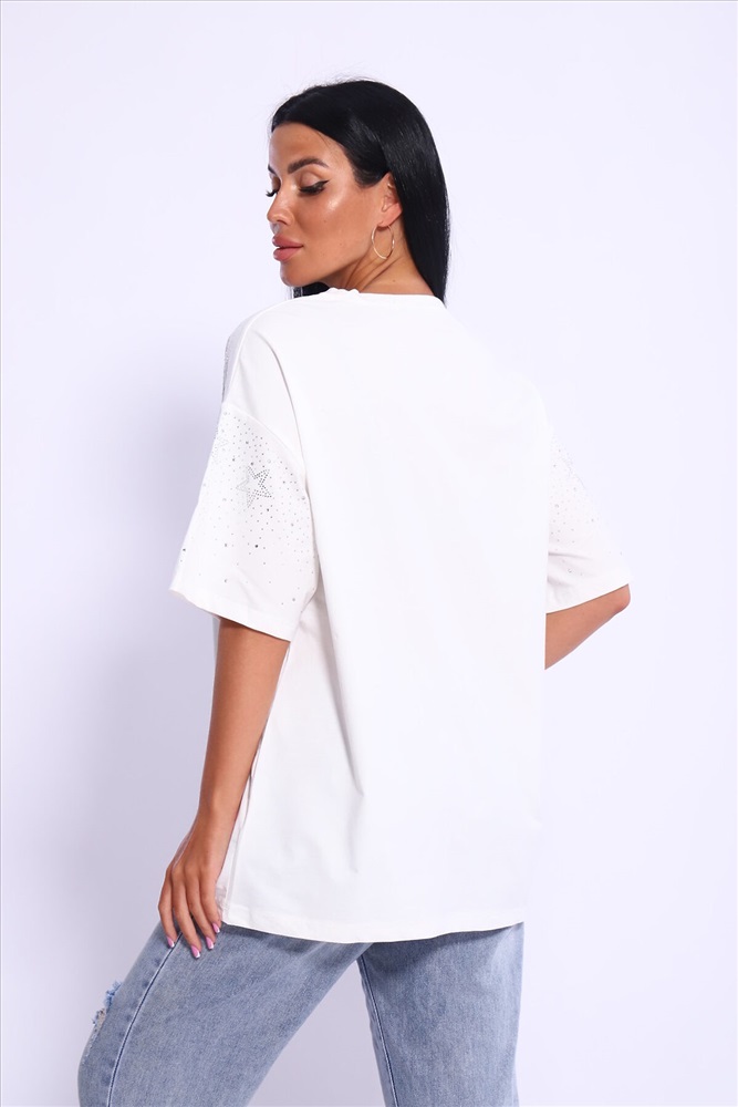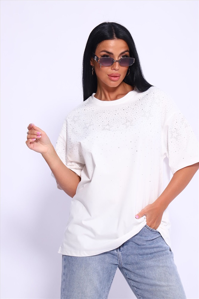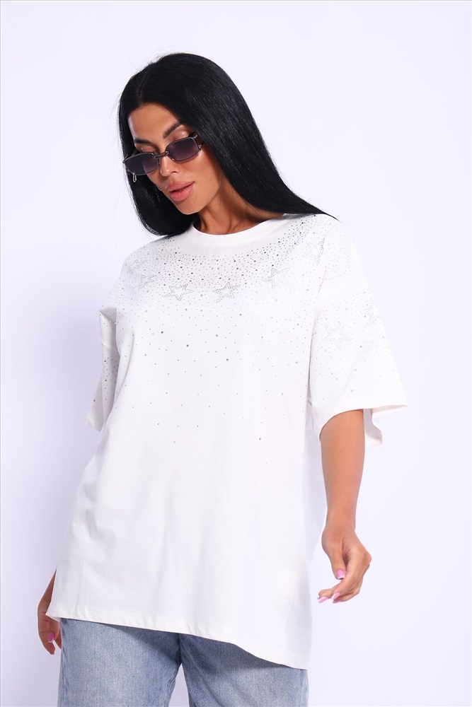 Модная и нарядная футболка со стразами в виде звездочек и россыпи. Очень мягкая и приятная ткань. Стразы расположены спереди и на рукавах. Очень красиво переливаются на солнце. Футболка сделает образ изысканным и уникальным. Благодаря уникальному дизайну будет незаменимым элементом вашего гардероба. Подойдет на день рождение, для офиса, как вечерняя, праздничная и повседневная одежда. Рукав спущенный и не сковывает движения. Длина рукава указана от плечевого шва. Перед стиркой вывернуть наизнанку. Производство Китай.