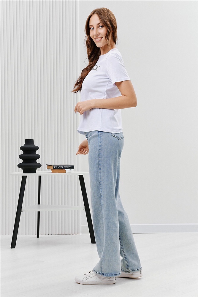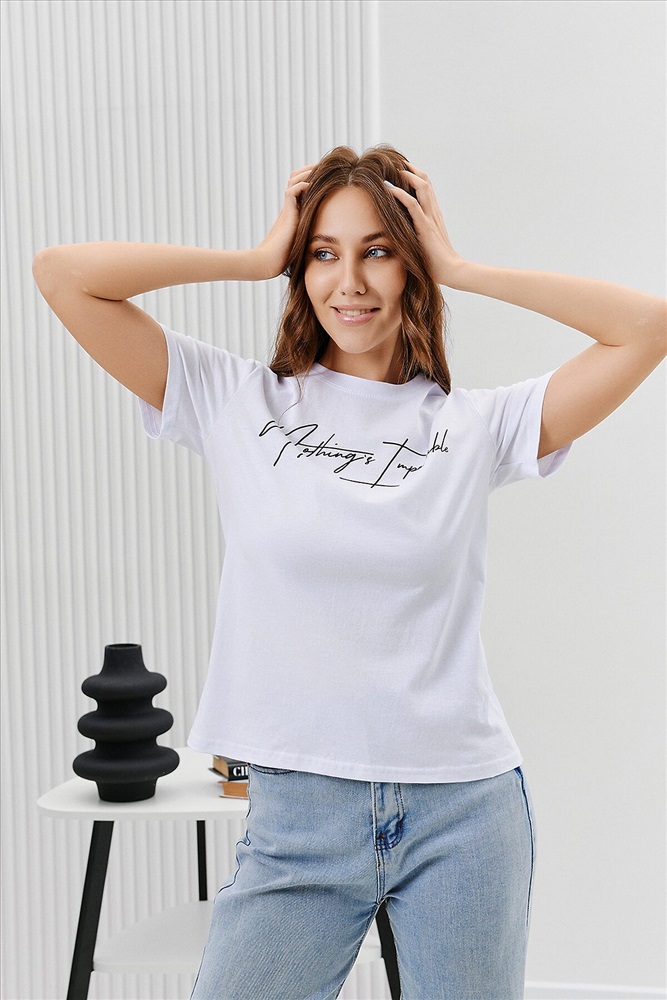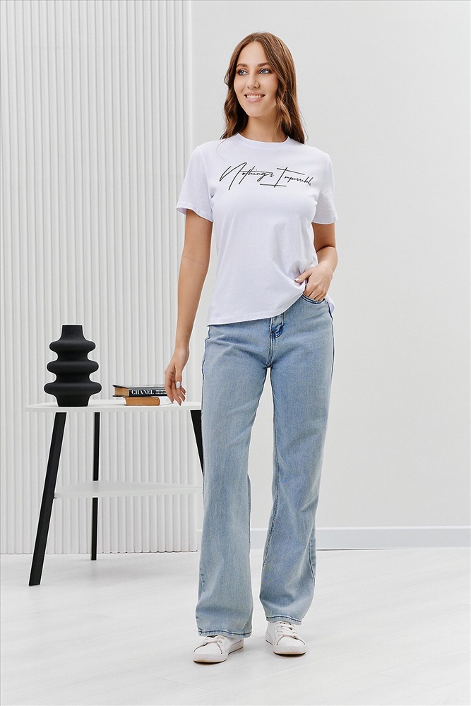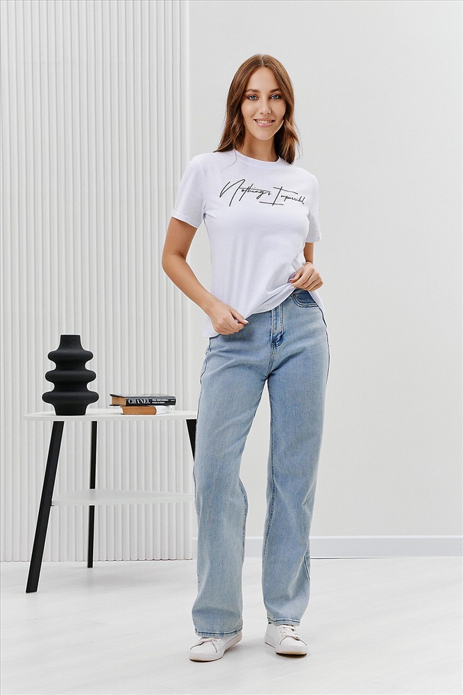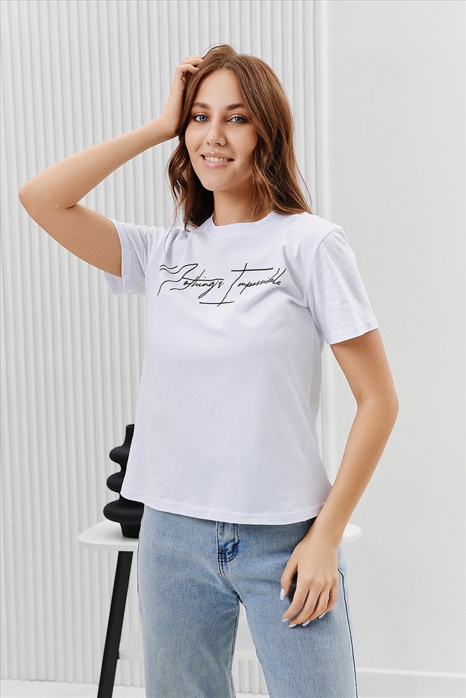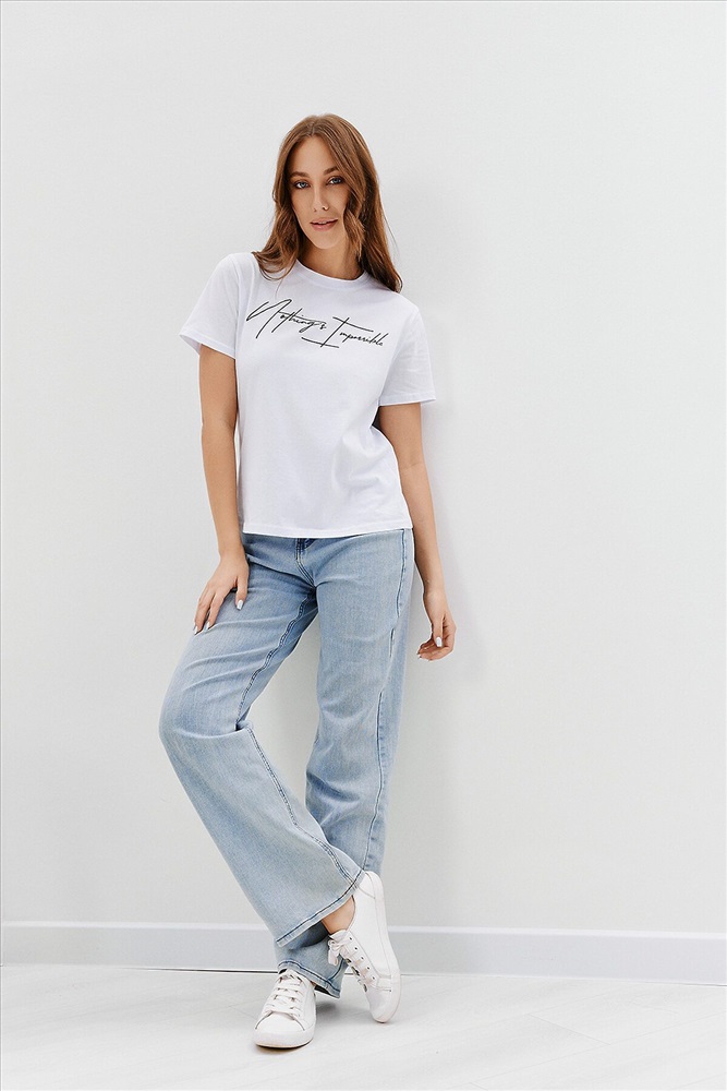 ID товара: 894469 Состав: Хлопок 100% Сезон: Весна/Лето Длина: Средняя Фасон: Прямой Рукав: Короткий Вырез горловины: Округлый Рисунок: Надпись Основная ткань: Хлопок Стиль: Повседневный Вид ткани: Кулирка Страна бренда: Россия Страна производства: Россия Футболка женская - это классика женского гардероба любой девушки. Это базовая модель с ярким принтом отлично смотрится с джинсами, юбками, брюками. Прямой силуэт, втачной рукав, горловина округлой формы обработана обтачкой из основного полотна. Комментарии к товару