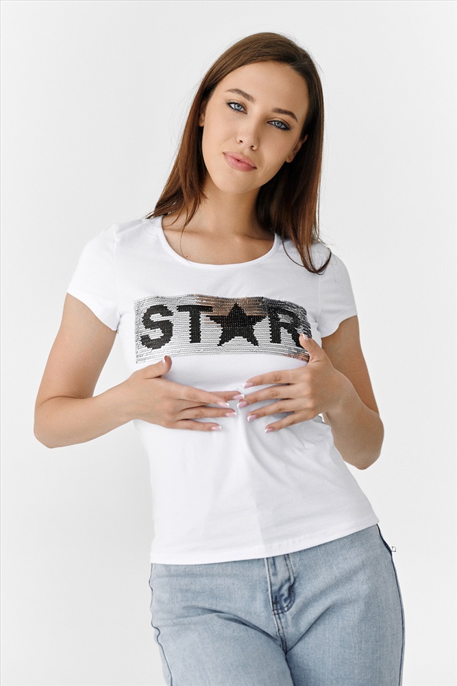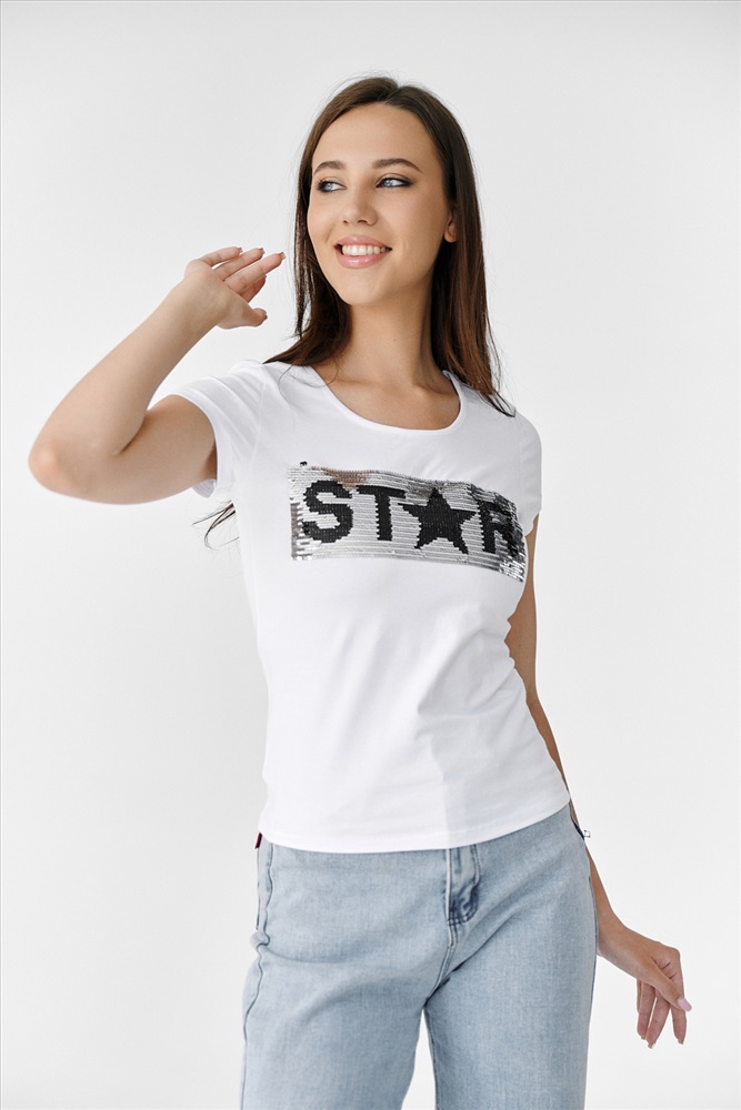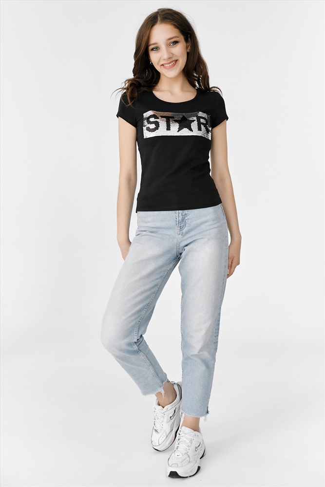 Состав: хлопок 95%, лайкра 5% Модель: Футболка 7079 Тип товара: футболка Материал: кулирка с лайкрой пенье | кулирка с лайкрой пенье Бренд: Натали Суслова Длина: средняя длина Отделка: с пайетками Рейтинг: Рейтинг 4 и выше Рисунок: крупный принт | надпись Рукав: короткий рукав Сезонность: лето | осень | весна | зима Силуэт: полуприлегающий Скидка: любая | от 10% и больше | от 30% и больше | от 50% и больше Стиль: молодежный | повседневный Футболка полуприлегающего силуэта, с округлой горловиной, длиной до середины бедра. Рукав втачной короткий. Горловина обработана бейкой из основного полотна. Пайетки двусторонние Таблица размеров и веса