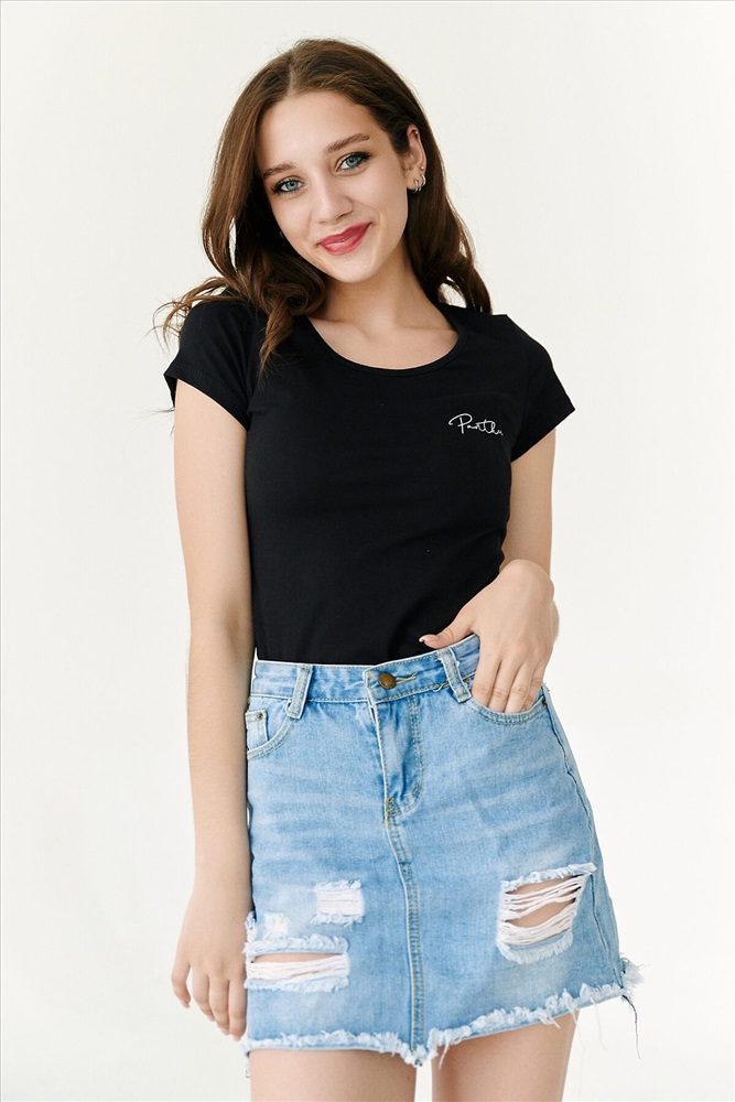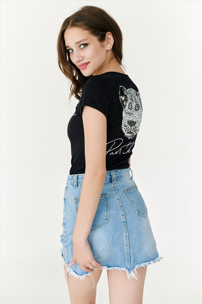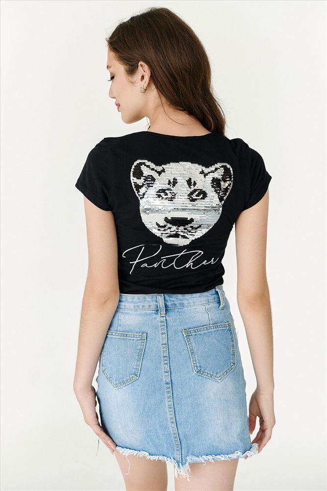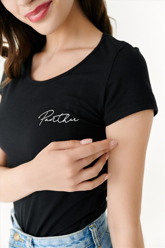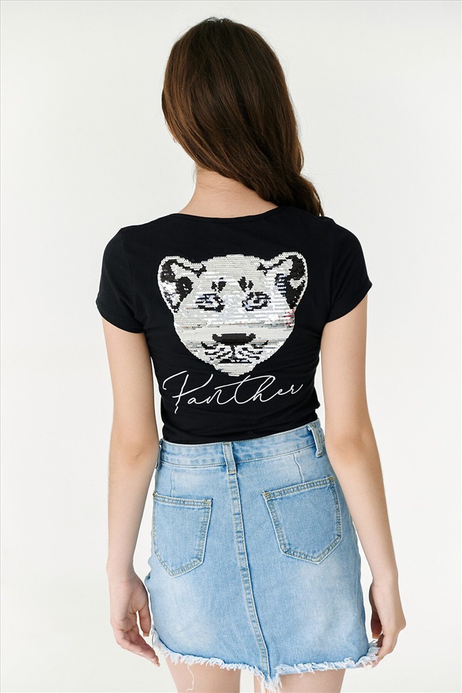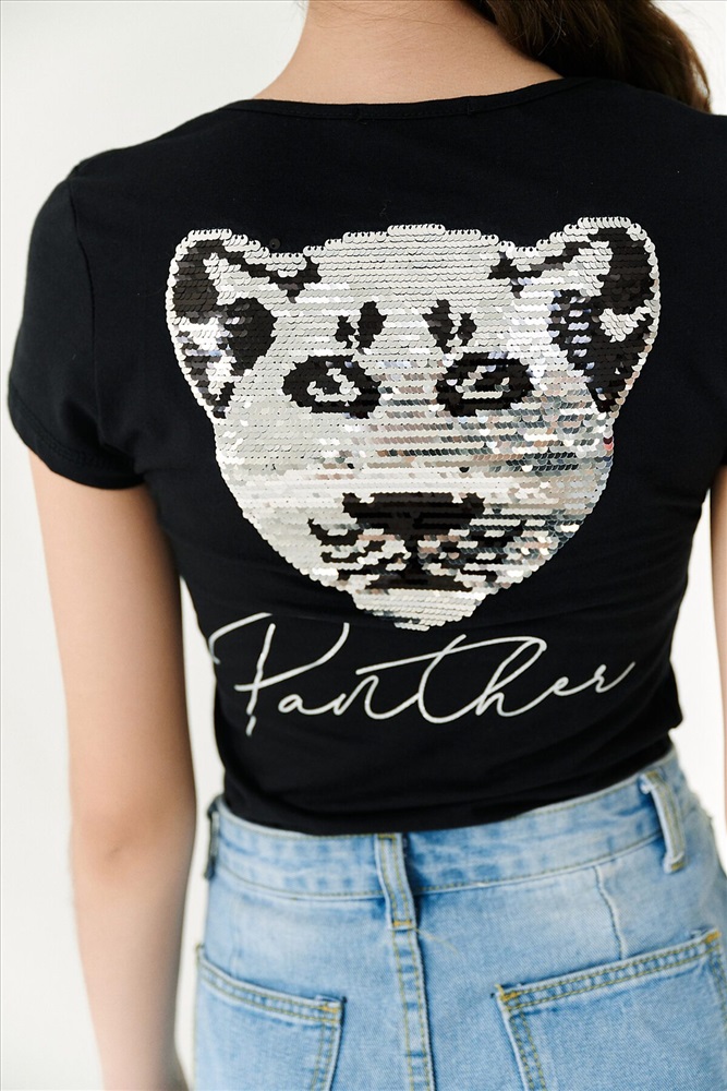 ID товара: 883373 Состав: Хлопок 95%, Лайкра 5% Сезон: Весна/Лето Длина: Средняя Фасон: Полуприлегающий Рукав: Короткий Вырез горловины: Округлый Рисунок: Надпись Основная ткань: Кулирка с лайкрой пенье Стиль: Повседневный Страна бренда: Россия Страна производства: Россия Футболка полуприлегающего силуэта, с округлой горловиной, длиной до середины бедра. Рукав втачной короткий. Горловина обработана бейкой из основного полотна. На спине большая аппликация из пайеток в виде головы пантеры и печать-надпись серебряным глиттером. На передней полочке небольшая печать. Комментарии к товару