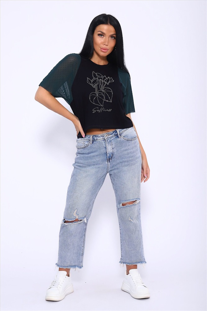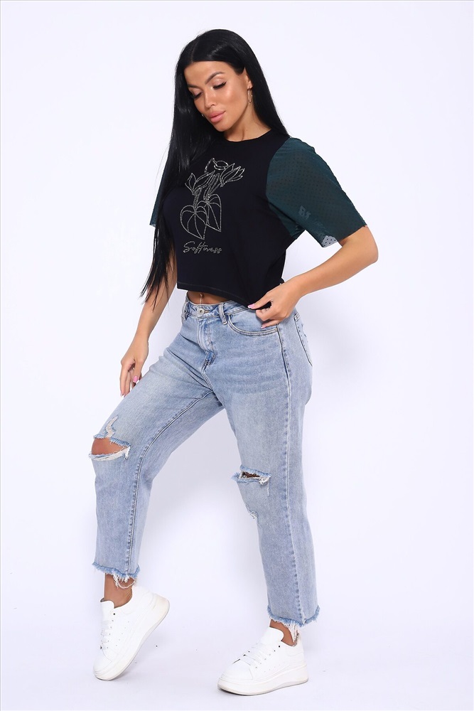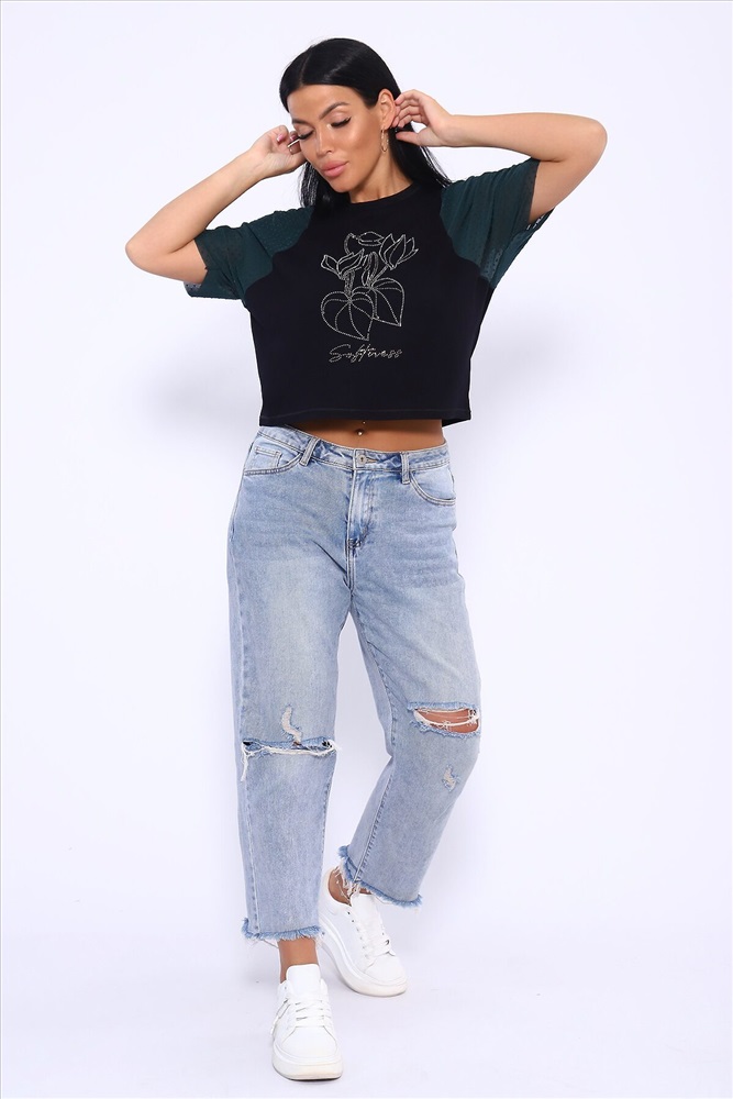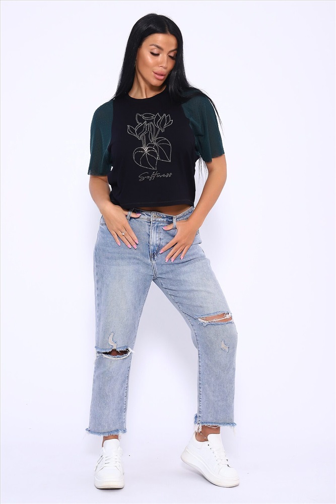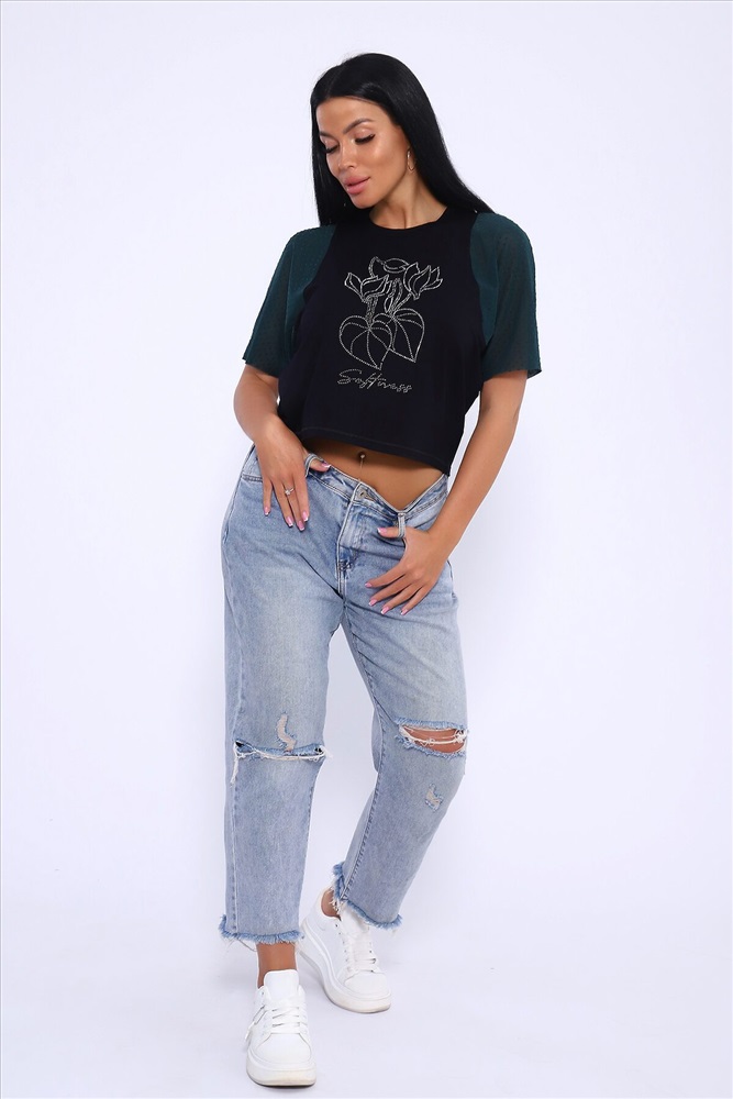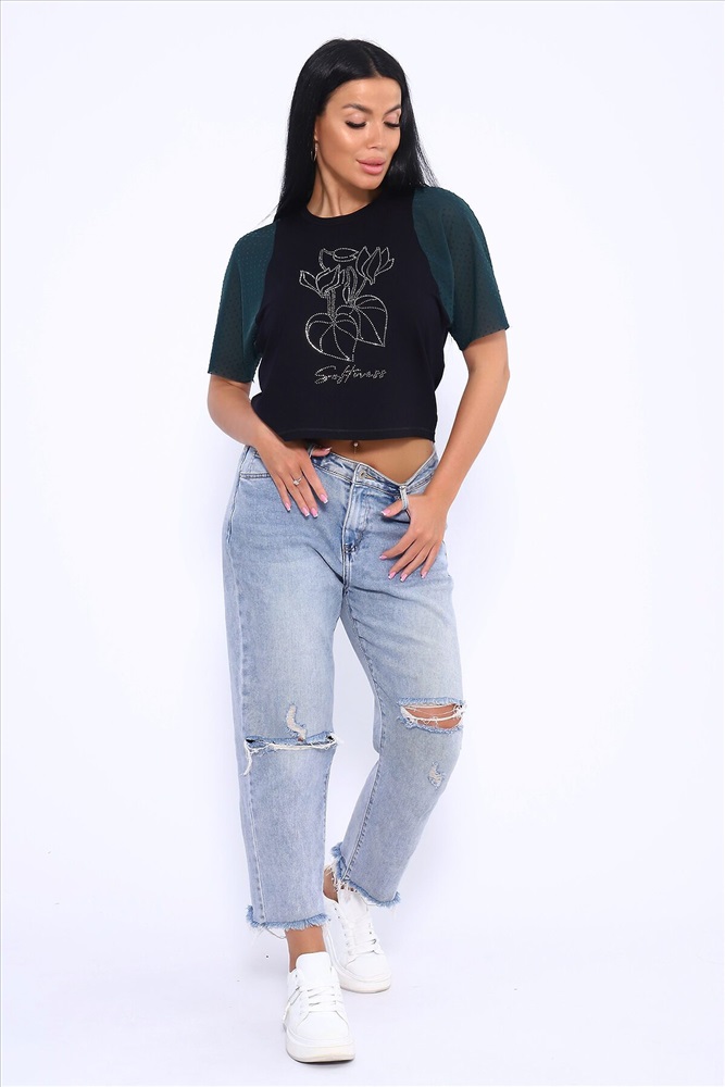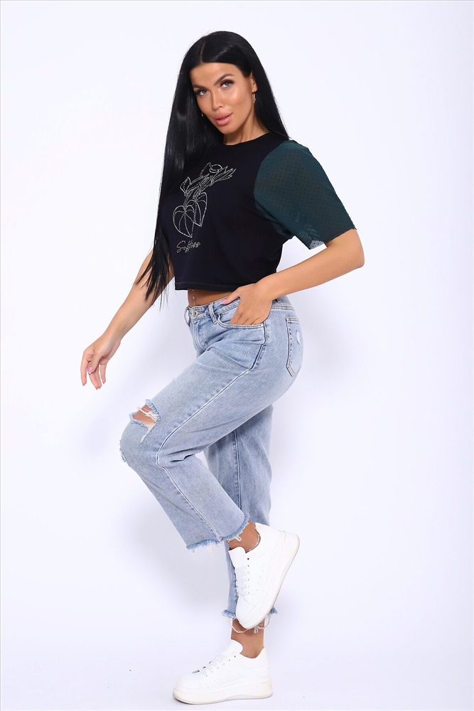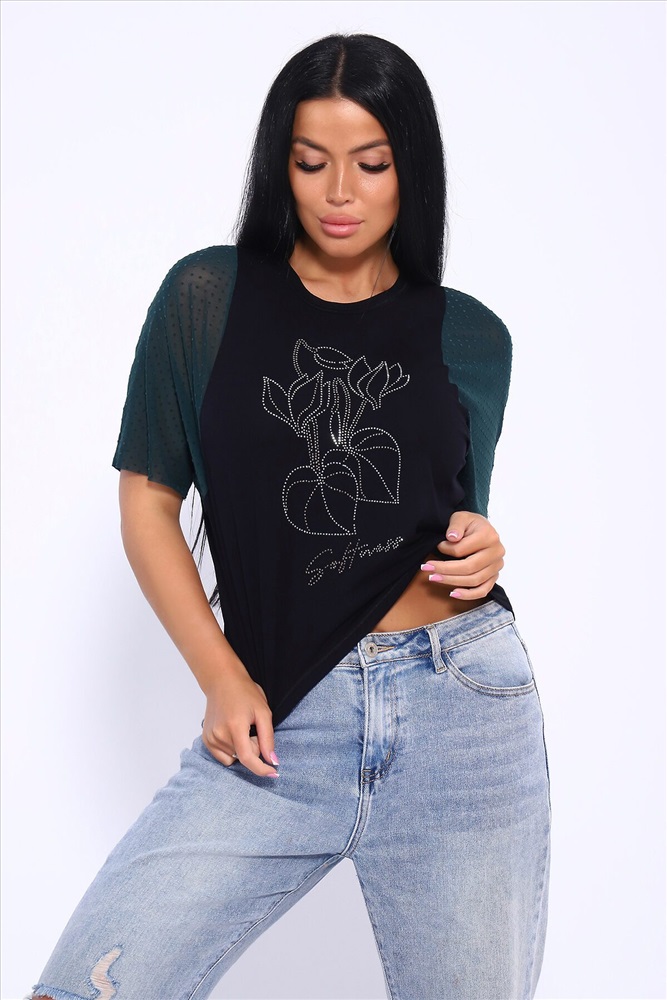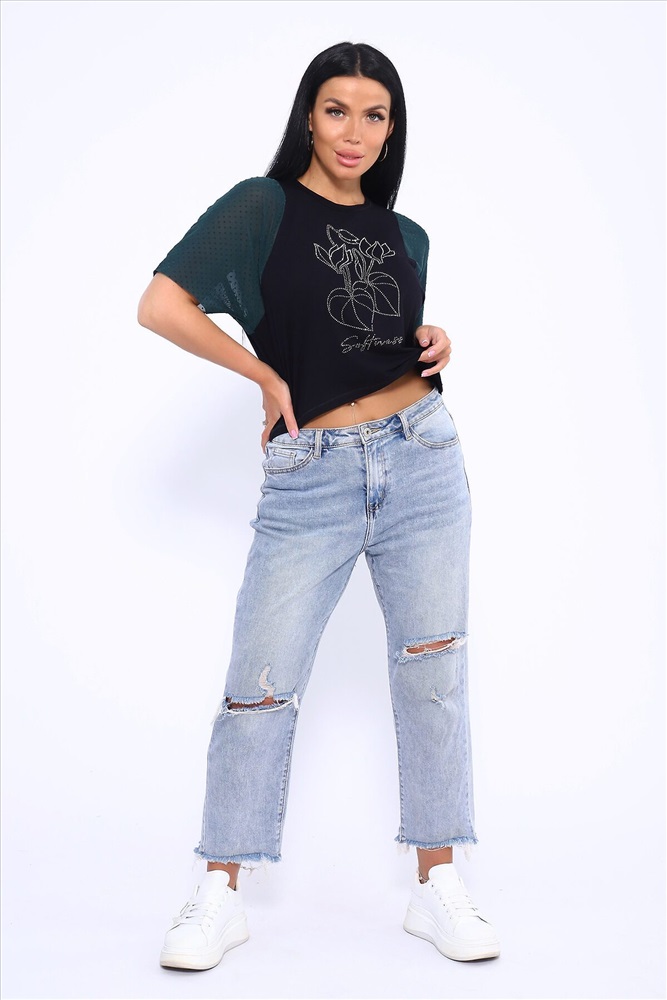 ID товара: 1018600 Состав: 92% Вискоза , 8% Лайкра Сезон: Весна/Лето Фасон: Прямой Рукав: Короткий Вырез горловины: Круглый Рисунок: Фантазийный Вид ткани: Вискоза пенье Страна бренда: Россия Страна производства: Россия Футболка свободного кроя летучая мышь, рукова из турецкой сеточки горох мягкие и не весомые. Принт в виде ярких страз. Стильная и качественная вещь на лето станет отличным выбором. Такой вид футболки можно сочетать с любоым видом одежды. Для вечерних выходоыв будет отличным вариантом. Производство Россия. Комментарии к товару