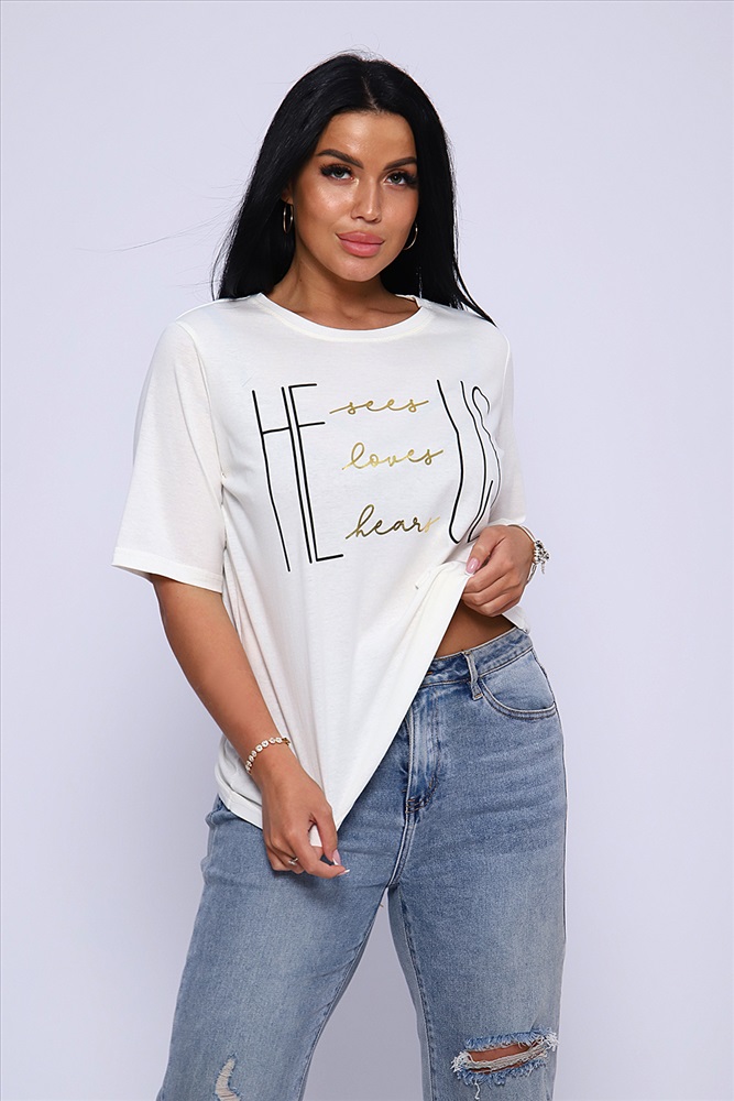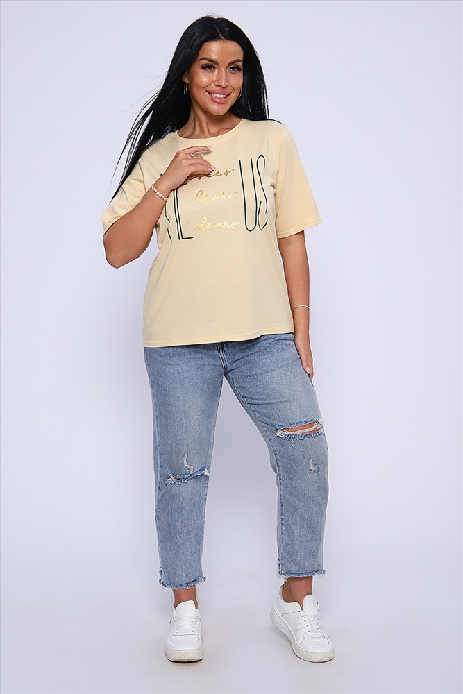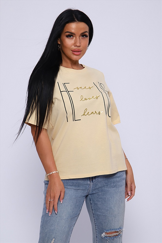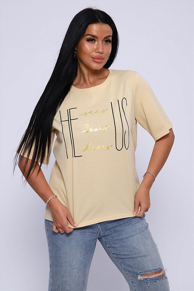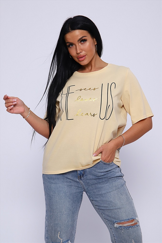 Стиль: повседневный Футболка с благородным блеском золота на необыкновенно женственном принте HE US притягивает взгляд и позволяет чувствовать себя необыкновенной! Прямой силуэт, выверенная длина рукава до локтя, обработка деталей вкруговую с закрепкой. Горловина выполнена из основной ткани. Большие размеры!