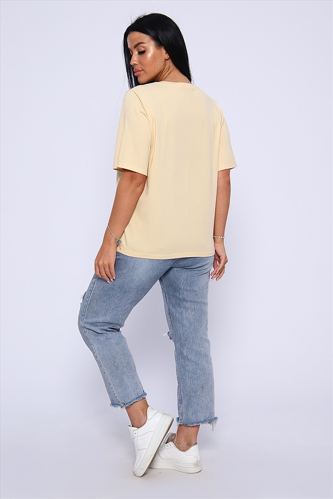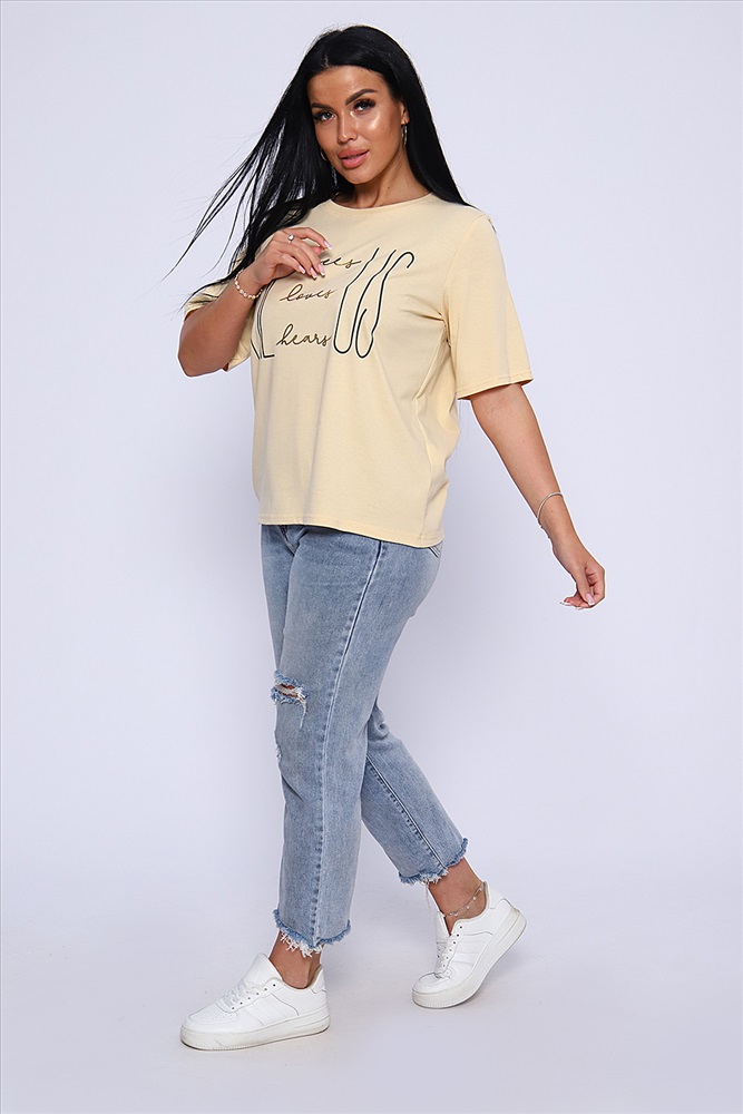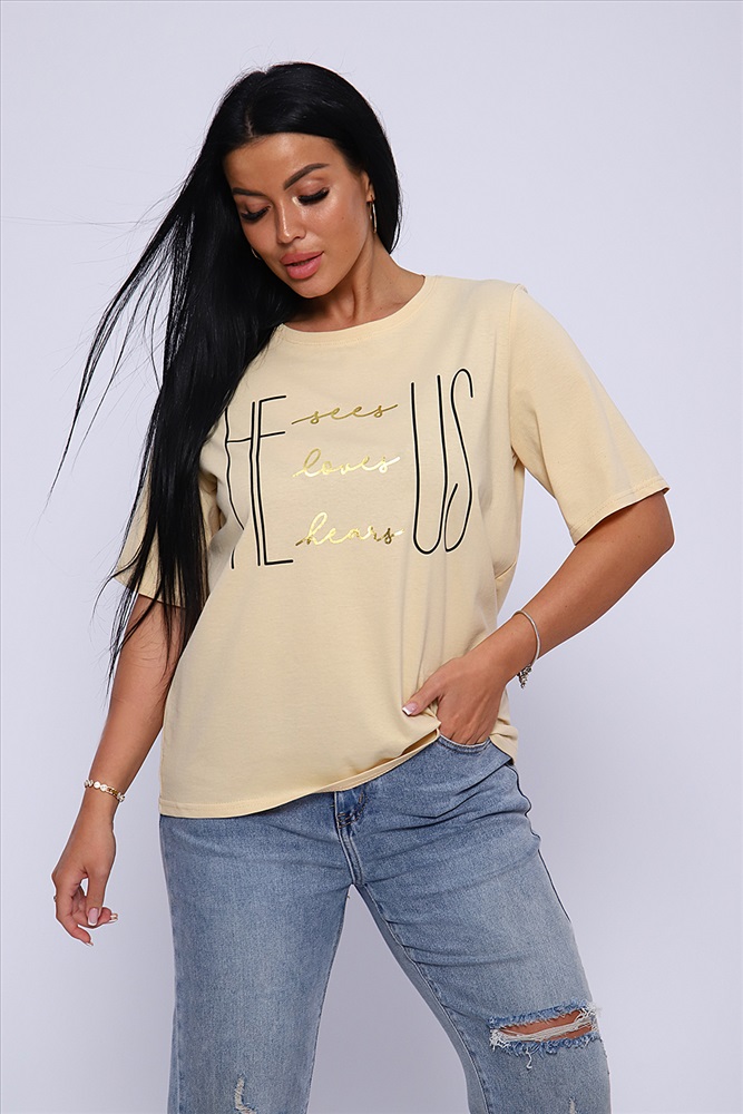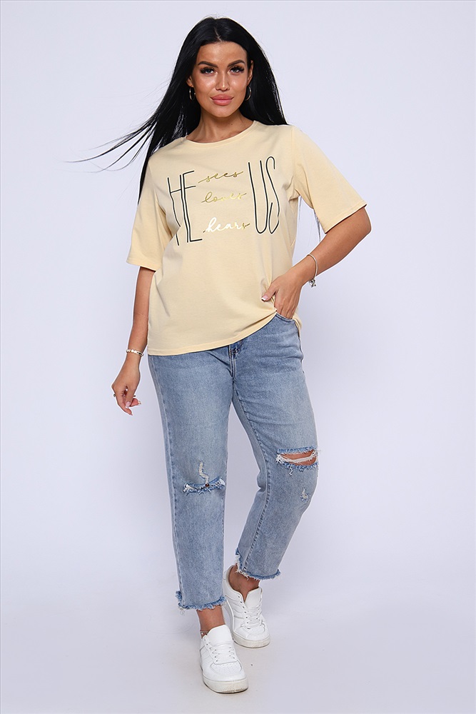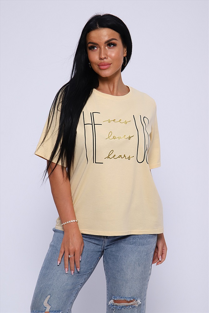 Стиль: повседневный Футболка с благородным блеском золота на необыкновенно женственном принте HE US притягивает взгляд и позволяет чувствовать себя необыкновенной! Прямой силуэт, выверенная длина рукава до локтя, обработка деталей вкруговую с закрепкой. Горловина выполнена из основной ткани. Большие размеры!