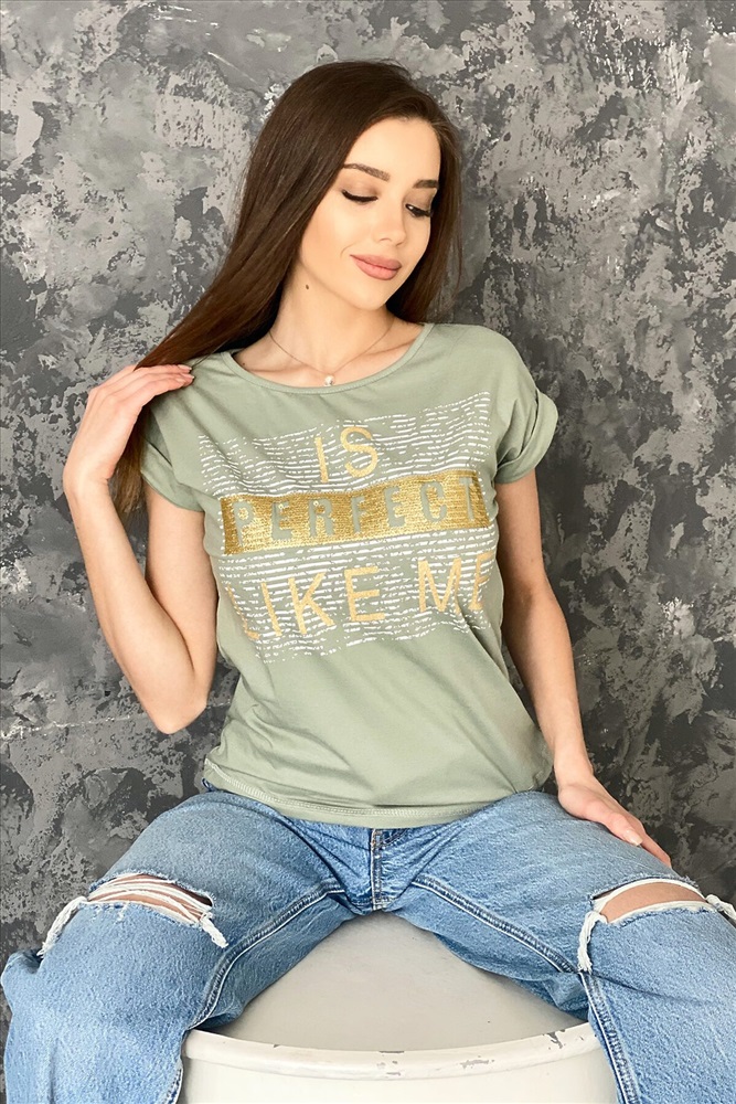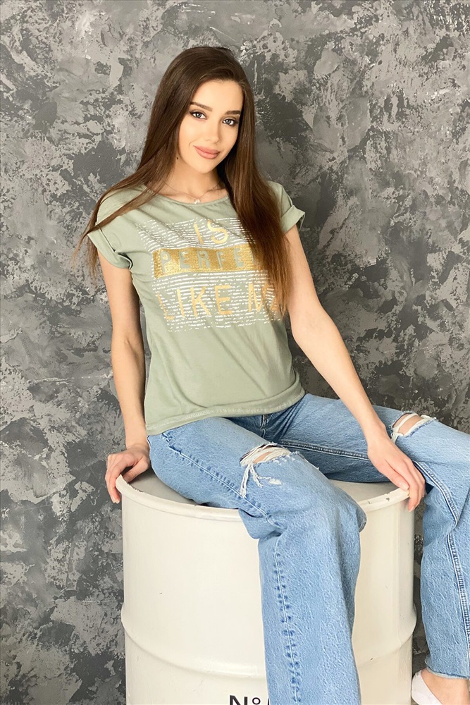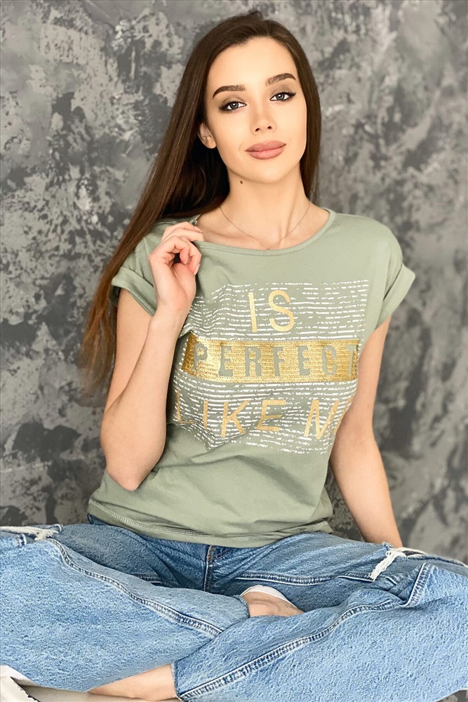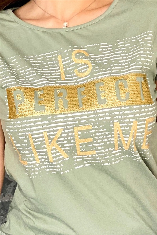 Футболка полуприлегающего силуэта, средней длины, с округлой горловиной. Рукав цельнокроеный, короткий, на манжете с отворотом. Полочка украшена эффектной печатью с пайетками