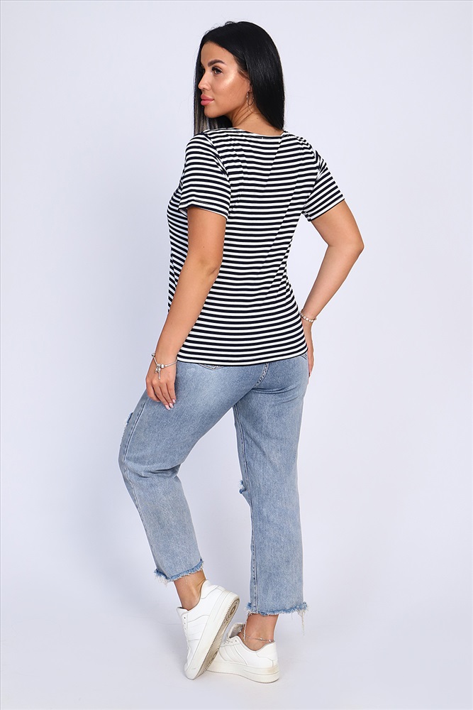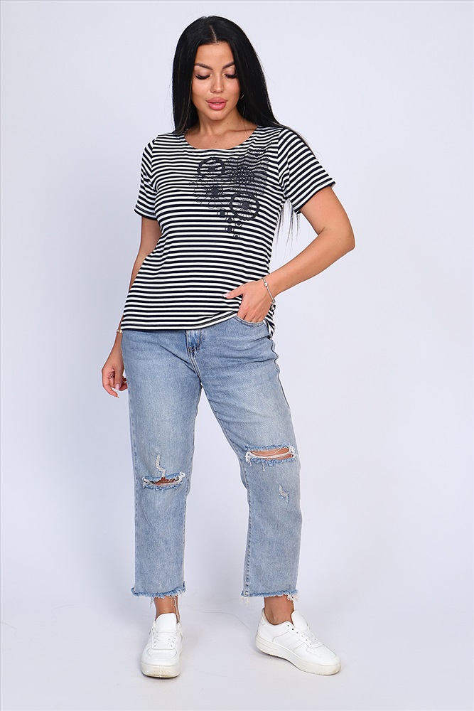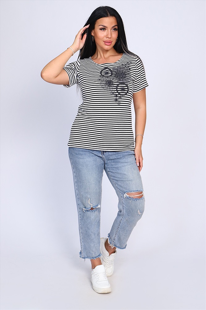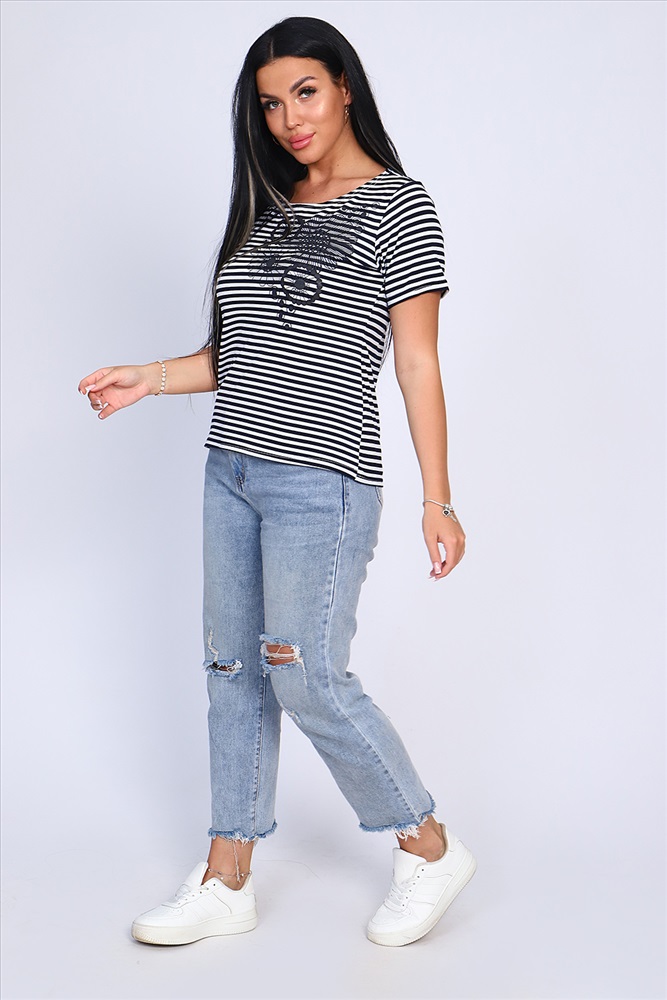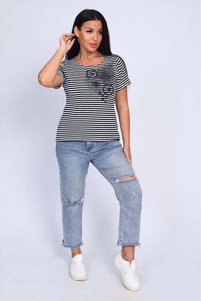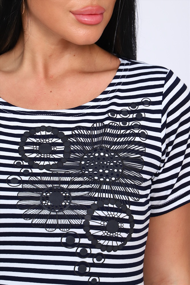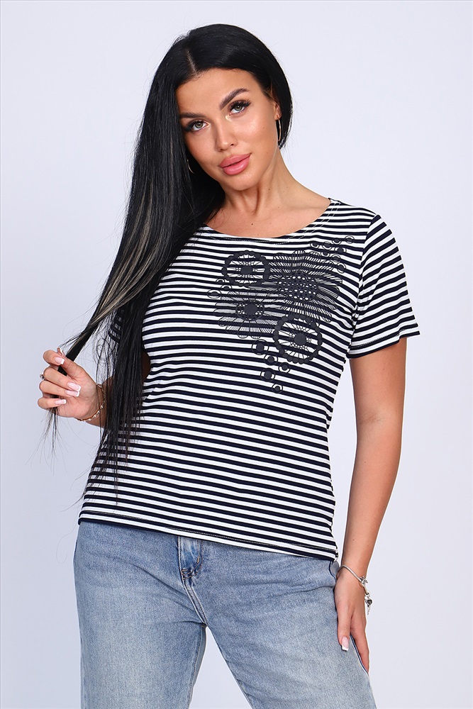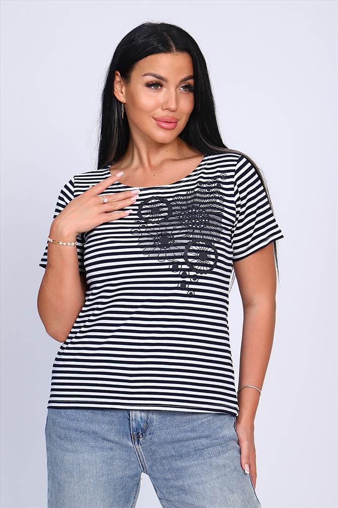 Стиль: повседневный Стильная женская футболка из вискозы в полоску - настоящая находка для модниц, любящих комфорт и красивый вид. Модель с круглым вырезом горловины и коротким рукавом , слегка приталенного силуэта красиво подчеркнет изгибы фигуры и сделает вас женственной в любом наряде: в дерзком молодежном или сдержанном классическом. Футболку украшает изящный рисунок-цветок, что делает ее неповторимой и оригинальной. Универасальная модель женской футболки на каждый день способна стать частью офисного, нарядного, вечернего и повседневного образа.