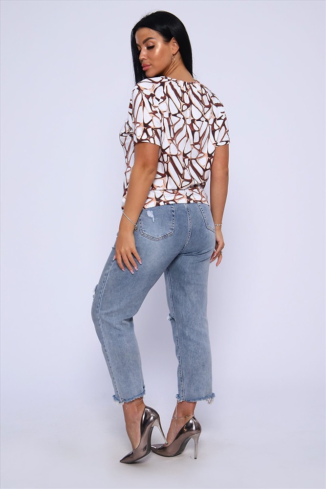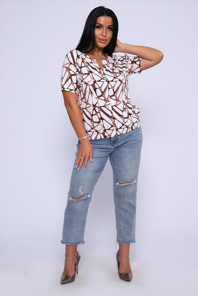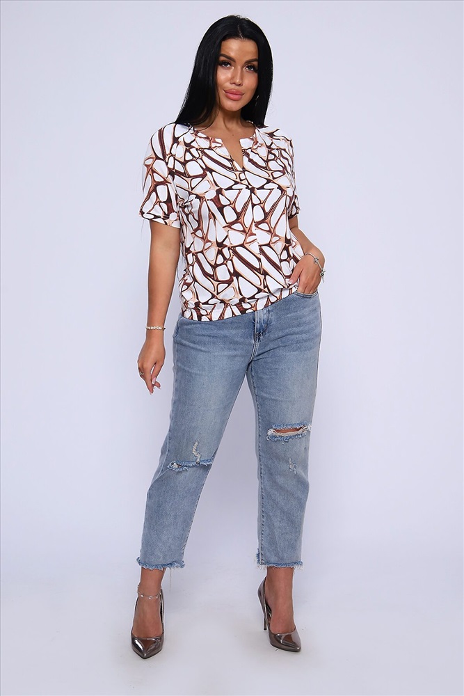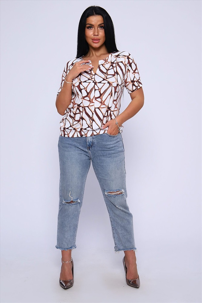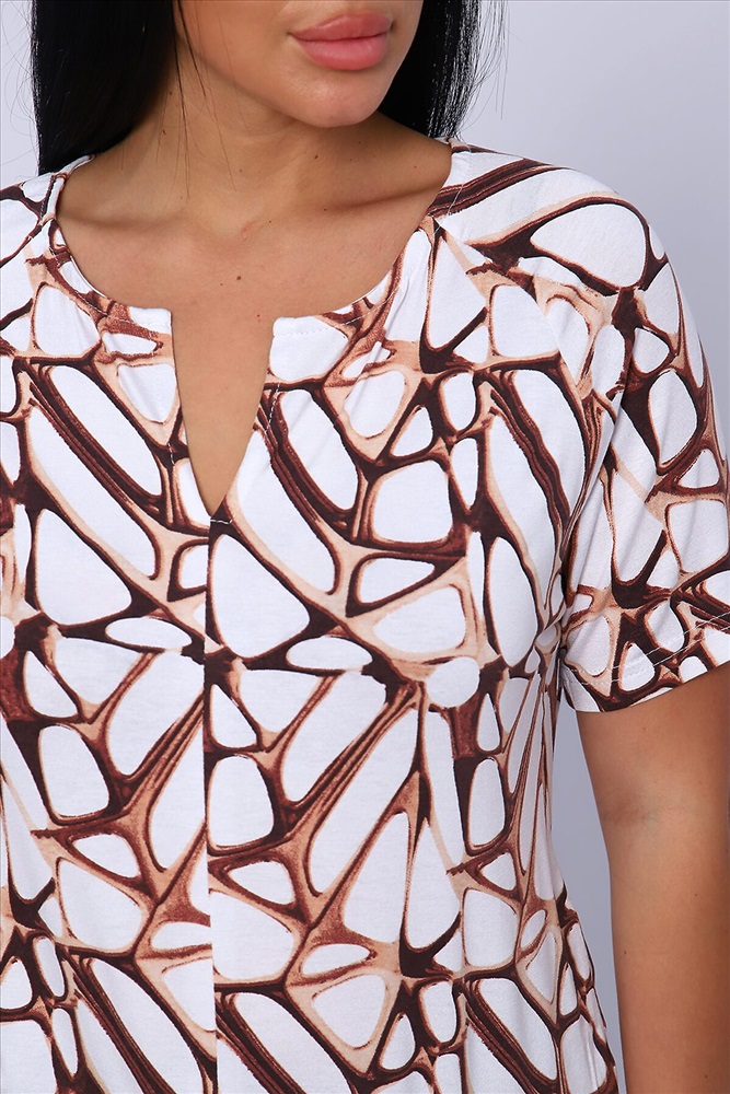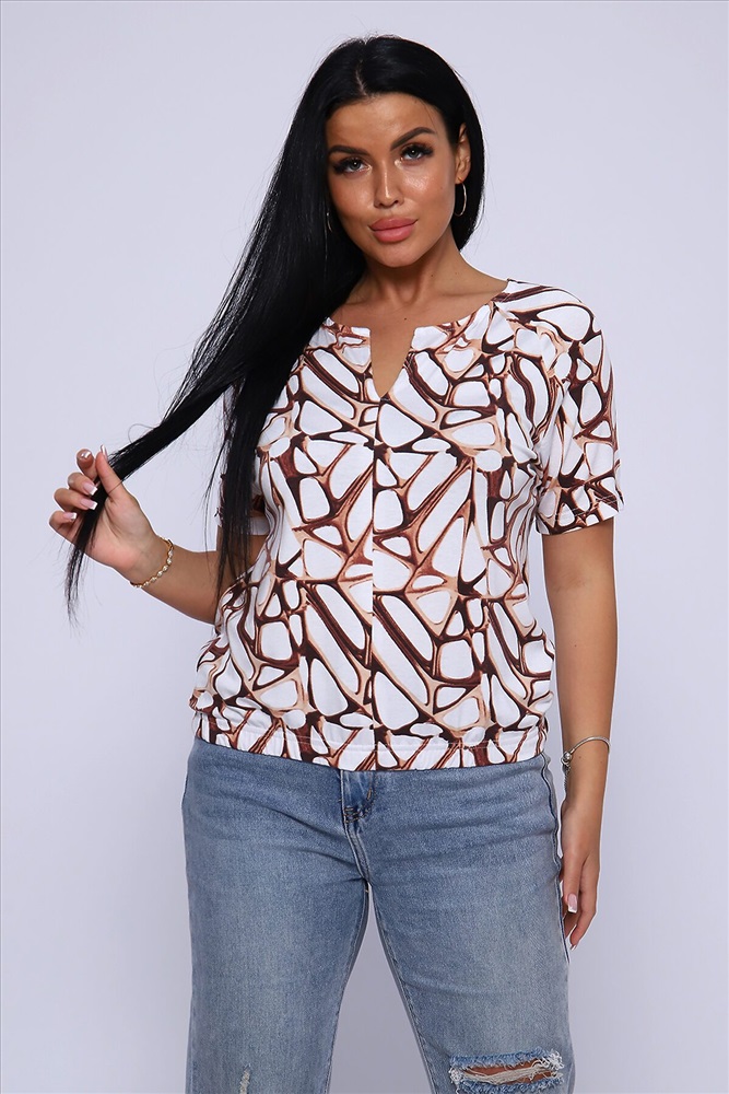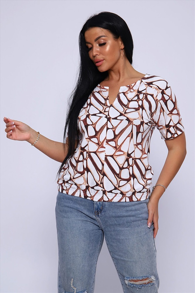 ID товара: 906774 Состав: Вискоза 92%, Лайкра 8% Сезон: Весна/Лето Длина: Средняя Фасон: Свободный крой Рукав: короткие Вырез горловины: V-образный Рисунок: Абстракция Основная ткань: Вискоза Стиль: Повседневный Вид ткани: Вискоза Страна бренда: Россия Страна производства: Россия Футболка женская из набивной, приятной к телу, струящейся вискозы. Туника свободного силуэта, круглая горловина с фигурным вырезом на груди в виде галочки, короткий рукав - реглан. Низ футболки собран на широкую резинку для более комфортного прилегания. Это позволит импровизировать ваш образ: эффектно подчеркнуть талию или изящно разместить на линии бедер. Лёгкая, летняя кофта отличный офисный вариант, хорошо будет смотреться с брюками, джинсами, а также с юбкой, создавая стильный, женственный, утонченный образ.Длина рукава в таблице измерений указана от начала горловины. Комментарии к товару