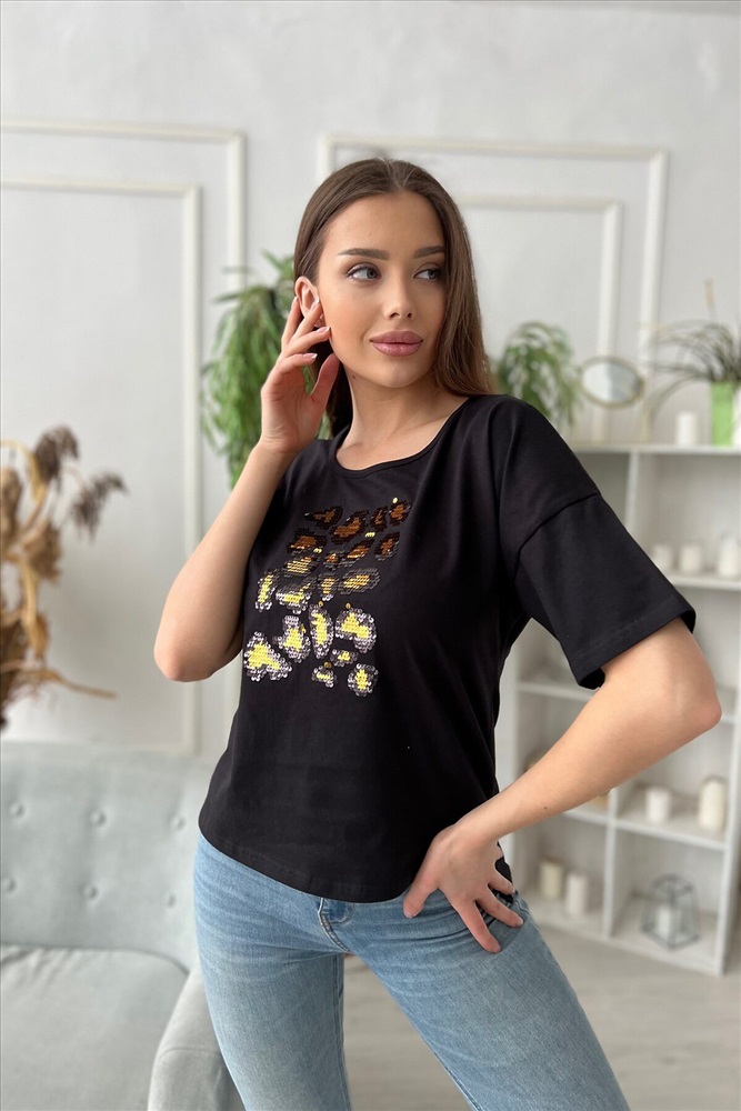 ID товара: 764956 Состав: Хлопок 95%, Лайкра 5% Сезон: Весна/Лето Длина: Средняя Фасон: Прямой Рукав: Короткие Вырез горловины: Округлый Рисунок: леопардовый Декоративные элементы: Пайетки Основная ткань: Хлопок | Кулирка с лайкрой пенье Стиль: Повседневный Страна бренда: Россия Страна производства: Россия Футболка прямого силуэта, с округлой горловиной, с удлиненной спинкой. Рукав короткий. Горловина обработана бейкой из основного полотна. На полочке эффектная аппликация из пайеток Комментарии к товару