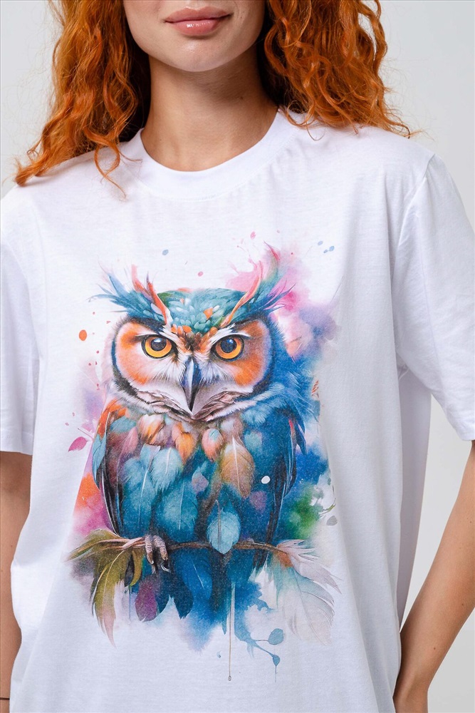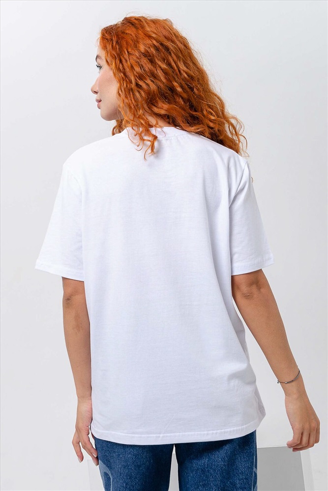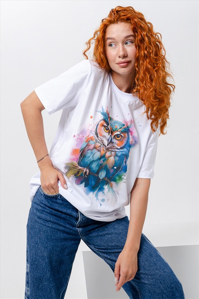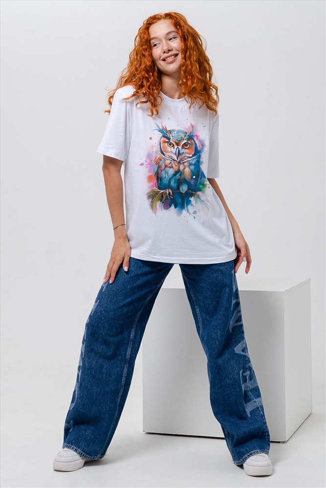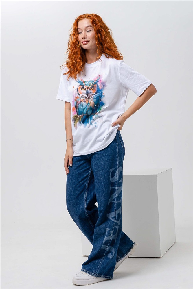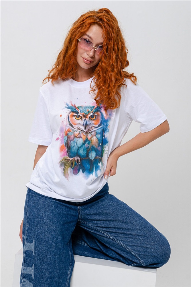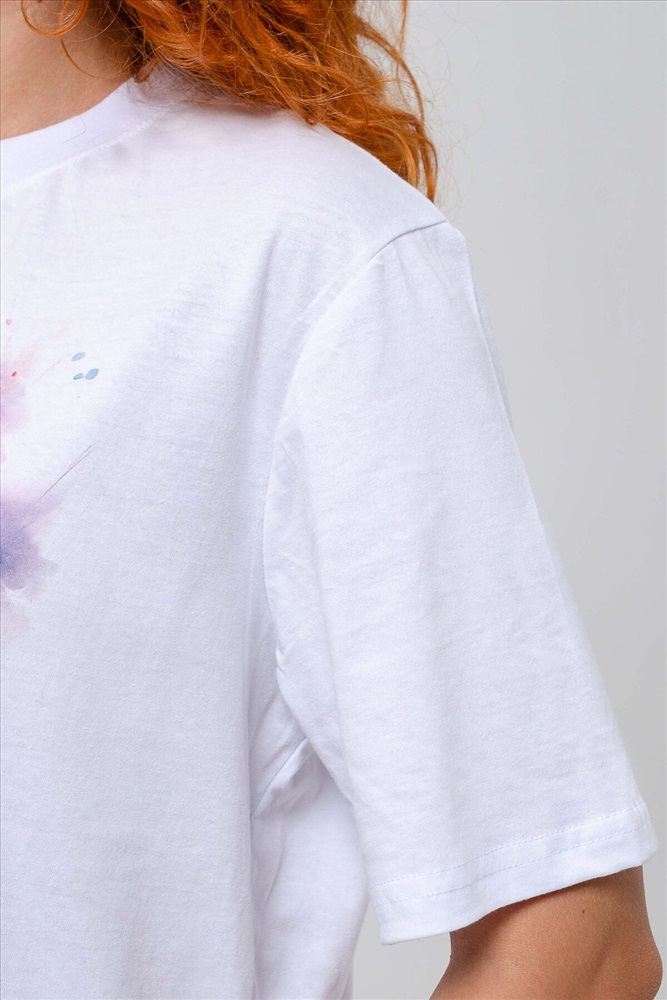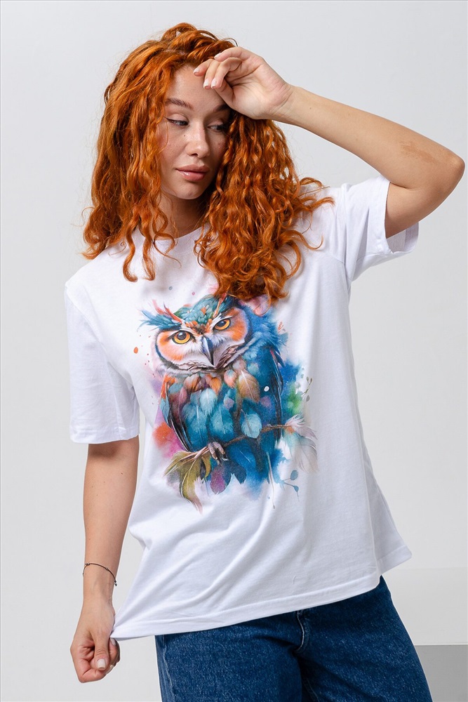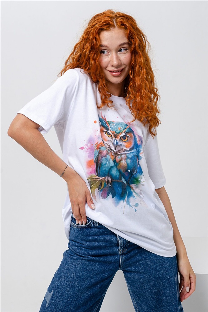 ID товара: 1026976 Состав: 100% Хлопок Сезон: Весна/Лето Фасон: Прямой Рукав: Короткий Вырез горловины: Круглый Рисунок: Фантазийный Вид ткани: Кулирка Страна бренда: Россия Страна производства: Россия Футболка прямая, свободная, средней длины, с округлой горловиной. Рукав короткий. Горловина обработана эластичной обтачкой. Комментарии к товару