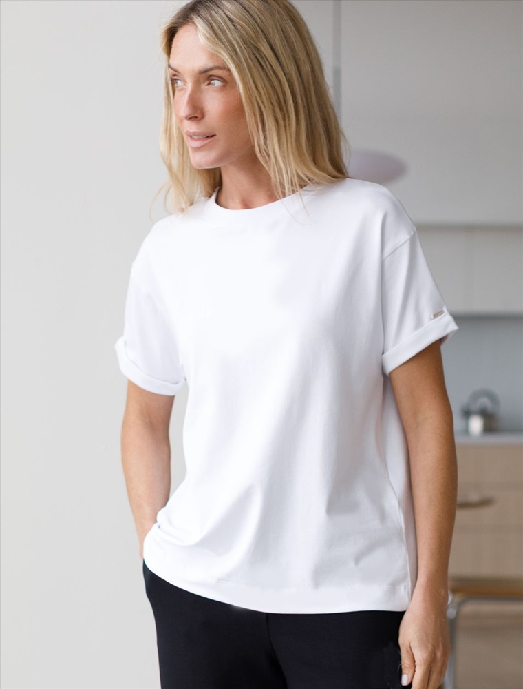 Базовая однотонная футболка из премиального хлопка. Горловина выполнена из рибаны в тон изделия, Рукава с подворотами и золотистым логотипом бренда. Добавление эластана в состав изделия способствует формоустойчивости. Самое высокое качество хлопковых волокон обеспечивает комфорт в любое время года. Идеально держит форму и сохраняет внешний вид в течение долговременного использования. Универсальная базовая вещь для ваших стилистических решений.