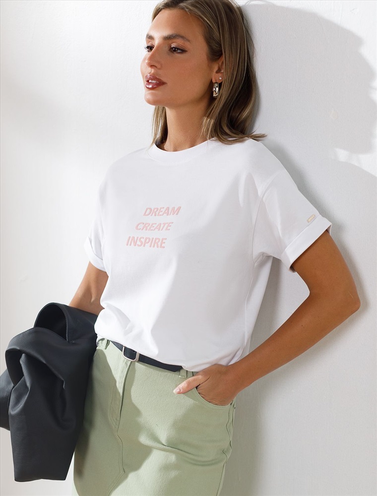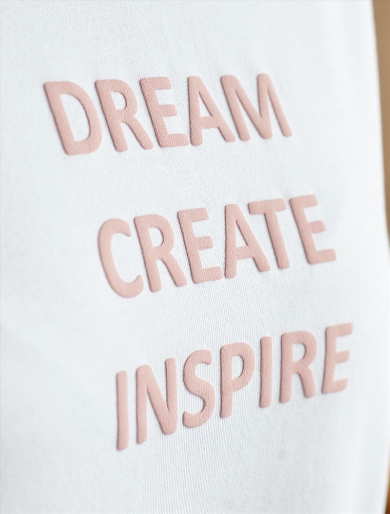 Плотность: 170 Г/м2 Параметры модели на первом фото: Рост 170, бюст 83, талия 64, бедра 88 Перевод принта: Dream, create, inspire — мечтай, создавай, вдохновляй. Футболка из премиального хлопка, высокое качество хлопковых волокон обеспечивает комфорт в любое время года. Горловина выполнена из рибаны в тон изделия, Рукава с подворотами и золотистым логотипом бренда. Авторский принт нанесен фактурными красками с устойчивым покрытием. За счет эластана в составе идеально держит форму и сохраняет внешний вид в течение долговременного использования. Универсальная вещь для ваших стилистических решений. Комментарии к товару