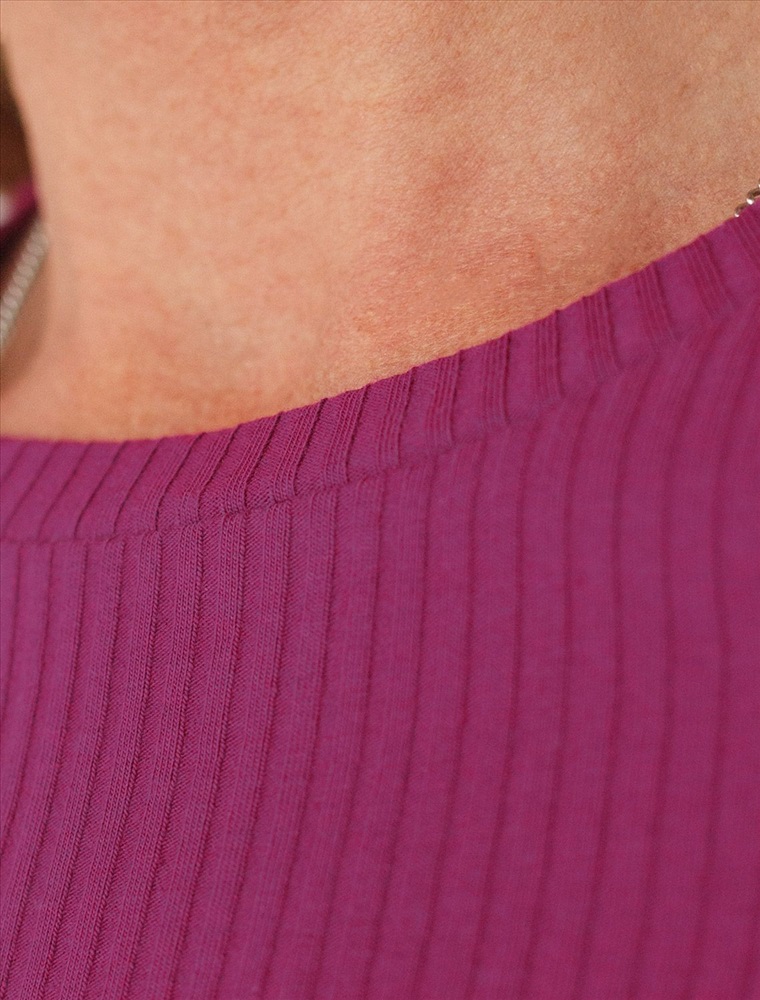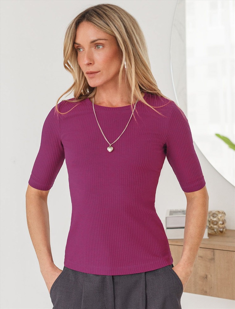 Размер товара на первом фото: 42 Футболка выполнена из трикотажа в широкий рубчик. Базовая модель с круглым вырезом и рукавом до локтя. Эластичный хлопковый трикотаж сидит по фигуре, не сковывает движений и очень комфортный в носке. Фактура вертикальных полос визуально стройнит и вытягивает силуэт. Базовое изделие хорошо впишется в любой гардероб. Идеально подходит для многослойных образов в базовый гардероб.