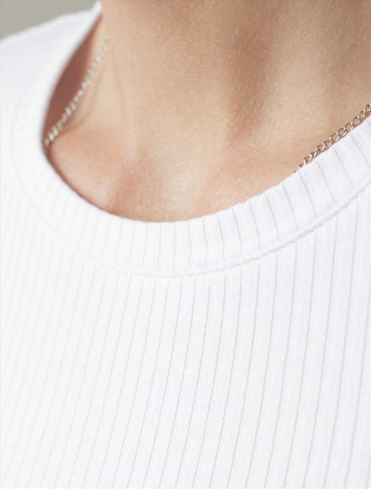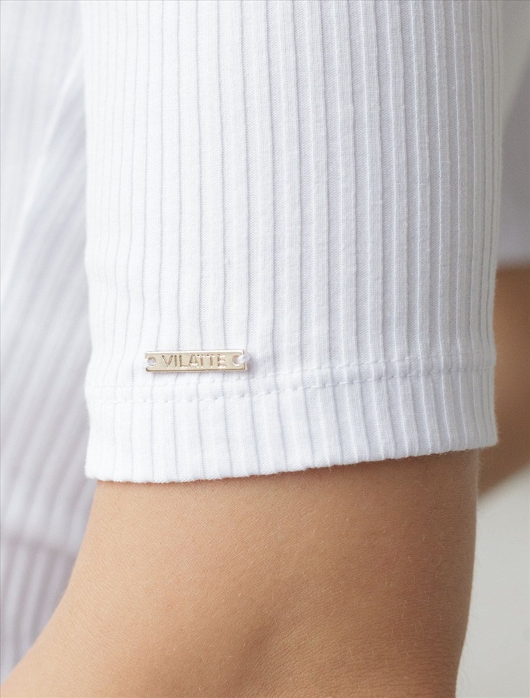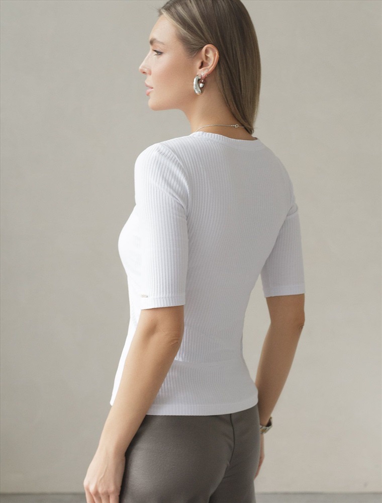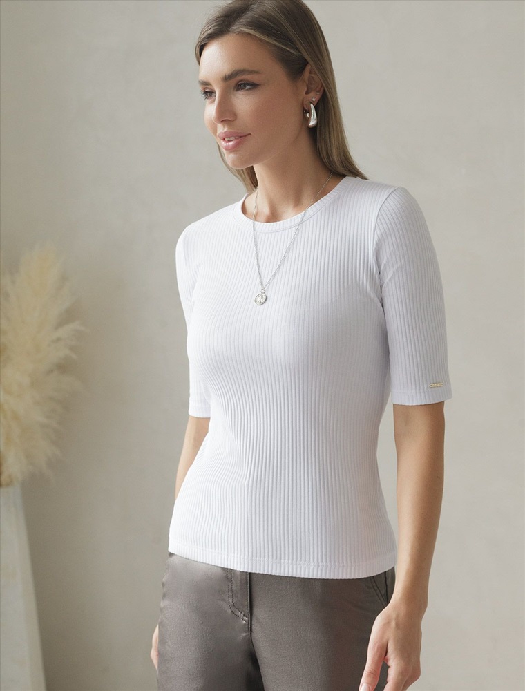 Футболка выполнена из трикотажа в широкий рубчик. Базовая модель с круглым вырезом и рукавом до локтя. Эластичный хлопковый трикотаж сидит по фигуре, не сковывает движений и очень комфортный в носке. Фактура вертикальных полос визуально стройнит и вытягивает силуэт. Базовое изделие хорошо впишется в любой гардероб. Идеально подходит для многослойных образов в базовый гардероб.