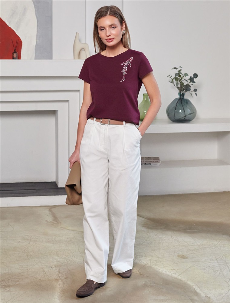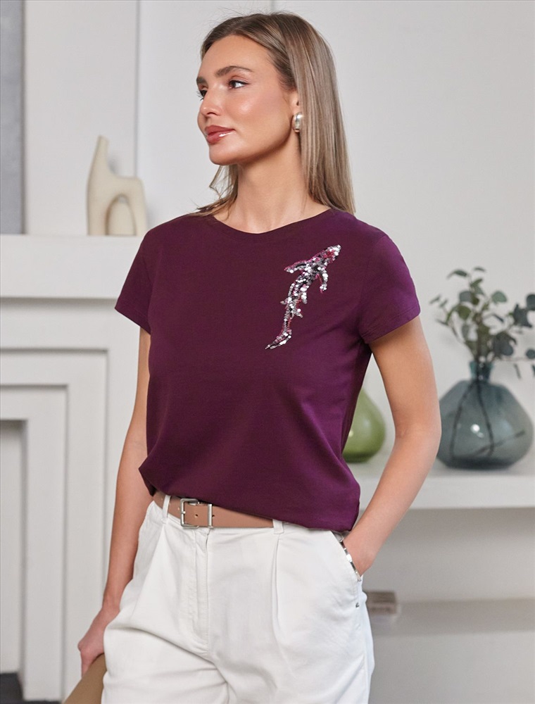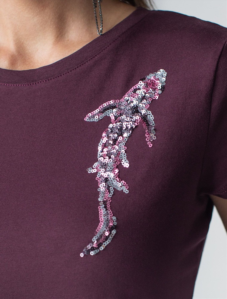 Плотность: 150 Г/м2 Футболка цвета бургунди идеально подходит для вечеринки и создания яркого образа. Оригинальный принт из ярких пайеток в виде рыбки придает изделию шикарный вид, который привлечет внимание на любом мероприятии. Модель с круглым вырезом и классическим коротким рукавом обеспечивает свободу движений и комфорт в носке. Такой фасон изделия подходит на большие размеры, гармонично сидит на фигуре и помогает создать легкий акцент на достоинствах. Аккуратный круглый вырез красиво подчеркивает шею и делает образ элегантным, сохраняя актуальность для разных случаев — от рабочих встреч до вечерних прогулок и праздничных мероприятий. Модель изготовлена из премиального хлопка с добавлением эластана. Добавление эластана в состав изделия способствует формоустойчивости. Эта нарядная футболка подходит для создания образа на каждый день и идеально подойдет на выход. Модель не мнется, что делает ее практичным вариантом для активных женщин, которые ценят стиль и удобство. Женская футболка подчеркнет вашу индивидуальность и позволит вам выглядеть привлекательно в любой ситуации. Легкость в уходе и высокая износостойкость делают ее незаменимой вещью в вашем гардеробе. Благодаря сочному дизайну и качественной отделке, футболка легко сочетается с различными элементами гардероба, позволяя создавать уникальные комплекты для разных случаев. Она станет ярким акцентом в вашем гардеробе и подарит уверенность на любом событии. Такой вариант одежды станет отличной базой для стильного и эффектного образа на праздничное событие, корпоратив, Новый Год. Комментарии к товару