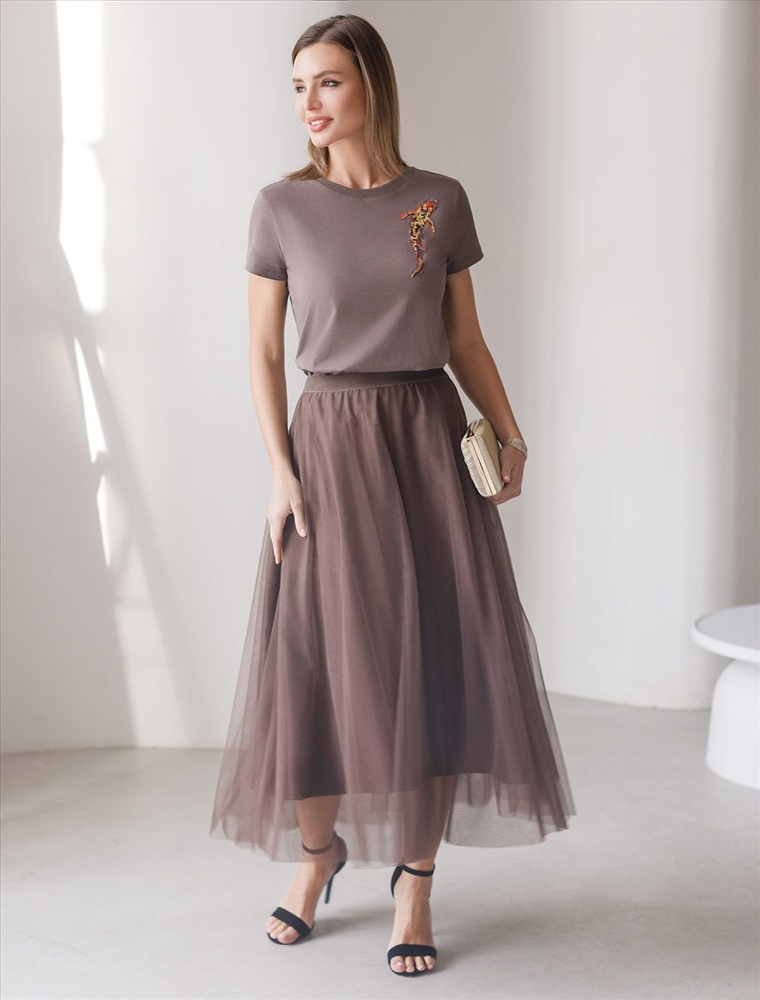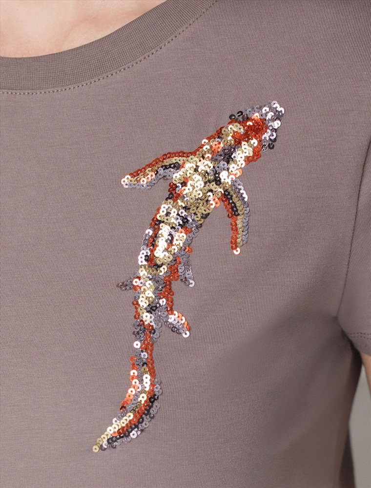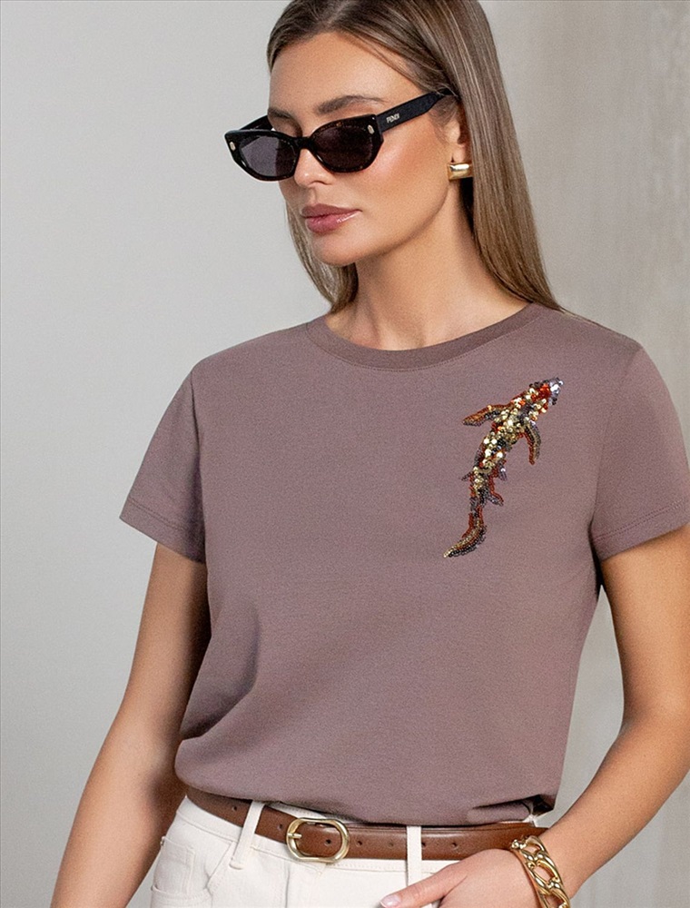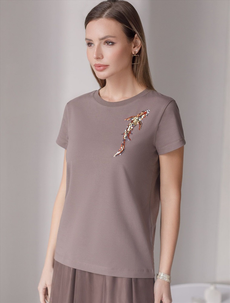 Плотность: 150 Г/м2 Футболка кофейного цвета идеально подходит для вечеринки и создания яркого образа. Оригинальный принт из пайеток в виде рыбки придает изделию шикарный вид, который привлечет внимание на любом мероприятии. Модель с круглым вырезом и классическим коротким рукавом обеспечивает свободу движений и комфорт в носке. Такой фасон изделия подходит на большие размеры, гармонично сидит на фигуре и помогает создать легкий акцент на достоинствах. Аккуратный круглый вырез красиво подчеркивает шею и делает образ элегантным, сохраняя актуальность для разных случаев — от рабочих встреч до вечерних прогулок и праздничных мероприятий. Модель изготовлена из премиального хлопка с добавлением эластана. Добавление эластана в состав изделия способствует формоустойчивости. Эта нарядная футболка подходит для создания образа на каждый день и идеально подойдет на выход. Модель не мнется, что делает ее практичным вариантом для активных женщин, которые ценят стиль и удобство. Женская футболка подчеркнет вашу индивидуальность и позволит вам выглядеть привлекательно в любой ситуации. Легкость в уходе и высокая износостойкость делают ее незаменимой вещью в вашем гардеробе. Благодаря сочному дизайну и качественной отделке, футболка легко сочетается с различными элементами гардероба, позволяя создавать уникальные комплекты для разных случаев. Она станет ярким акцентом в вашем гардеробе и подарит уверенность на любом событии. Такой вариант одежды станет отличной базой для стильного и эффектного образа на праздничное событие, корпоратив, Новый Год. Комментарии к товару