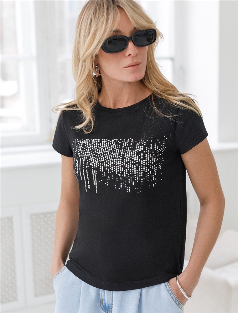 Плотность: 150 Г/м2 Футболка черного цвета идеально подходит для вечеринки и создания яркого образа. Оригинальный блестящий принт из серебристой фольги придает изделию шикарный вид, который привлечет внимание на любом мероприятии. Модель с круглым вырезом и классическим коротким рукавом обеспечивает свободу движений и комфорт в носке. Такой фасон изделия подходит на большие размеры, гармонично сидит на фигуре и помогает создать легкий акцент на достоинствах. Аккуратный круглый вырез красиво подчеркивает шею и делает образ элегантным, сохраняя актуальность для разных случаев — от рабочих встреч до вечерних прогулок и праздничных мероприятий. Модель изготовлена из премиального хлопка с добавлением эластана. Добавление эластана в состав изделия способствует формоустойчивости. Эта нарядная футболка подходит для создания образа на каждый день и идеально подойдет на выход. Модель не мнется, что делает ее практичным вариантом для активных женщин, которые ценят стиль и удобство. Женская футболка подчеркнет вашу индивидуальность и позволит вам выглядеть привлекательно в любой ситуации. Легкость в уходе и высокая износостойкость делают ее незаменимой вещью в вашем гардеробе. Благодаря сочному дизайну и качественной отделке, футболка легко сочетается с различными элементами гардероба, позволяя создавать уникальные комплекты для разных случаев. Она станет ярким акцентом в вашем гардеробе и подарит уверенность на любом событии. Такой вариант одежды станет отличной базой для стильного и эффектного образа на праздничное событие, корпоратив, Новый Год. Комментарии к товару