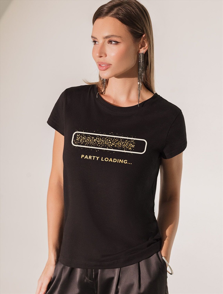 Футболка черного цвета идеально подходит для вечеринки и создания яркого образа. Оригинальный принт из золотистой фольги придает изделию шикарный вид, который привлечет внимание на любом мероприятии. Модель с круглым вырезом и классическим коротким рукавом обеспечивает свободу движений и комфорт в носке. Такой фасон изделия подходит на большие размеры, гармонично сидит на фигуре и помогает создать легкий акцент на достоинствах. Аккуратный круглый вырез красиво подчеркивает шею и делает образ элегантным, сохраняя актуальность для разных случаев — от рабочих встреч до вечерних прогулок и праздничных мероприятий.