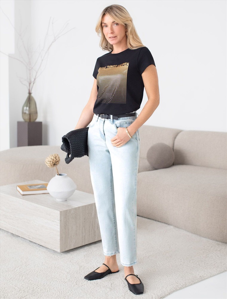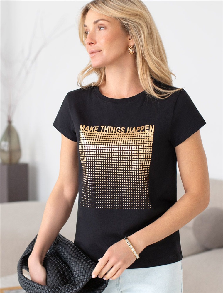 Футболка черного цвета идеально подходит для вечеринки и создания яркого образа. Оригинальный принт из фольги золотистого цвета придает изделию шикарный вид, который привлечет внимание на любом мероприятии. Модель с круглым вырезом и классическим коротким рукавом обеспечивает свободу движений и комфорт в носке. Такой фасон изделия подходит на большие размеры, гармонично сидит на фигуре и помогает создать легкий акцент на достоинствах. Аккуратный круглый вырез красиво подчеркивает шею и делает образ элегантным, сохраняя актуальность для разных случаев — от рабочих встреч до вечерних прогулок и праздничных мероприятий.