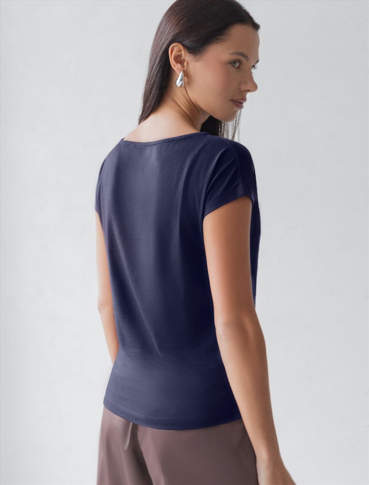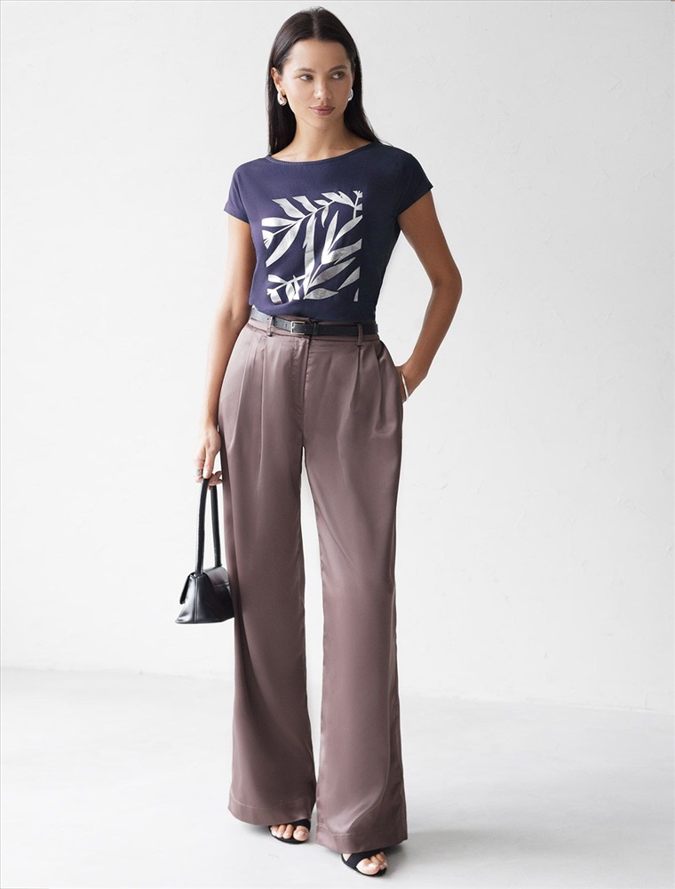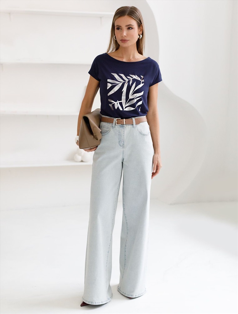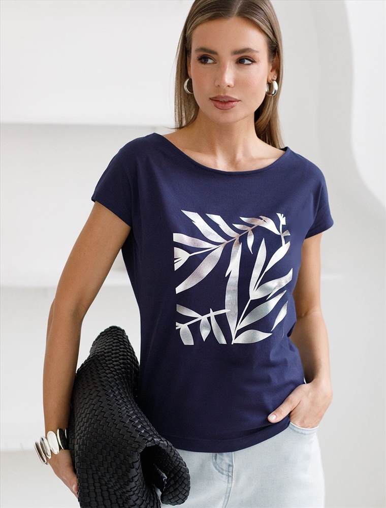 Плотность: 150 Г/м2 Футболка темно-синего цвета идеально подходит для вечеринки и создания яркого образа. Оригинальный блестящий принт из фольги серебристого цвета в виде листиков придает изделию шикарный вид, который привлечет внимание на любом мероприятии. Модель с вырезом лодочка и цельнокроеным коротким рукавом обеспечивает свободу движений и комфорт в носке. Такой фасон изделия подходит на большие размеры, гармонично сидит на фигуре и помогает создать легкий акцент на достоинствах. Аккуратный вырез лодочка красиво подчеркивает шею и делает образ элегантным, сохраняя актуальность для разных случаев — от рабочих встреч до вечерних прогулок и праздничных мероприятий. Модель изготовлена из премиального хлопка с добавлением эластана. Добавление эластана в состав изделия способствует формоустойчивости. Эта нарядная футболка подходит для создания образа на каждый день и идеально подойдет на выход. Модель не мнется, что делает ее практичным вариантом для активных женщин, которые ценят стиль и удобство. Женская футболка подчеркнет вашу индивидуальность и позволит вам выглядеть привлекательно в любой ситуации. Легкость в уходе и высокая износостойкость делают ее незаменимой вещью в вашем гардеробе. Благодаря сочному дизайну и качественной отделке, футболка легко сочетается с различными элементами гардероба, позволяя создавать уникальные комплекты для разных случаев. Она станет ярким акцентом в вашем гардеробе и подарит уверенность на любом событии. Такой вариант одежды станет отличной базой для стильного и эффектного образа на праздничное событие, корпоратив, Новый Год. Комментарии к товару