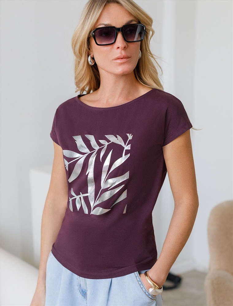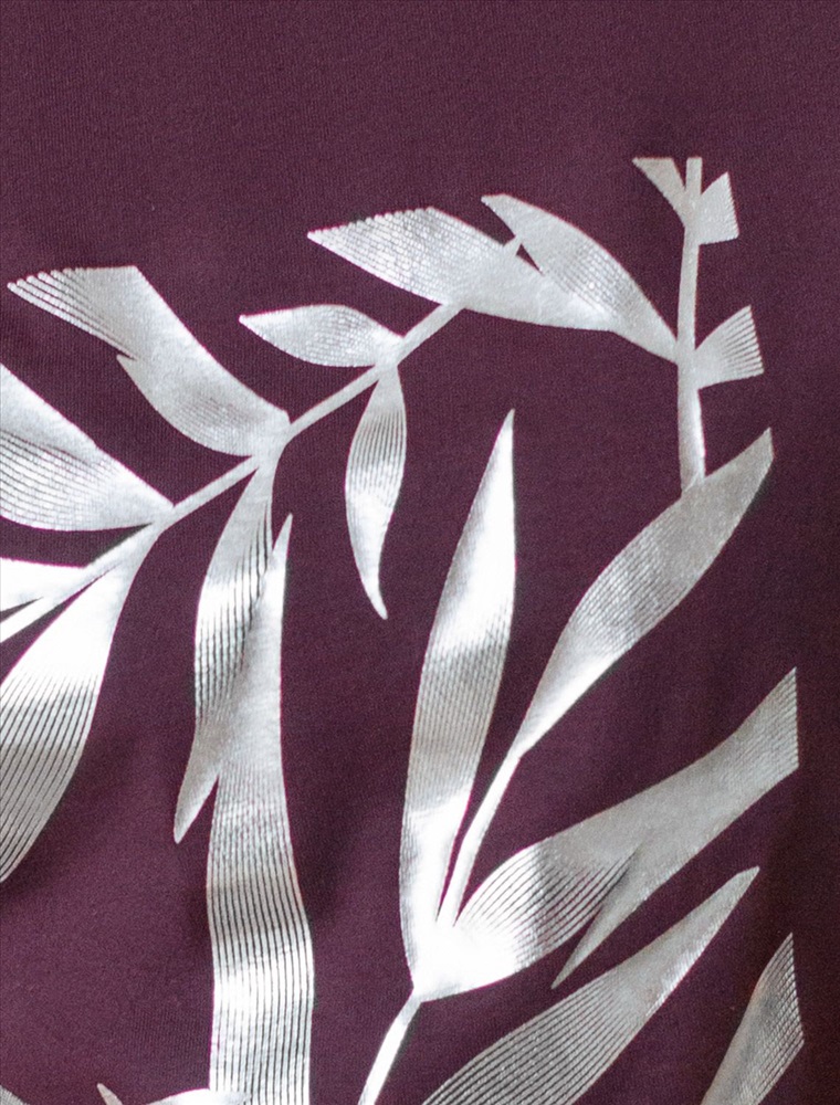 Футболка цвета бургунди идеально подходит для вечеринки и создания яркого образа. Оригинальный блестящий принт из устойчивой фольги в виде серебристых листиков придает изделию шикарный вид, который привлечет внимание на любом мероприятии. Модель с вырезом лодочка и цельнокроеным коротким рукавом обеспечивает свободу движений и комфорт в носке. Такой фасон изделия подходит на большие размеры, гармонично сидит на фигуре и помогает создать легкий акцент на достоинствах. Аккуратный вырез лодочка красиво подчеркивает шею и делает образ элегантным, сохраняя актуальность для разных случаев — от рабочих встреч до вечерних прогулок и праздничных мероприятий.