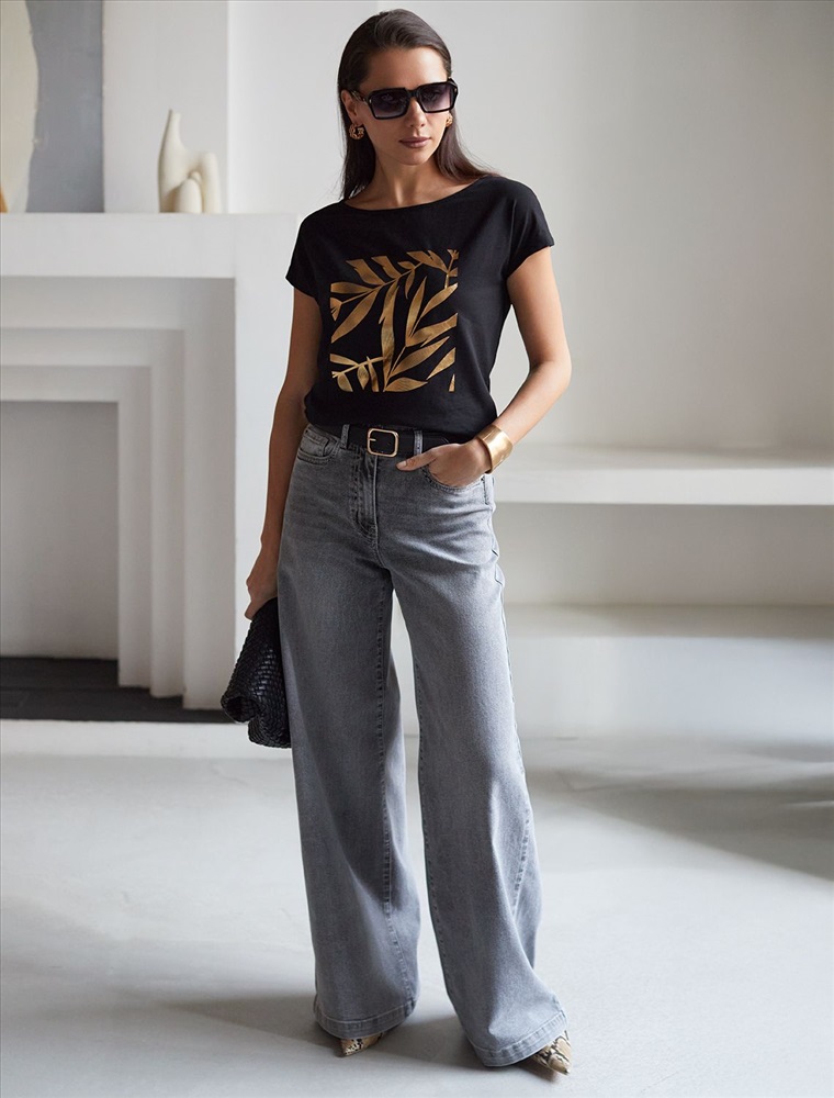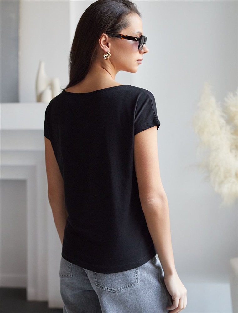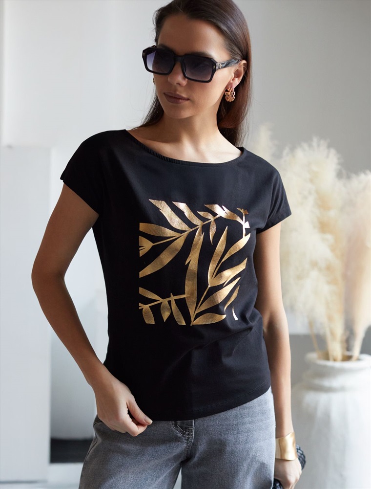 Плотность: 150 Г/м2 Футболка черного цвета идеально подходит для вечеринки и создания яркого образа. Оригинальный блестящий принт из устойчивой фольги в виде золотых листиков придает изделию шикарный вид, который привлечет внимание на любом мероприятии. Модель с вырезом лодочка и цельнокроеным коротким рукавом обеспечивает свободу движений и комфорт в носке. Такой фасон изделия подходит на большие размеры, гармонично сидит на фигуре и помогает создать легкий акцент на достоинствах. Аккуратный вырез лодочка красиво подчеркивает шею и делает образ элегантным, сохраняя актуальность для разных случаев — от рабочих встреч до вечерних прогулок и праздничных мероприятий. Модель изготовлена из премиального хлопка с добавлением эластана. Добавление эластана в состав изделия способствует формоустойчивости. Эта нарядная футболка подходит для создания образа на каждый день и идеально подойдет на выход. Модель не мнется, что делает ее практичным вариантом для активных женщин, которые ценят стиль и удобство. Женская футболка подчеркнет вашу индивидуальность и позволит вам выглядеть привлекательно в любой ситуации. Легкость в уходе и высокая износостойкость делают ее незаменимой вещью в вашем гардеробе. Благодаря сочному дизайну и качественной отделке, футболка легко сочетается с различными элементами гардероба, позволяя создавать уникальные комплекты для разных случаев. Она станет ярким акцентом в вашем гардеробе и подарит уверенность на любом событии. Такой вариант одежды станет отличной базой для стильного и эффектного образа на праздничное событие, корпоратив, Новый Год. Комментарии к товару