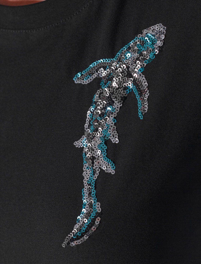 Футболка черного цвета идеально подходит для вечеринки и создания яркого образа. Оригинальный принт из серебристых пайеток в виде рыбки придает изделию шикарный вид, который привлечет внимание на любом мероприятии. Модель с круглым вырезом и классическим коротким рукавом обеспечивает свободу движений и комфорт в носке. Такой фасон изделия подходит на большие размеры, гармонично сидит на фигуре и помогает создать легкий акцент на достоинствах. Аккуратный круглый вырез красиво подчеркивает шею и делает образ элегантным, сохраняя актуальность для разных случаев — от рабочих встреч до вечерних прогулок и праздничных мероприятий.