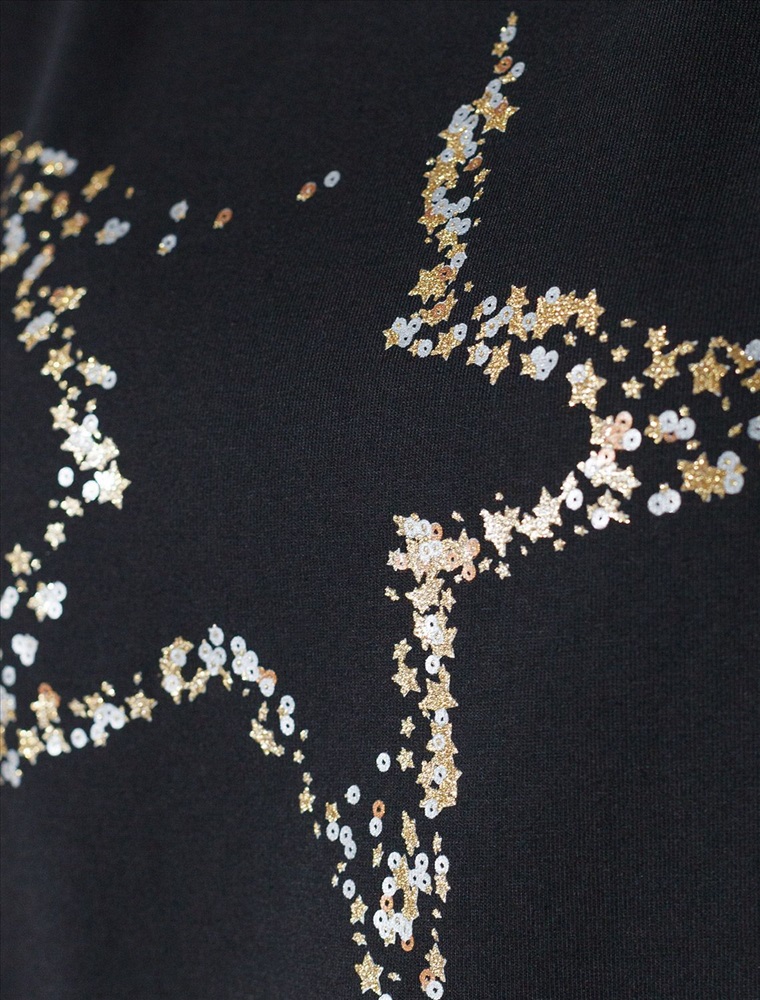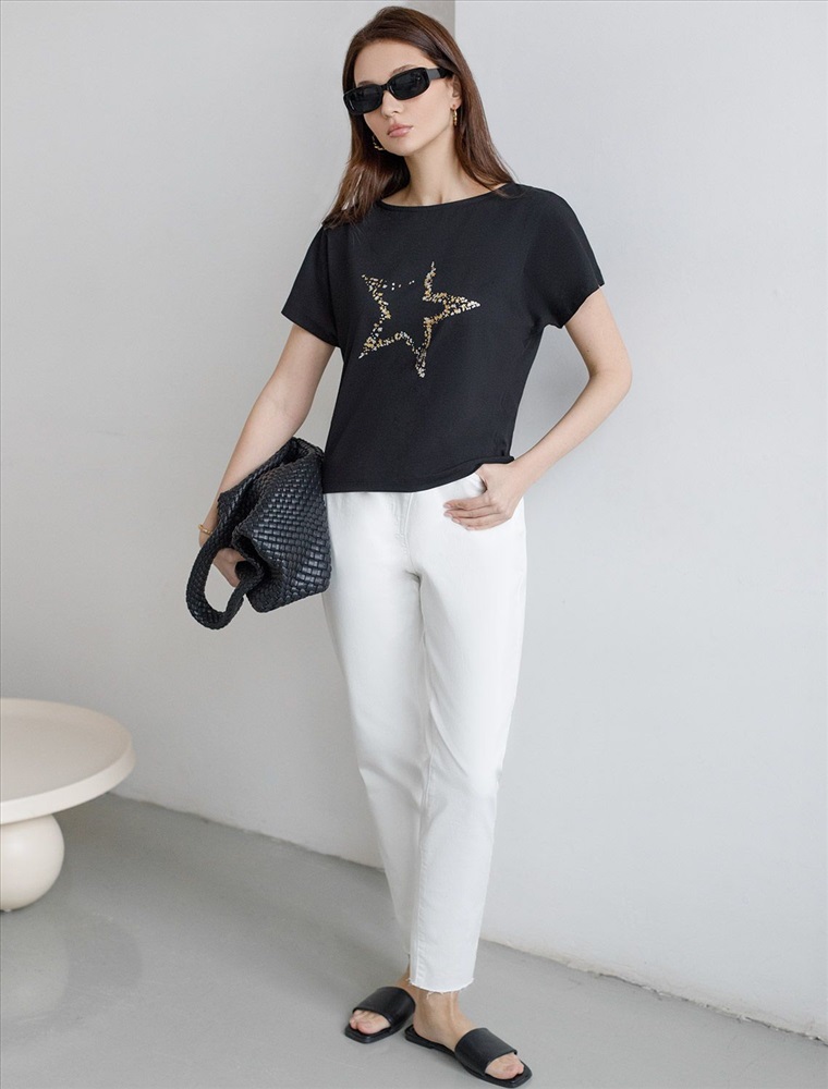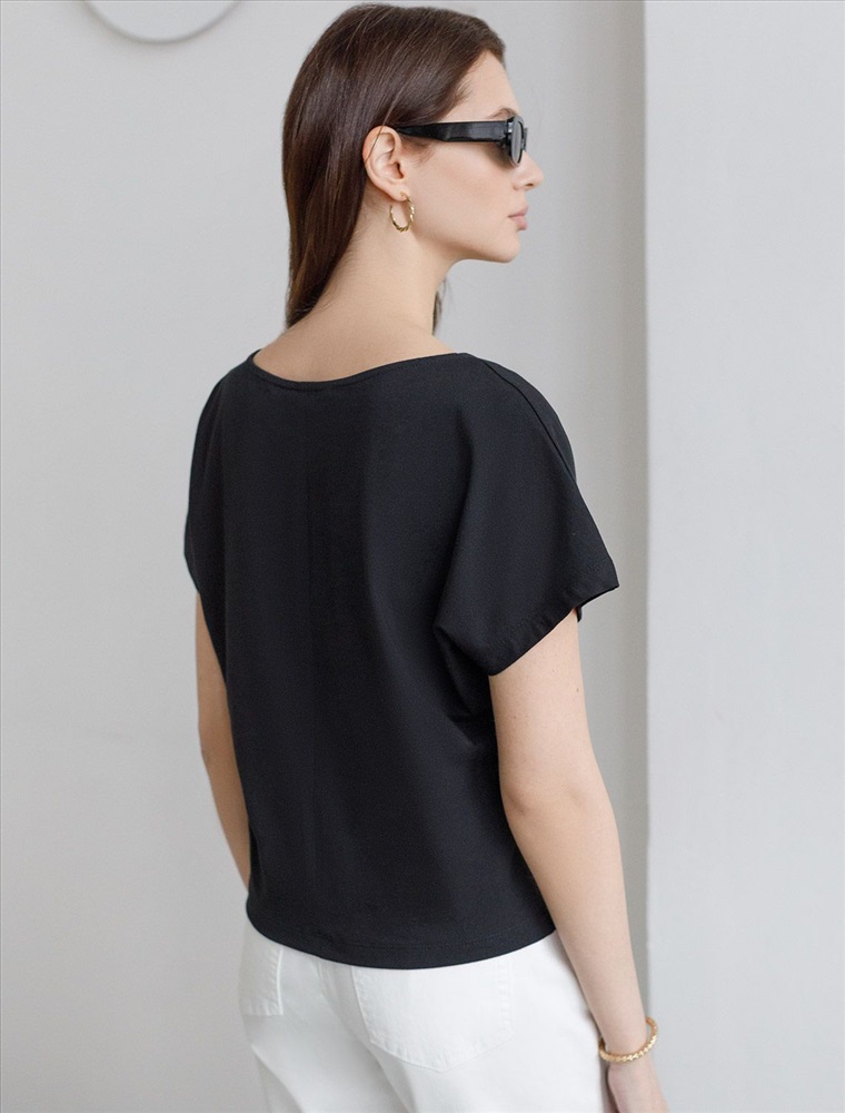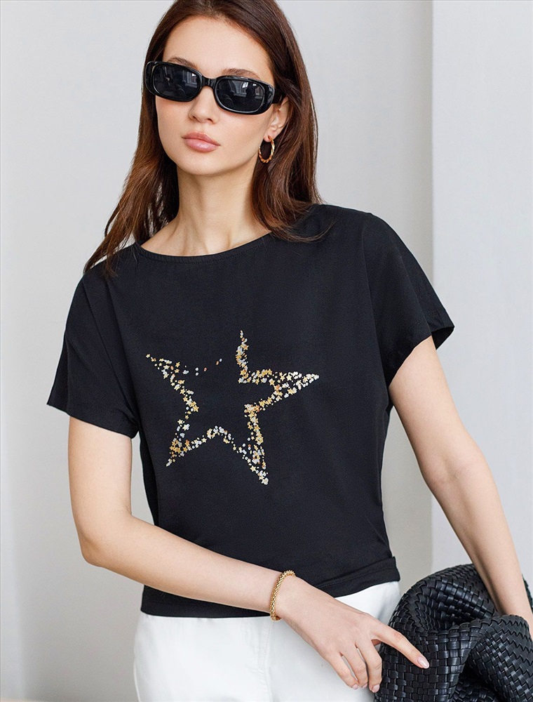 Плотность: 150 Г/м2 Футболка черного цвета идеально подходит для вечеринки и создания яркого образа. Оригинальный блестящий принт из фольги в виде звезды придает изделию шикарный вид, который привлечет внимание на любом мероприятии. Модель с вырезом лодочка и цельнокроеным рукавом обеспечивает свободу движений и комфорт в носке. Такой фасон изделия подходит на большие размеры, гармонично сидит на фигуре и помогает создать легкий акцент на достоинствах. Благодаря особенностям кроя с цельнокроеным рукавом удается искусно скроет любые возможные недостатки в области плеч и рук, обеспечивая комфортное прилегание без ощущения скованности. Аккуратный вырез лодочка красиво подчеркивает шею и делает образ элегантным, сохраняя актуальность для разных случаев — от рабочих встреч до вечерних прогулок и праздничных мероприятий. Модель изготовлена из премиального хлопка с добавлением эластана. Добавление эластана в состав изделия способствует формоустойчивости. Эта нарядная футболка подходит для создания образа на каждый день и идеально подойдет на выход. Модель не мнется, что делает ее практичным вариантом для активных женщин, которые ценят стиль и удобство. Женская футболка подчеркнет вашу индивидуальность и позволит вам выглядеть привлекательно в любой ситуации. Легкость в уходе и высокая износостойкость делают ее незаменимой вещью в вашем гардеробе. Благодаря сочному дизайну и качественной отделке, футболка легко сочетается с различными элементами гардероба, позволяя создавать уникальные комплекты для разных случаев. Она станет ярким акцентом в вашем гардеробе и подарит уверенность на любом событии. Такой вариант одежды станет отличной базой для стильного и эффектного образа на праздничное событие, корпоратив, Новый Год. Комментарии к товару