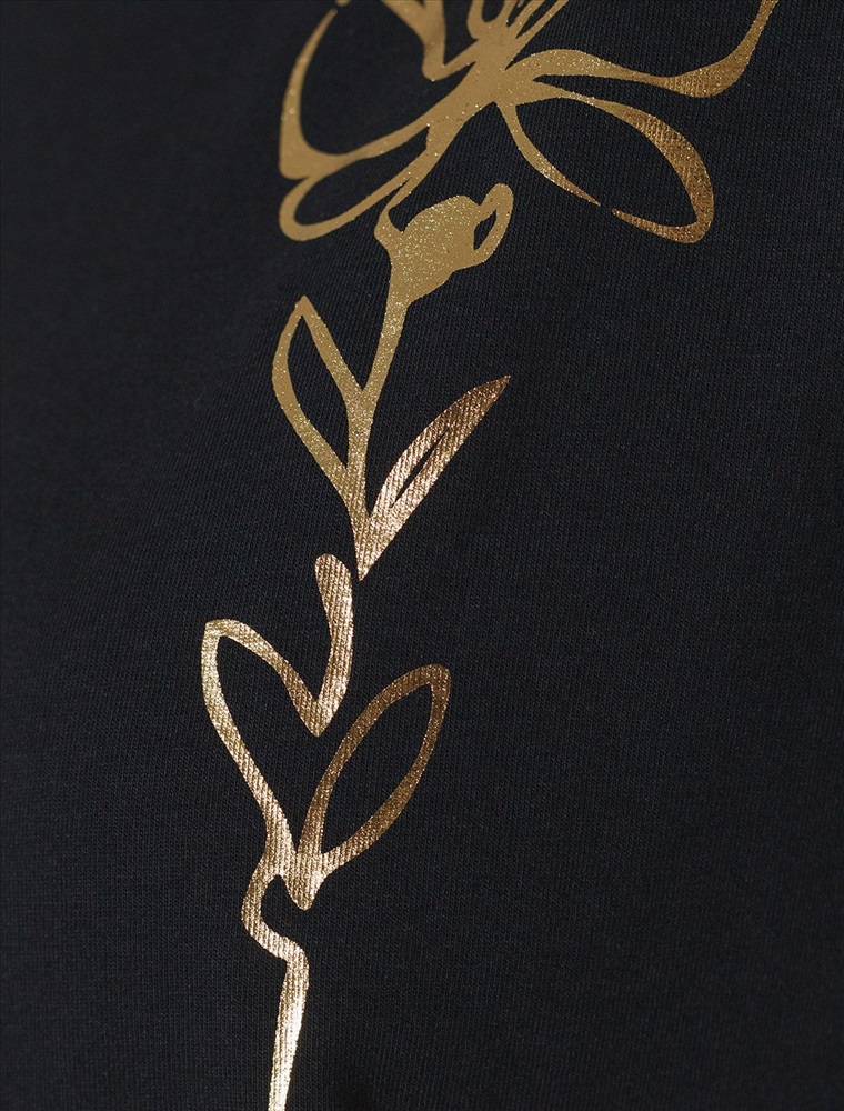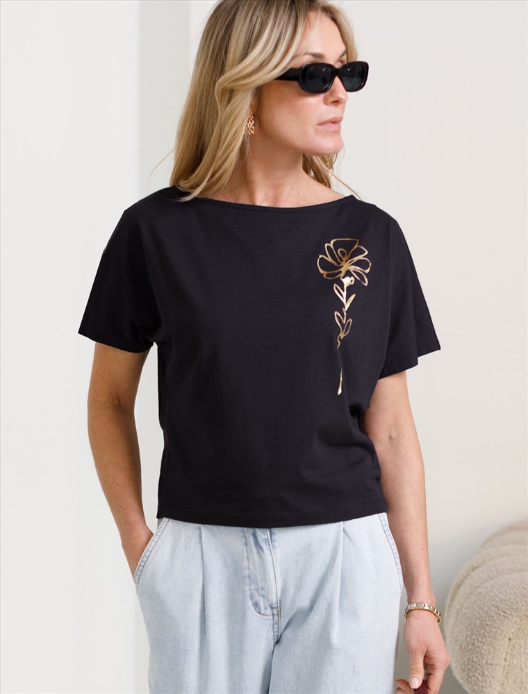 Футболка черного цвета идеально подходит для вечеринки и создания яркого образа. Оригинальный блестящий принт из фольги в виде цветка придает изделию шикарный вид, который привлечет внимание на любом мероприятии. Модель с вырезом лодочка и цельнокроеным рукавом обеспечивает свободу движений и комфорт в носке. Такой фасон изделия подходит на большие размеры, гармонично сидит на фигуре и помогает создать легкий акцент на достоинствах. Благодаря особенностям кроя с цельнокроеным рукавом удается искусно скроет любые возможные недостатки в области плеч и рук, обеспечивая комфортное прилегание без ощущения скованности. Аккуратный вырез лодочка красиво подчеркивает шею и делает образ элегантным, сохраняя актуальность для разных случаев — от рабочих встреч до вечерних прогулок и праздничных мероприятий.