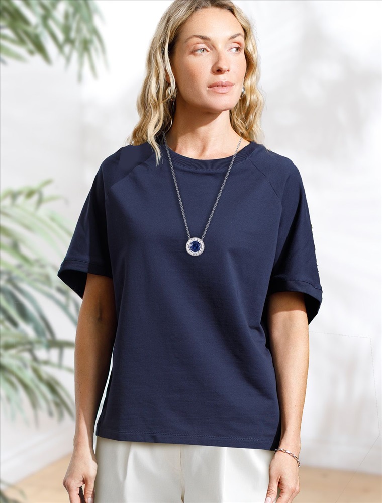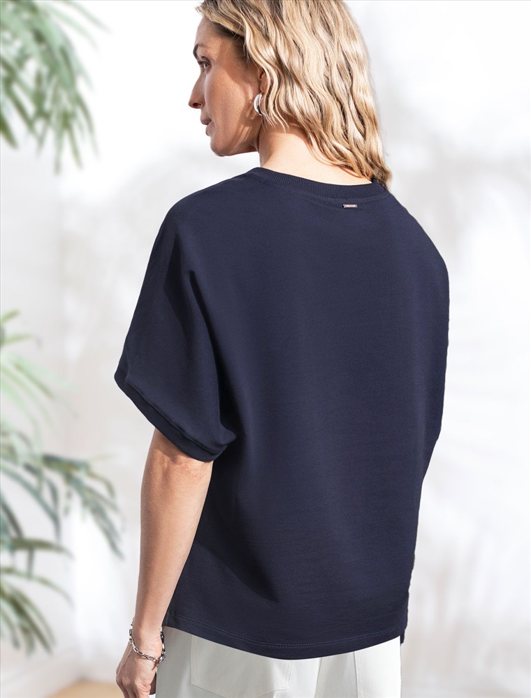 Футболка темно-синего цвета свободного кроя выполнена из премиального футера двухнитки с эластаном плотностью 240 Г/м2. . Натуральный материал отличается мягкостью и приятной текстурой, позволяя коже дышать и обеспечивая максимальное удобство при носке. Наличие эластана в составе изделия гарантирует абсолютный комфорт и формоустойчивость. Круглый ворот, рукава регланы средней длины и спущенная линия плеча придают футболке стильный и современный вид, делают образ расслабленным и непринужденным, такой вариант отлично сядет на большие размеры. Плотная футболка идеально подходит для повседневной носки и незаменима для тех, кто ценит удобство и свободу движений без компромиссов по стилю.