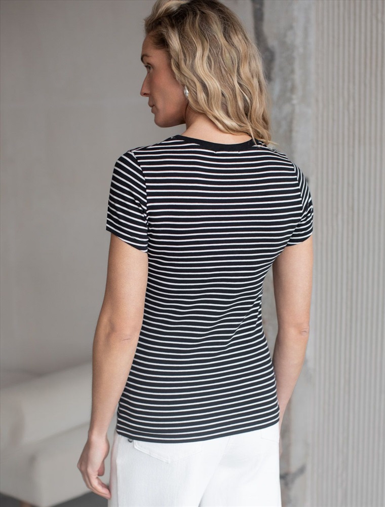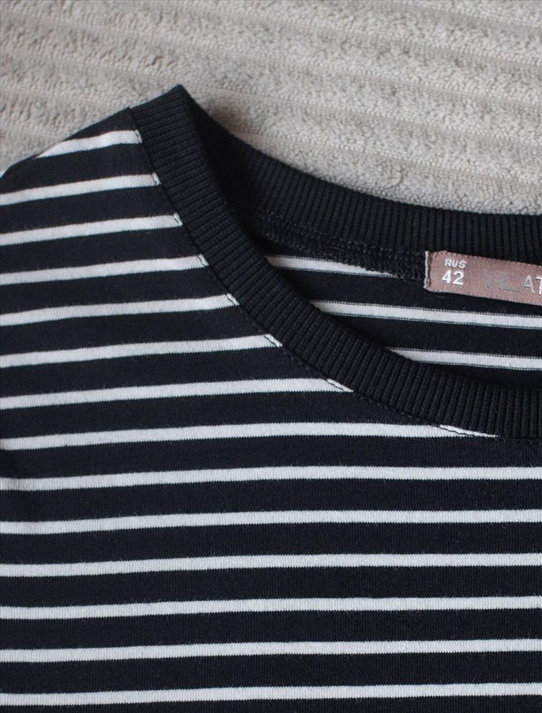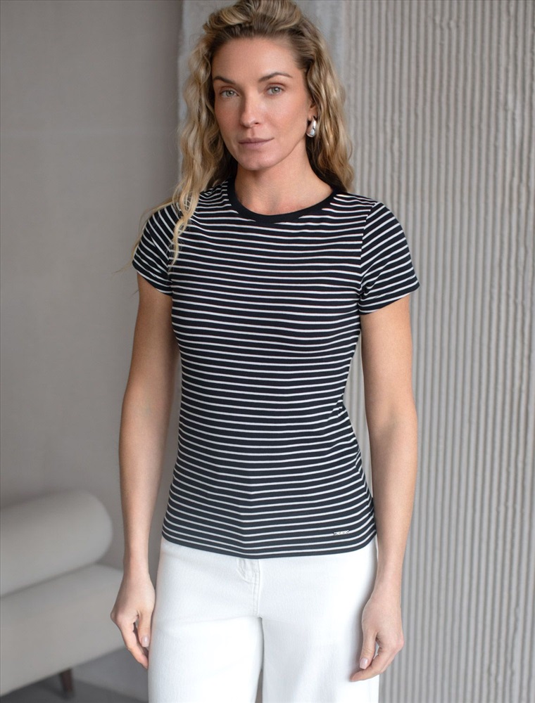 Стильная и модная женская футболка в тонкую черно-белую полоску станет отличным дополнением к вашему гардеробу. Футболка плотностью 170 Г/м2 изготовлена из премиального хлопка с добавлением эластана. Добавление эластана в состав изделия способствует формоустойчивости. Эта классическая футболка подходит для создания кэжуал образа на каждый день и идеально подойдет для работы. Модель не мнется, что делает ее практичным вариантом для активных женщин, которые ценят стиль и удобство. Благодаря современному принту полоска эта футболка легко комбинируется с различными элементами гардероба. Она станет универсальным решением для тех, кто предпочитает комфортный стиль casual. Повседневная футболка подчеркнет вашу индивидуальность и позволит вам выглядеть привлекательно в любой ситуации. Легкость в уходе и высокая износостойкость делают ее незаменимой вещью в вашем гардеробе. Одевайте эту модель как на работу, так и на встречу с друзьями — она всегда будет уместна! Стильная и практичная модель с простым кроем и лаконичным дизайном - идеальный вариант для тех, кто ценит качество, минимализм и классический стиль в одежде.