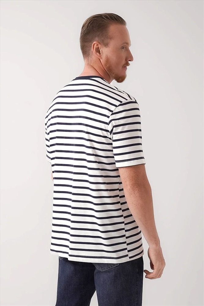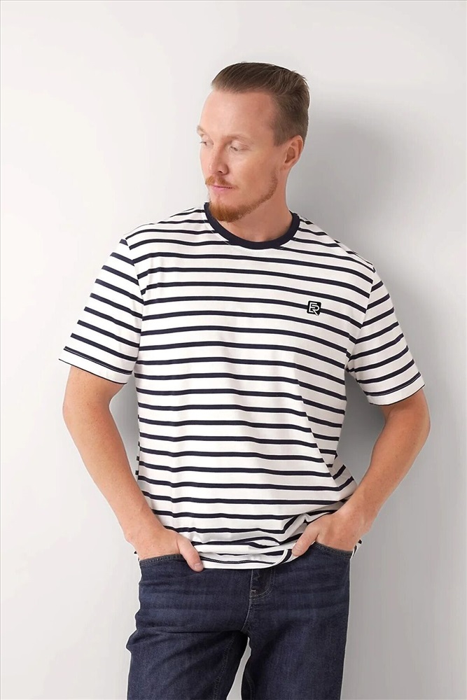 ID товара: 1200138 Состав: 100% Хлопок Сезон: Демисезон Длина: Средняя Фасон: Свободный Рукав: Короткие Вырез горловины: Округлый Рисунок: Полоски Декоративные элементы: Принт Основная ткань: Хлопок Стиль: Повседневный Страна бренда: Россия Страна производства: Россия Футболка с круглой горловиной из хлопкового полотна с дизайнерским принтом, увеличенного объема. Данная модель прекрасно впишется в любой гардероб и составит образ с брюками или джинсами. Комментарии к товару