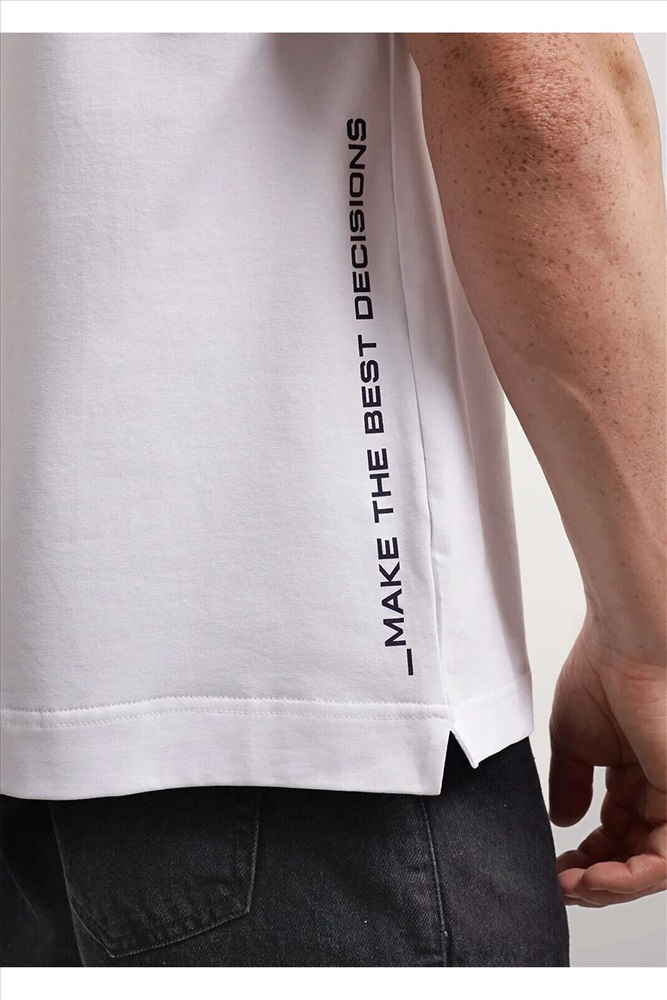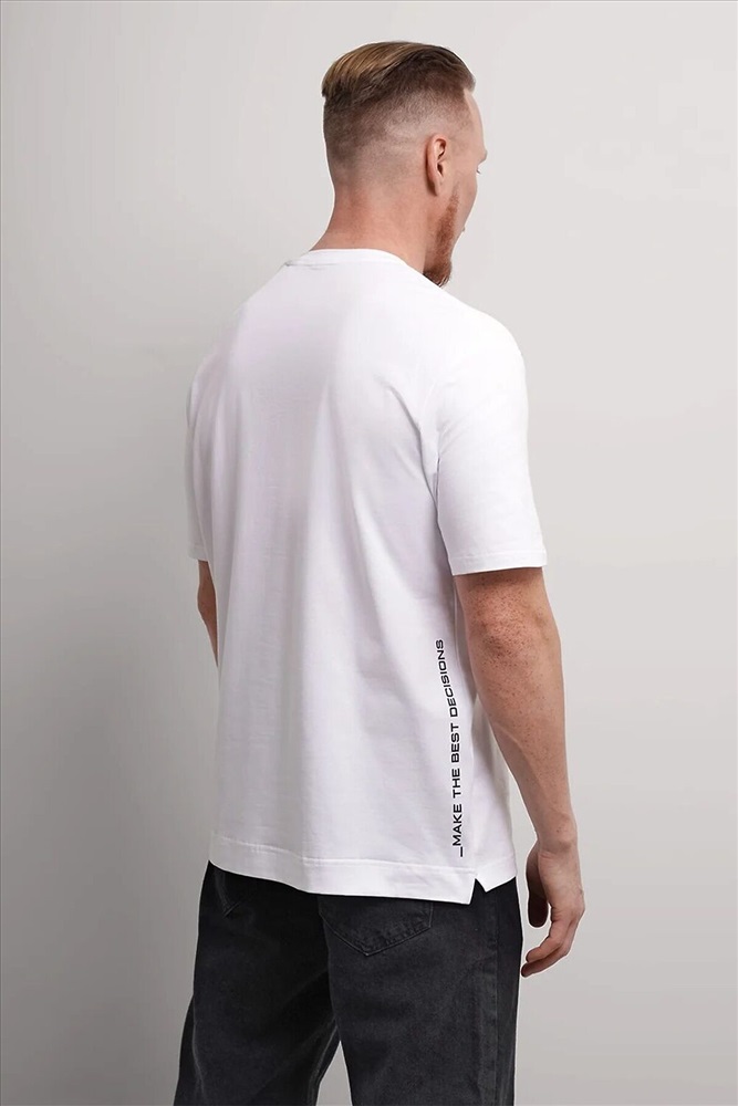 Футболка из трикотажного полотна. С коротким рукавом, круглой горловиной, боковыми разрезами и удлиненной спинкой. Дополнена имиджевым принтом. Отличный вариант для встреч с друзьями и прогулок.