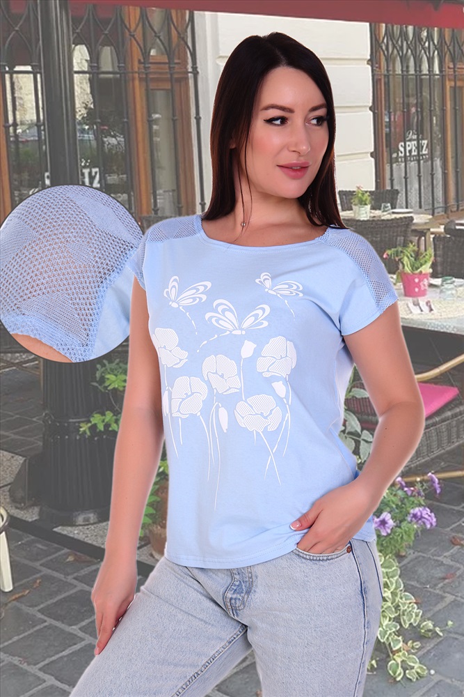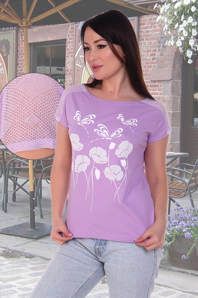 Стиль: молодежный | пляжный | повседневный Футболка женская с принтом из комбинированного трикотажа - кулирки и ажурного трикотажа. Футболка слегка приталенная, горловина в виде лодочки, спущенная пройма, на плечах кокетка - погоны из ажурного трикотажа. Низ спинки удлинён и слегка закруглён. Футболка из натурального 100% хлопка - комфортная, приятная к телу, подойдёт как для повседневного гардероба, так и для активного отдыха.